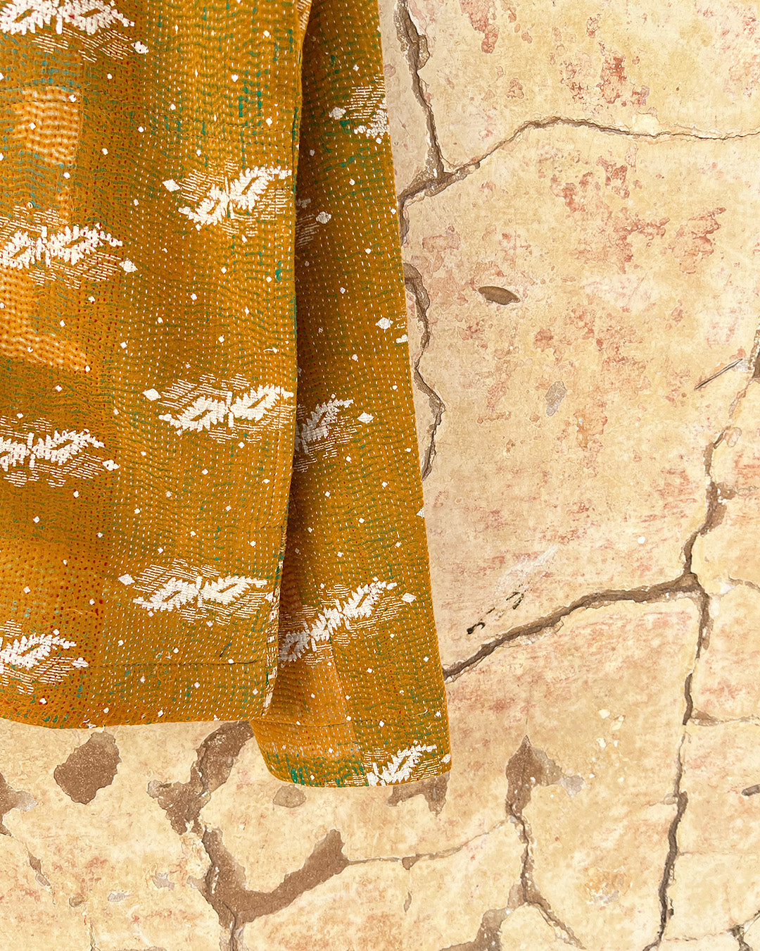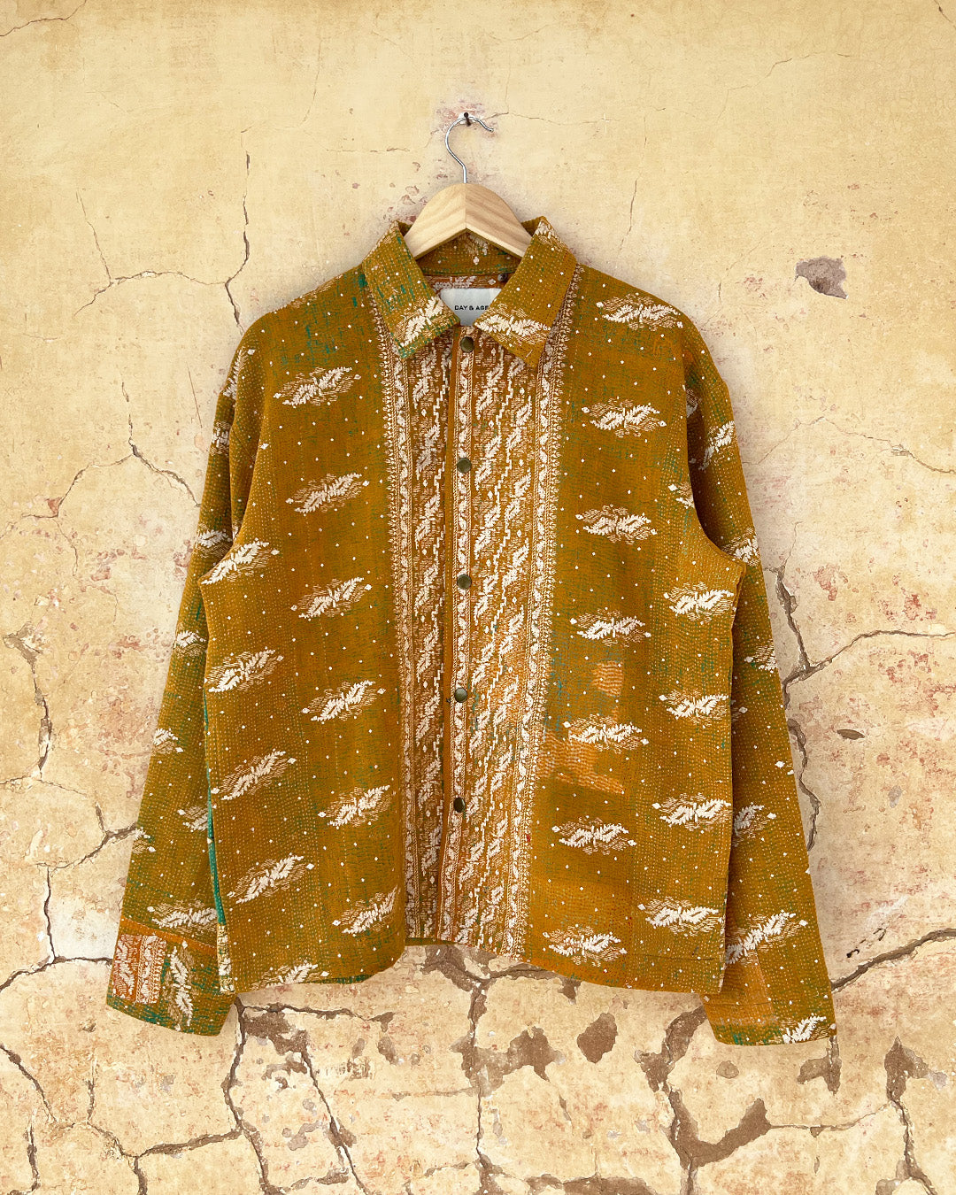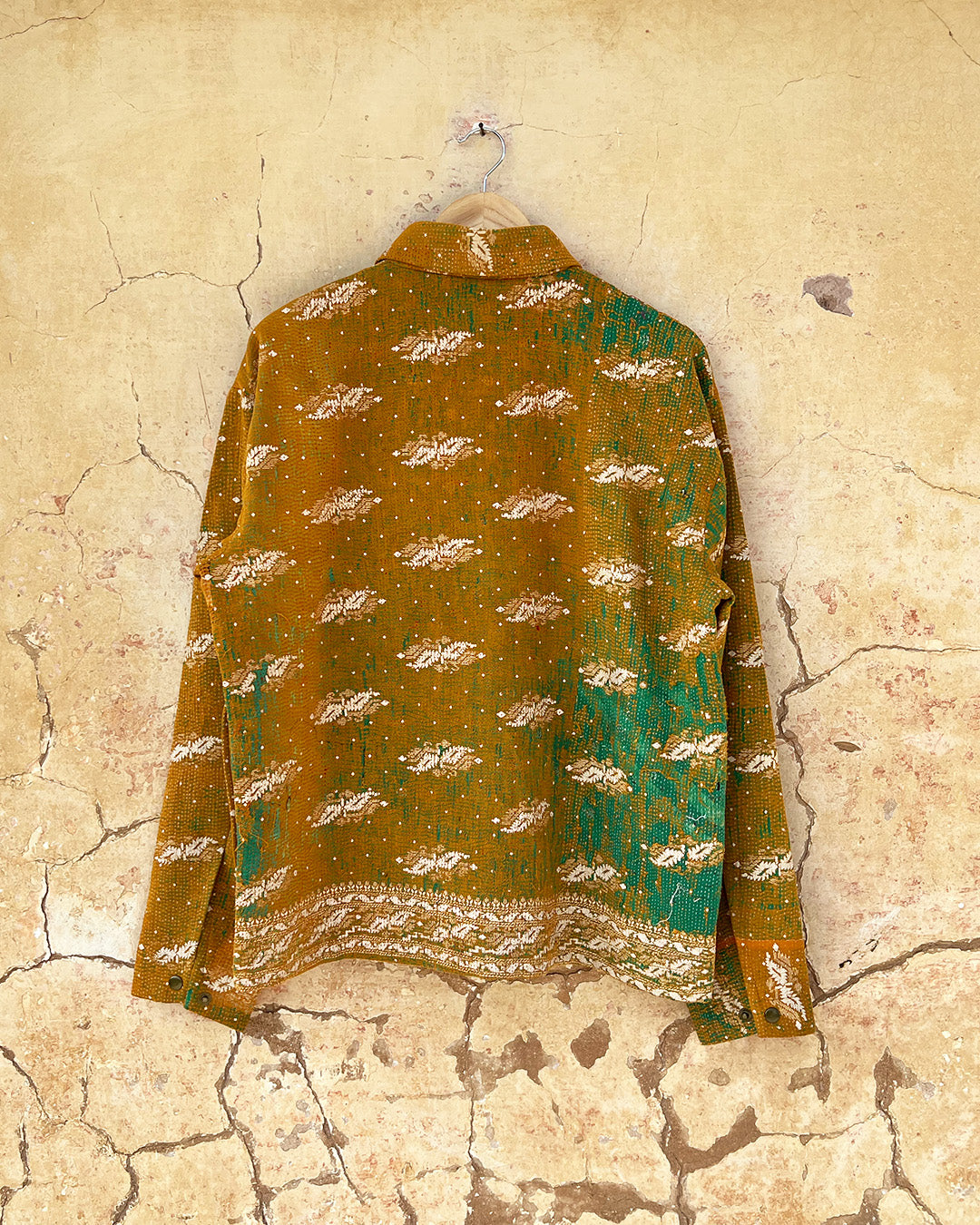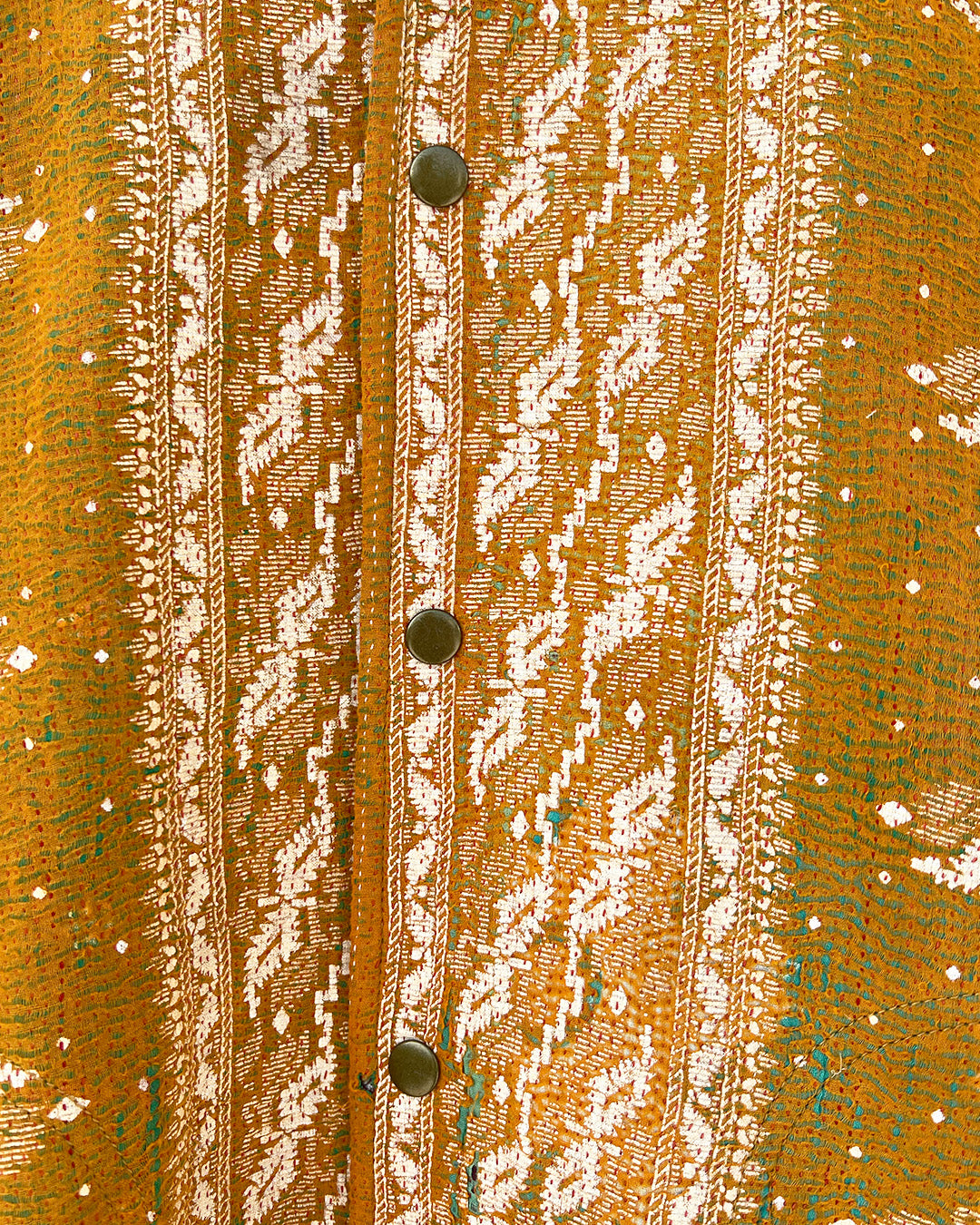 Kantha quilts are crafted from repurposed saris and fabrics and feature repairs, darning, and patchwork. These unique details not only add character but ensure durable, one-of-a-kind garments with a rich up-cycling heritage. We embrace the distressed patches alongside the intricate stitch work in the most unlikely colours.