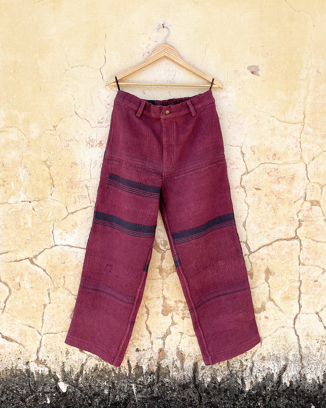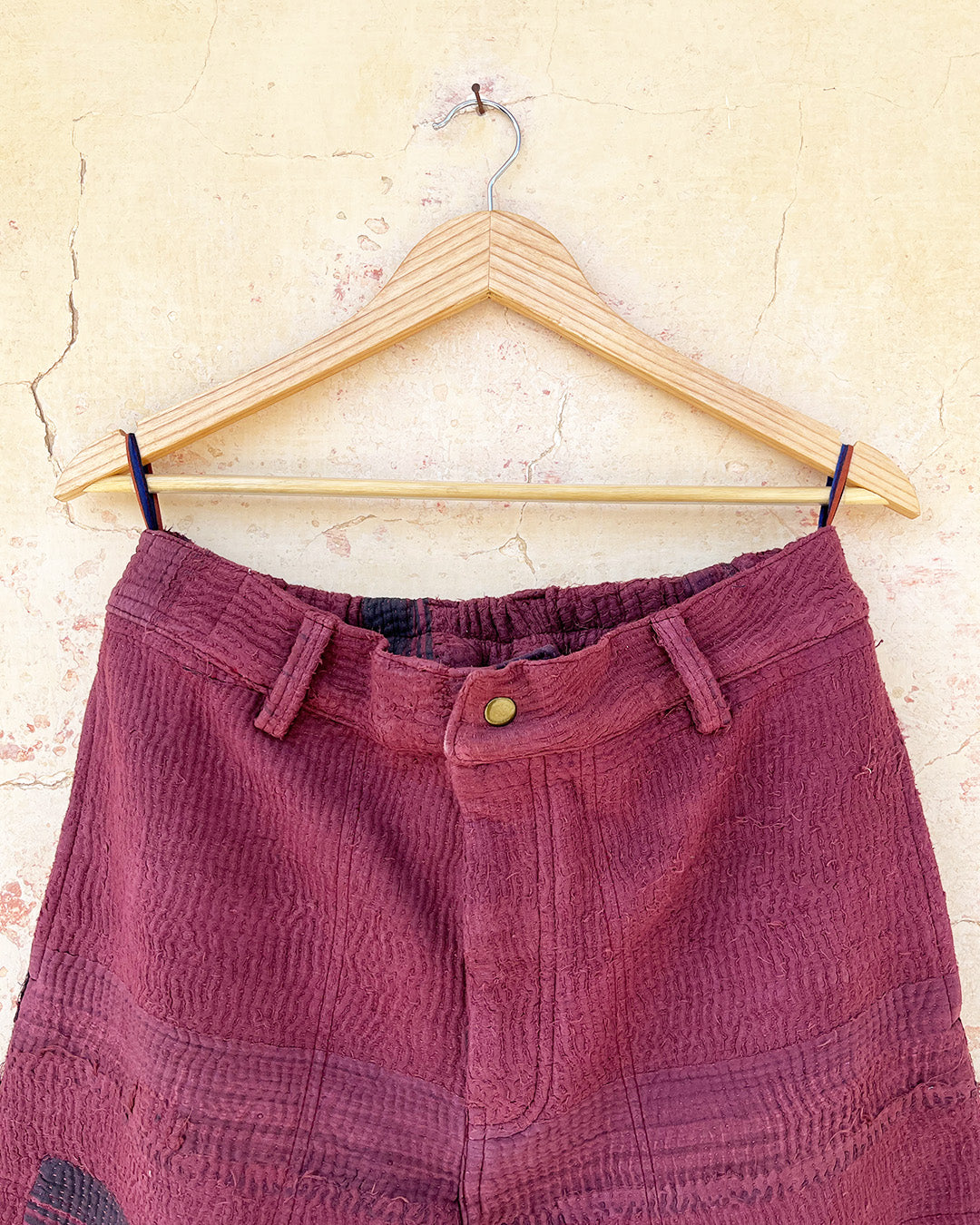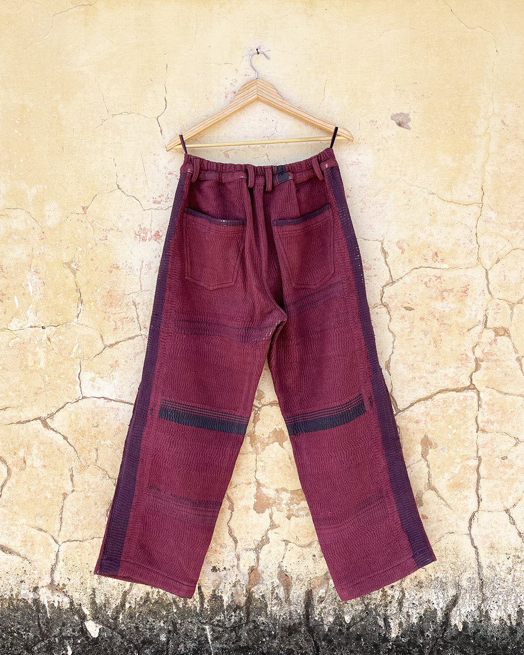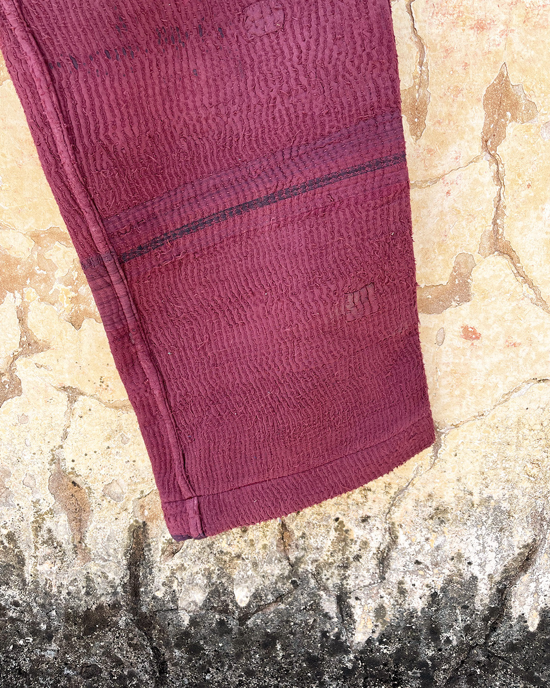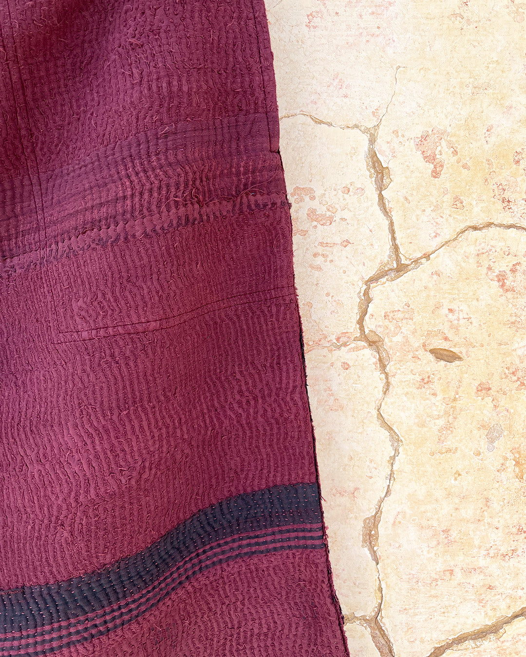 Kantha quilts are crafted from repurposed saris and fabrics and feature repairs, darning, and patchwork. These unique details not only add character but ensure durable, one-of-a-kind garments with a rich up-cycling heritage. We embrace the distressed patches alongside the intricate stitch work in the most unlikely colours.