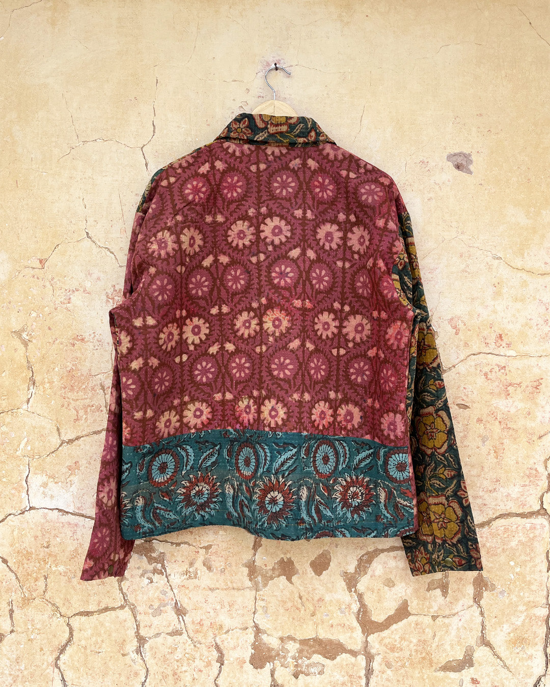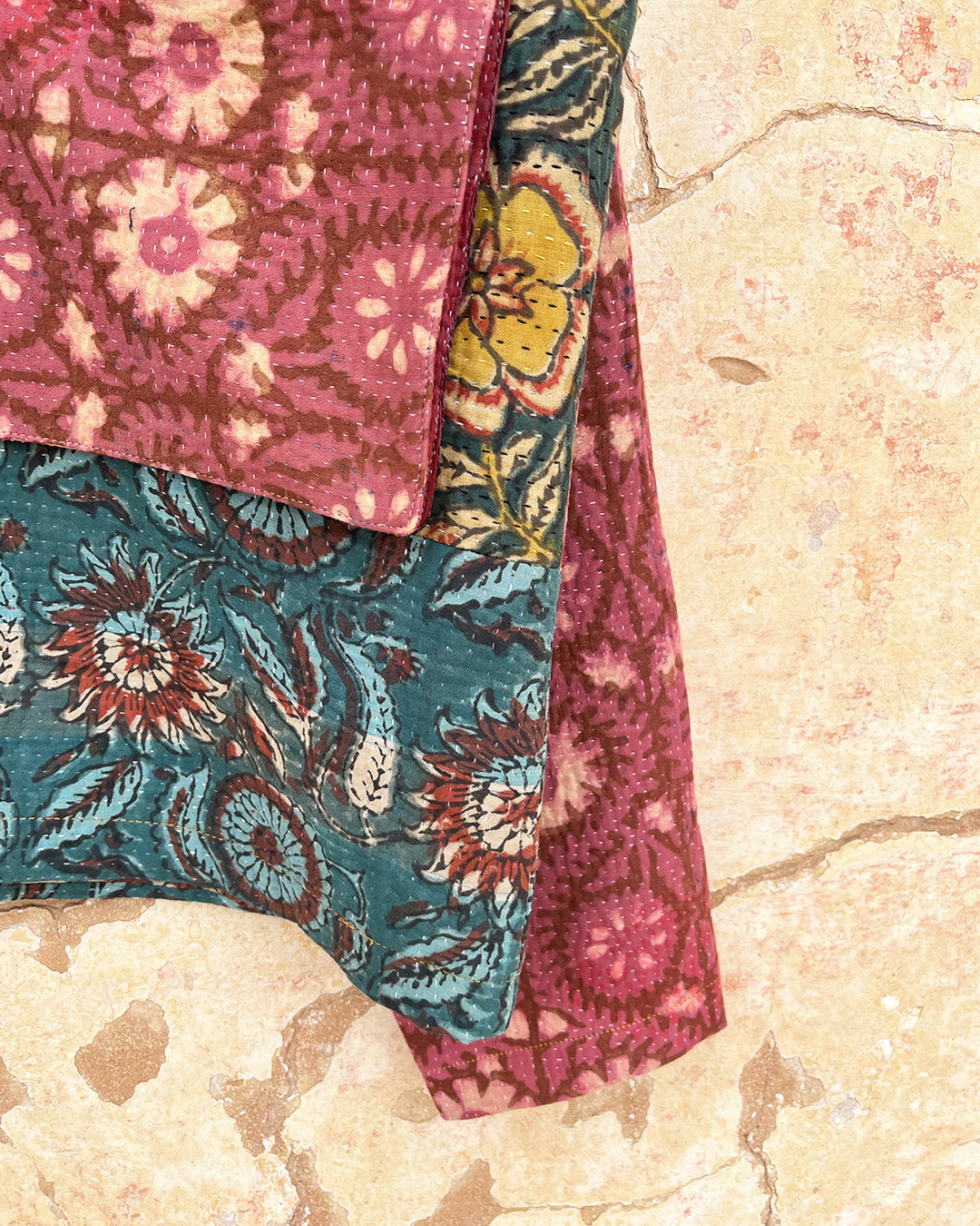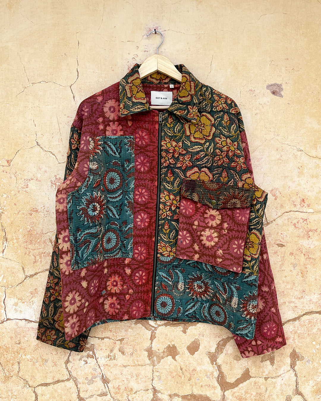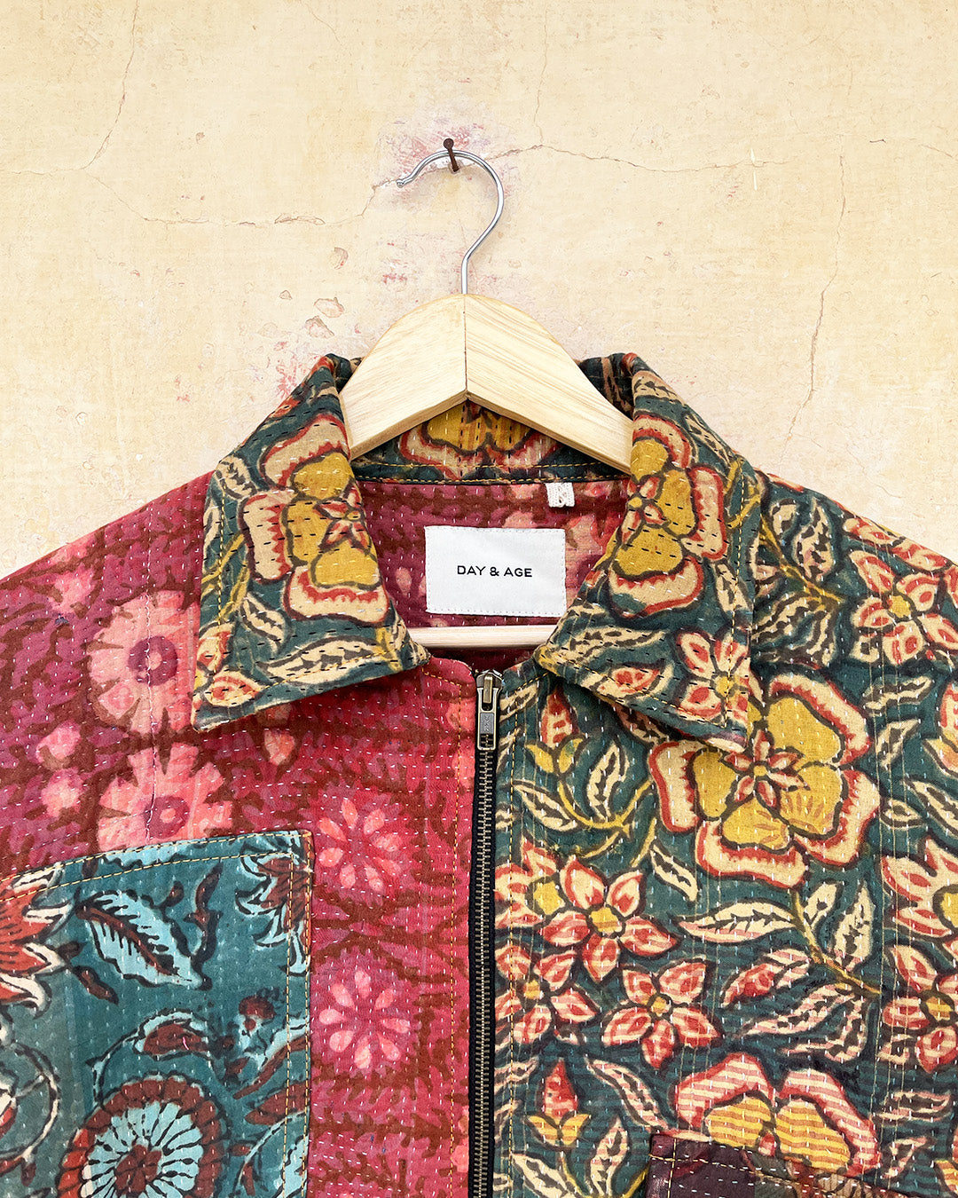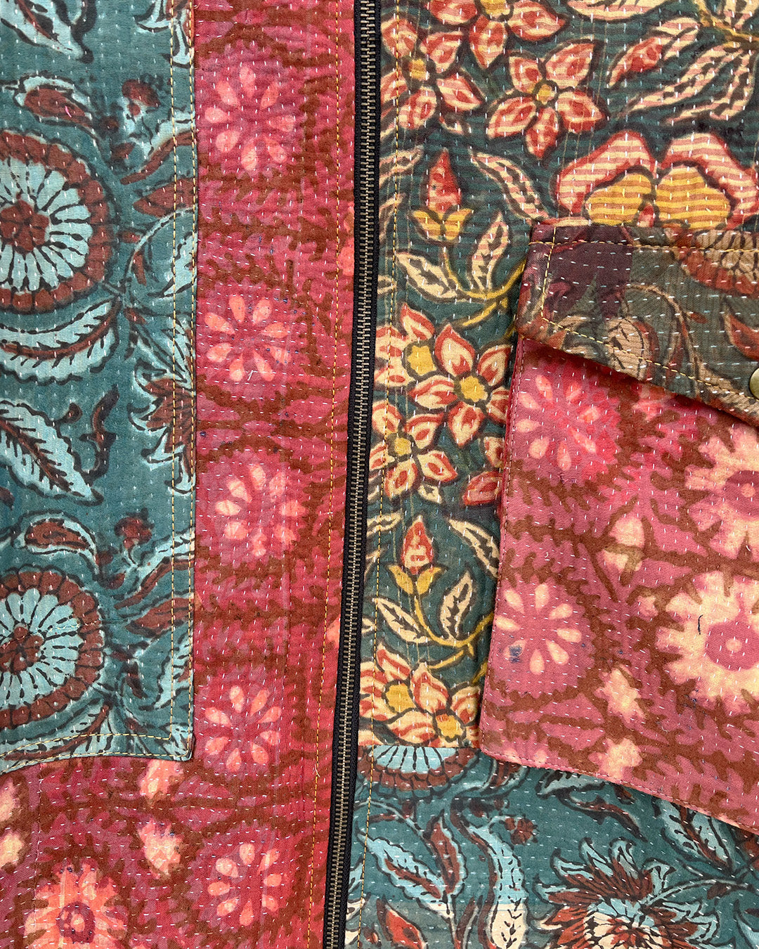 Kantha quilts are crafted from repurposed saris and fabrics and feature repairs, darning, and patchwork. These unique details not only add character but ensure durable, one-of-a-kind garments with a rich up-cycling heritage. We embrace the distressed patches alongside the intricate stitch work in the most unlikely colours.
