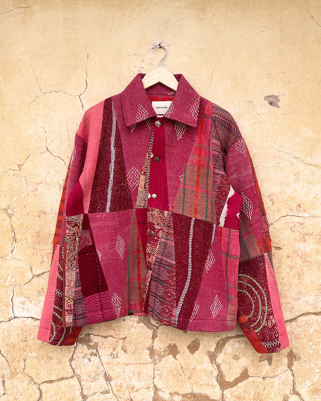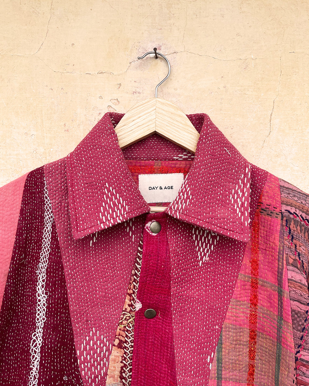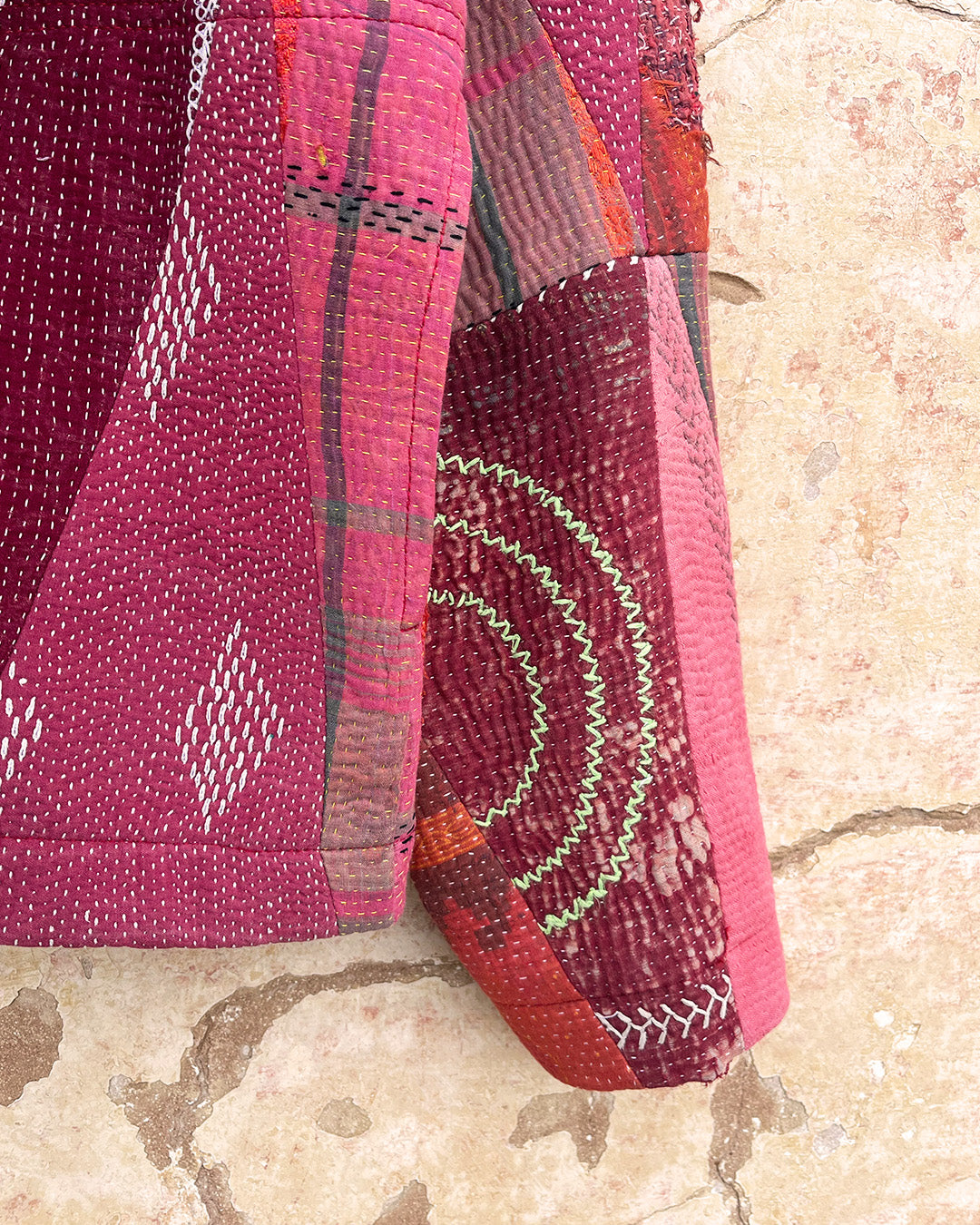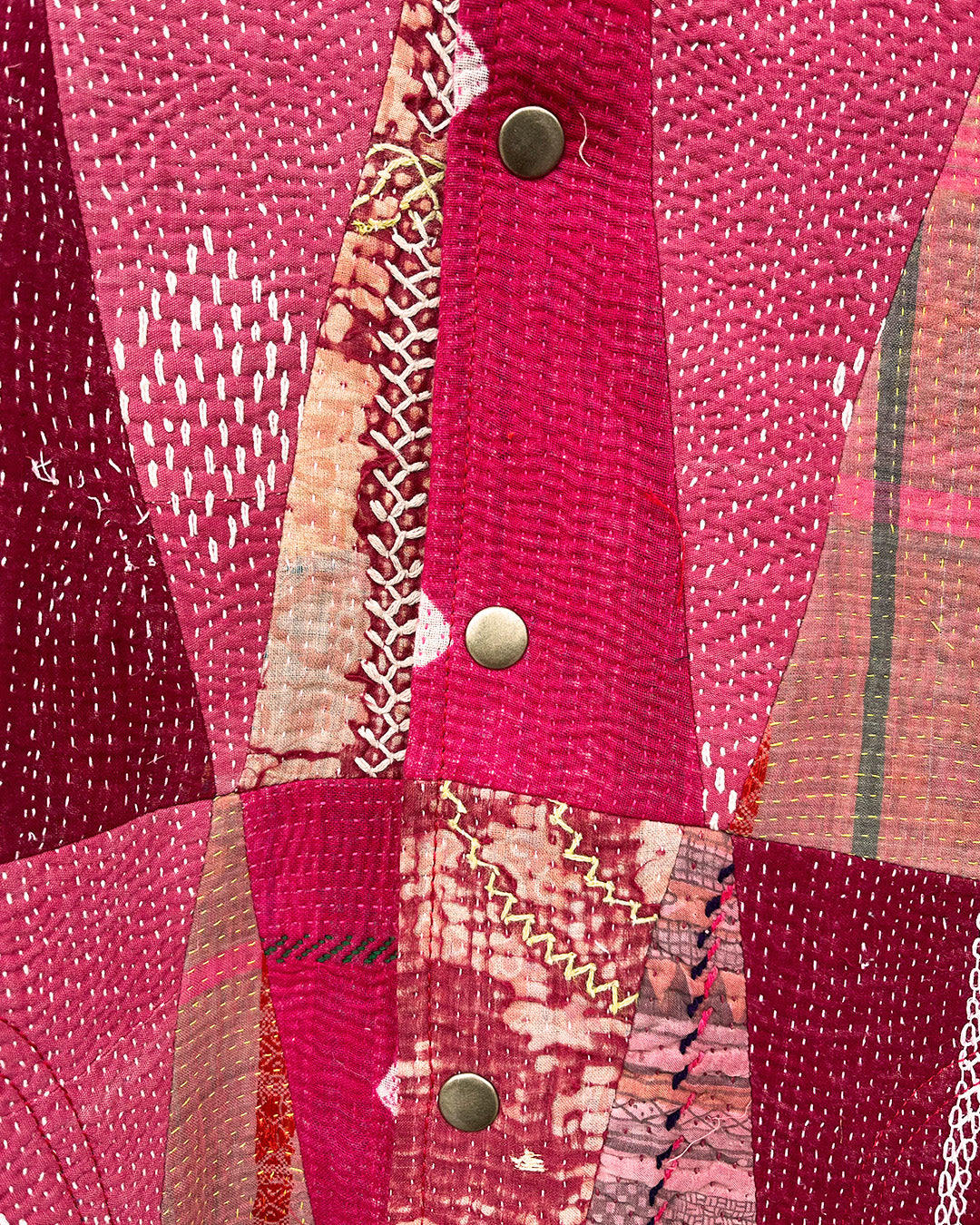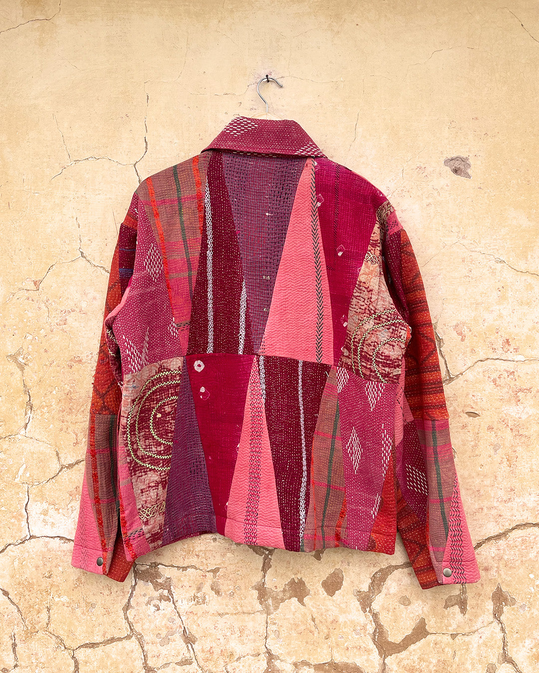 Kantha quilts are crafted from repurposed saris and fabrics and feature repairs, darning, and patchwork. These unique details not only add character but ensure durable, one-of-a-kind garments with a rich up-cycling heritage. We embrace the distressed patches alongside the intricate stitch work in the most unlikely colours.