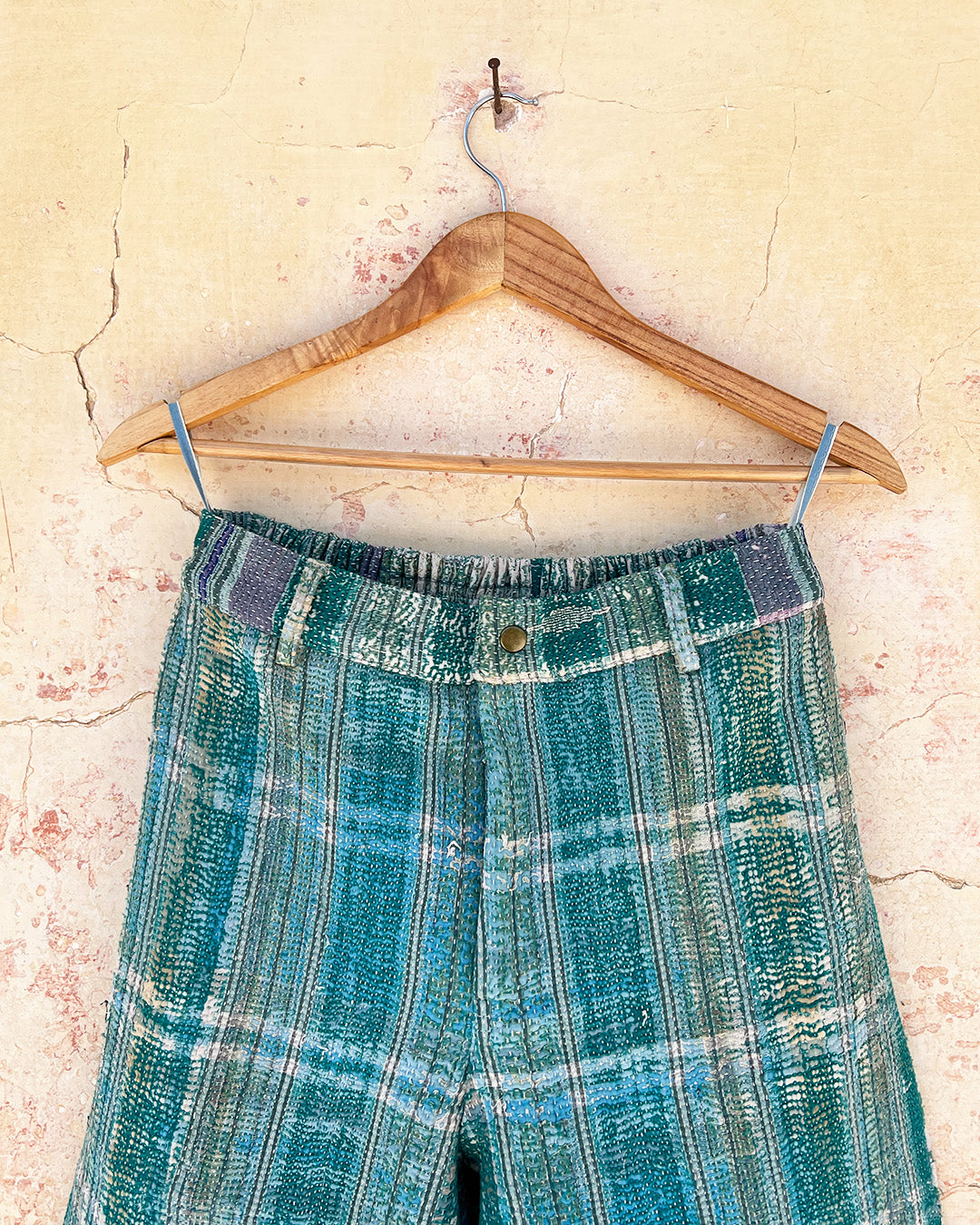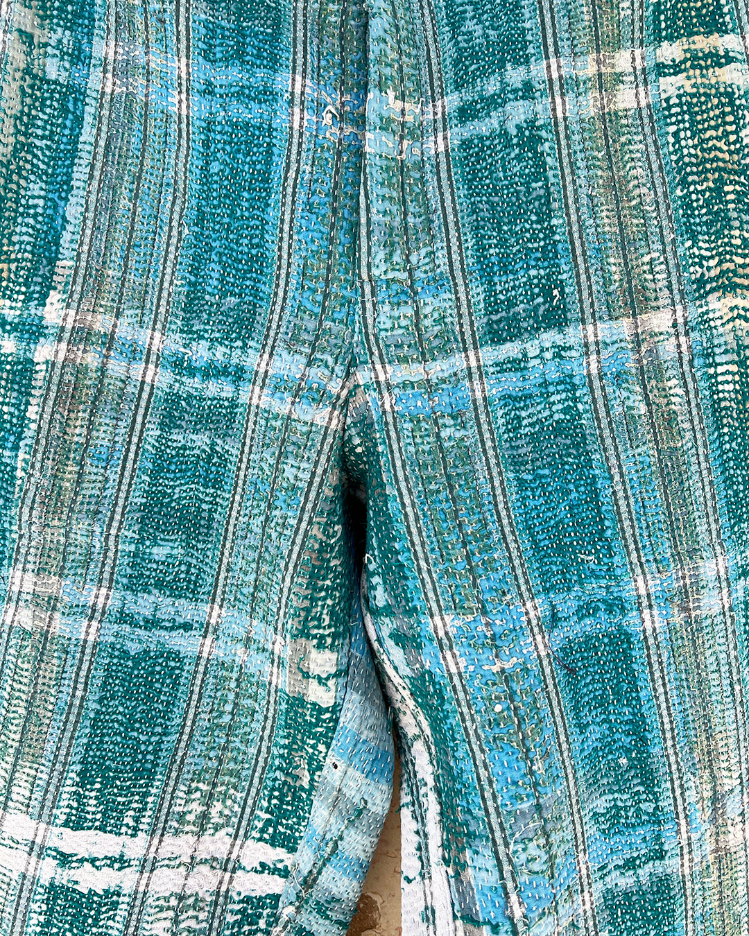 Kantha quilts are crafted from repurposed saris and fabrics and feature repairs, darning, and patchwork. These unique details not only add character but ensure durable, one-of-a-kind garments with a rich up-cycling heritage. We embrace the distressed patches alongside the intricate stitch work in the most unlikely colours.