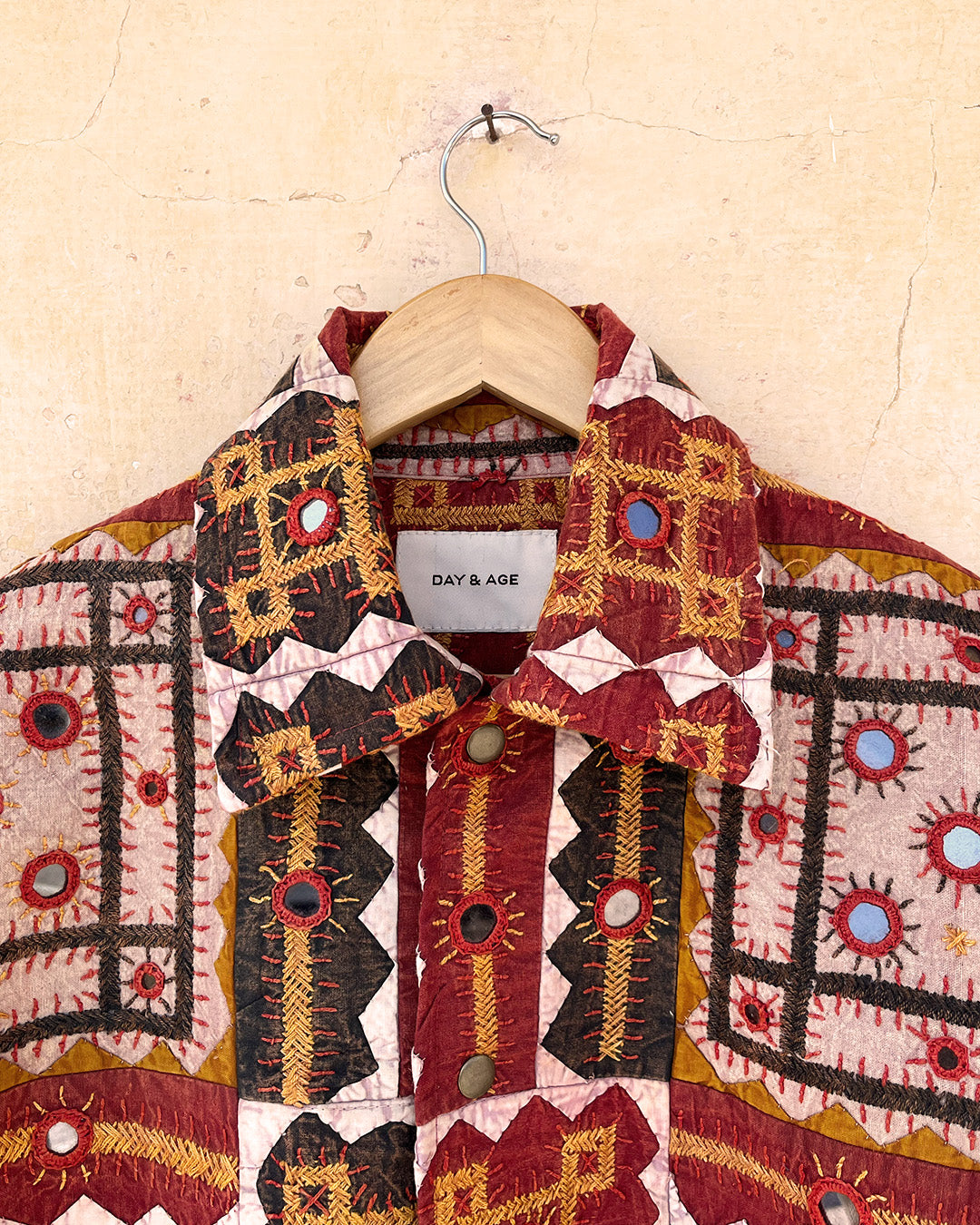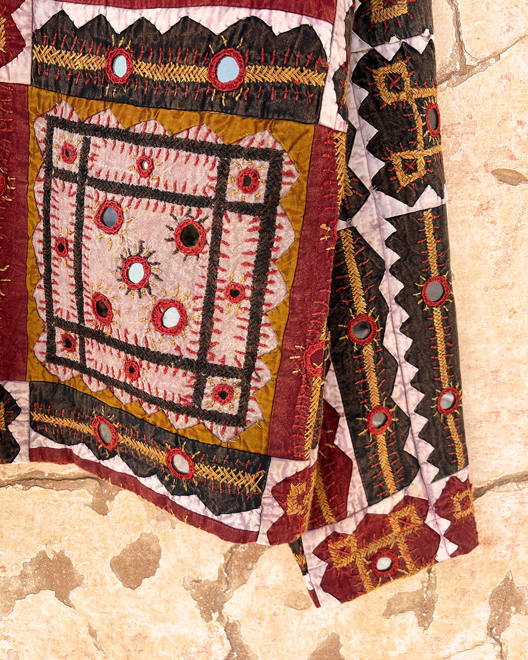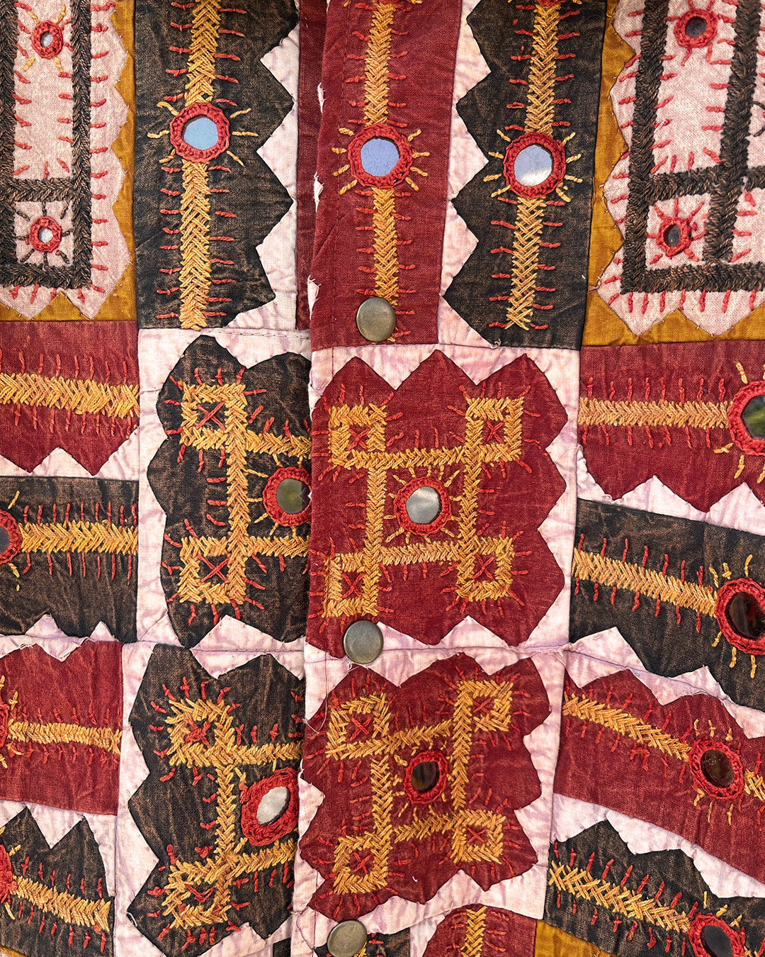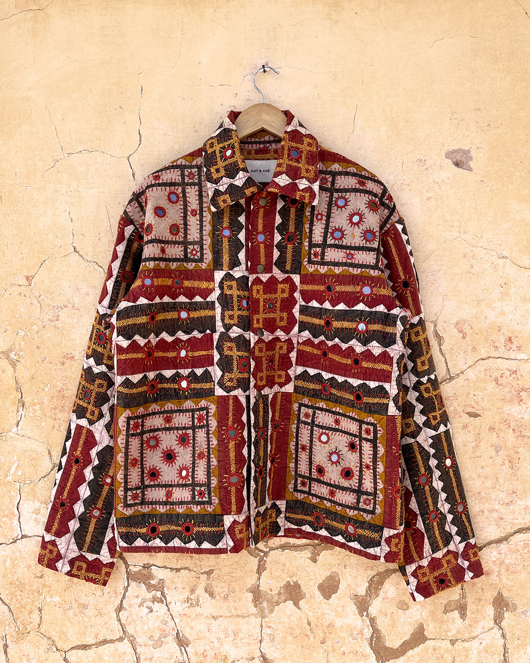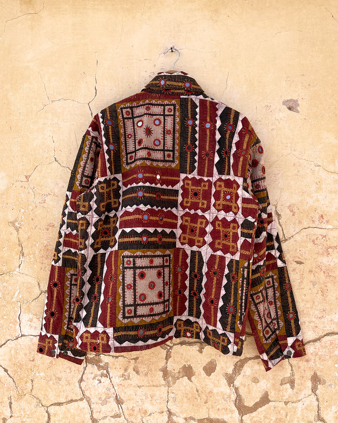 This garment is made from a vintage hand embroidered bedspread from Rajasthan, India. Its textural surface adds character and ensures a durable garment with a rich up-cycling heritage.
