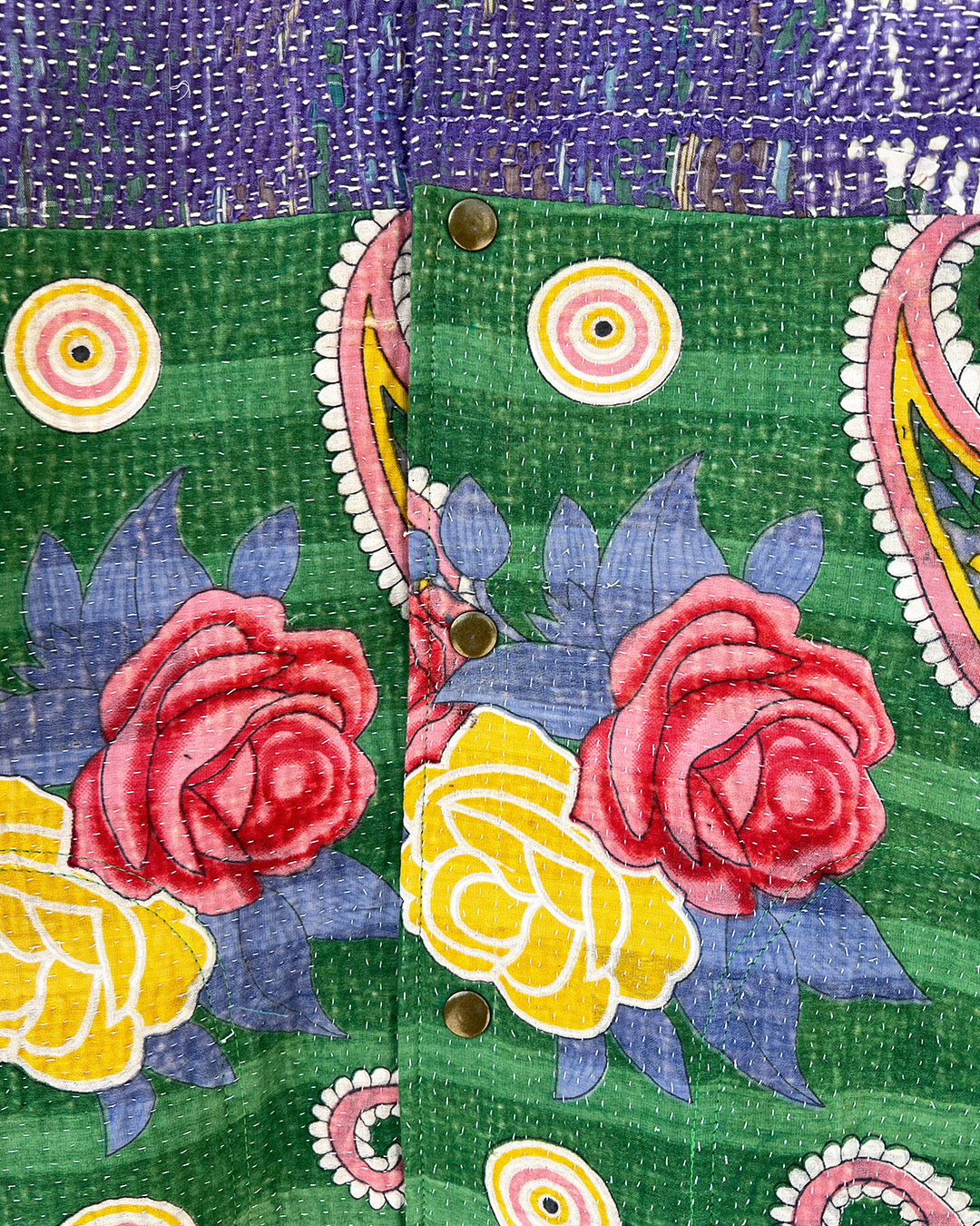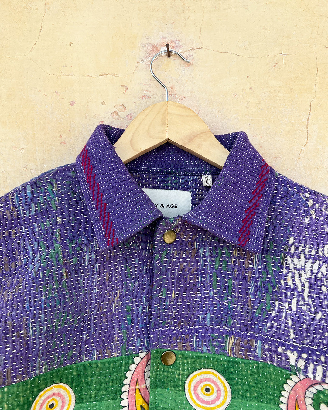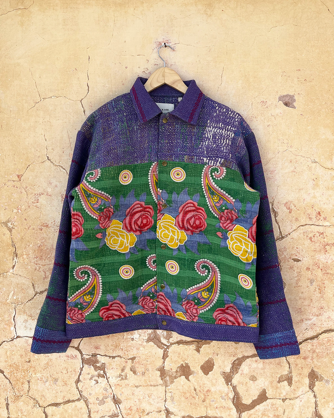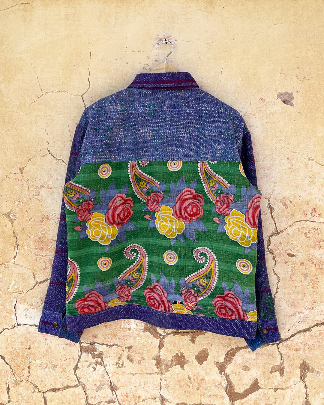 Kantha quilts are crafted from repurposed saris and fabrics and feature repairs, darning, and patchwork. These unique details not only add character but ensure durable, one-of-a-kind garments with a rich up-cycling heritage. We embrace the distressed patches alongside the intricate stitch work in the most unlikely colours.