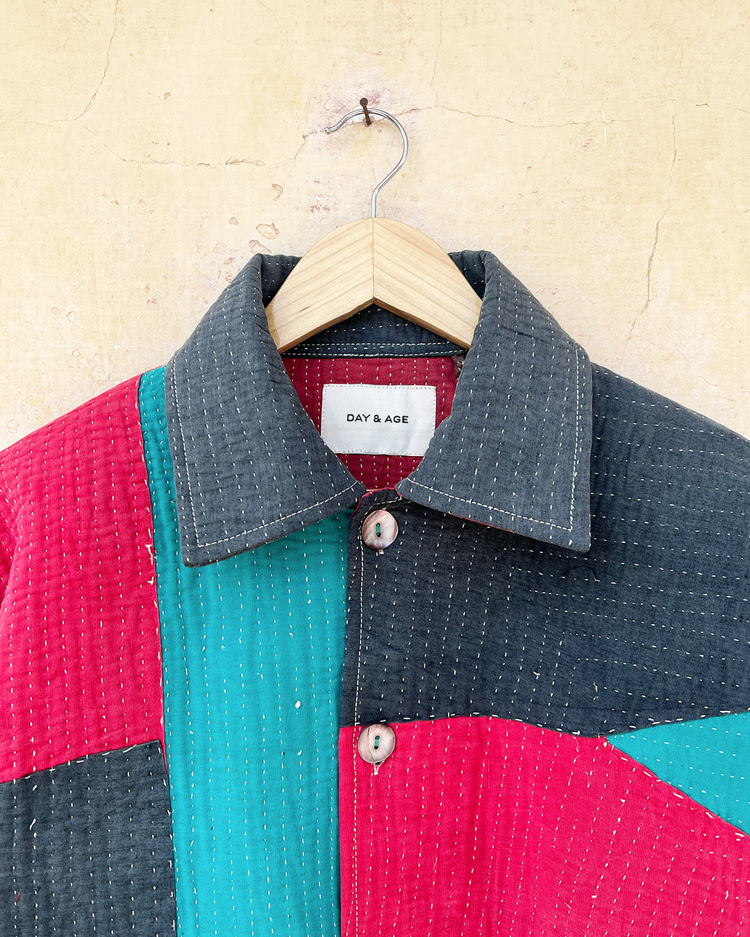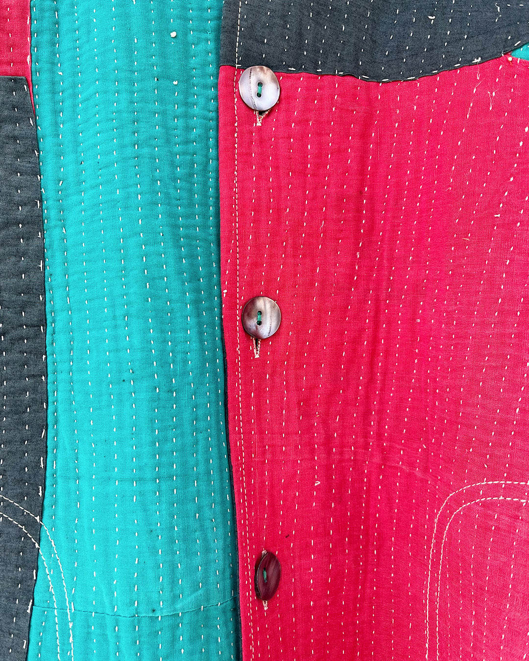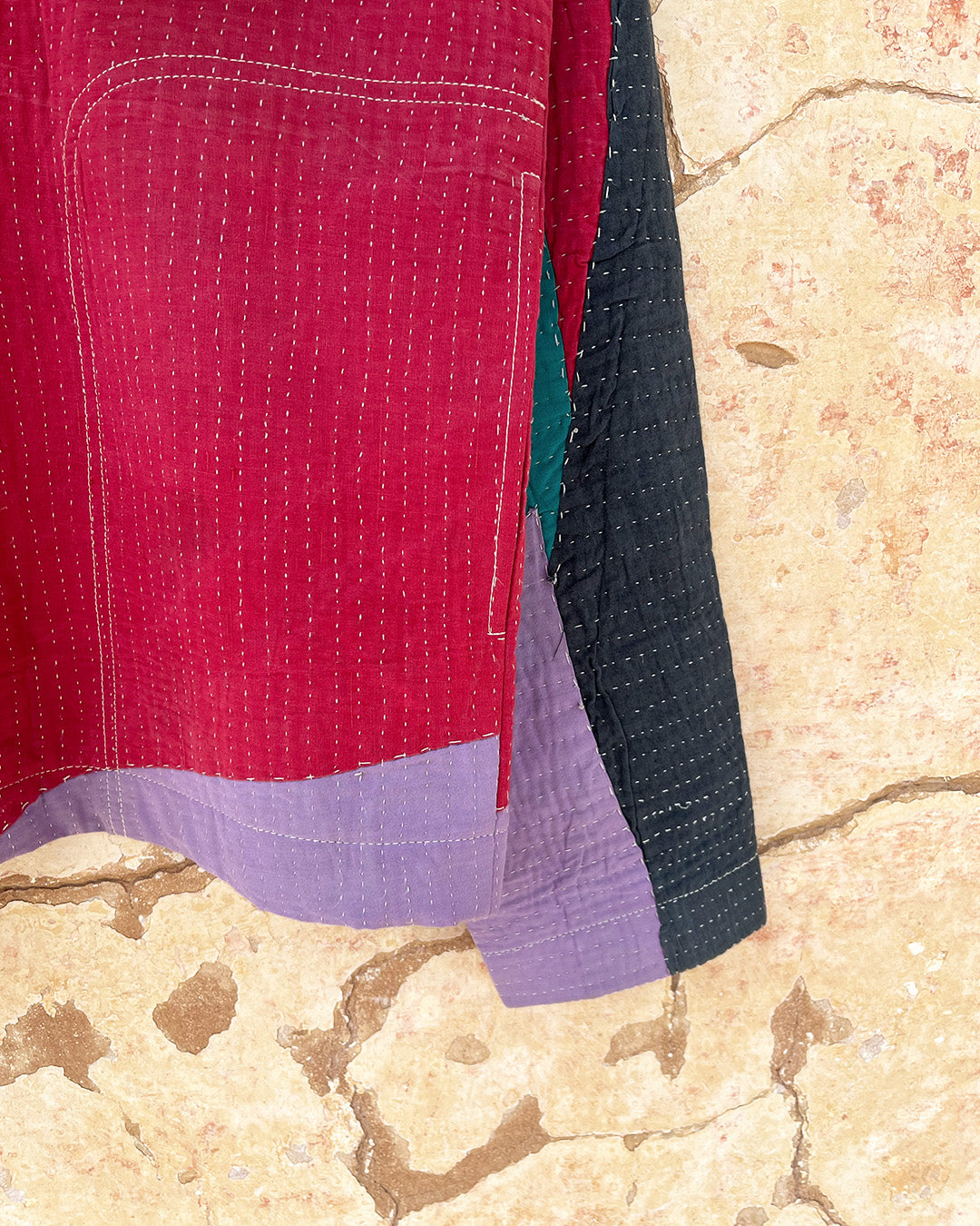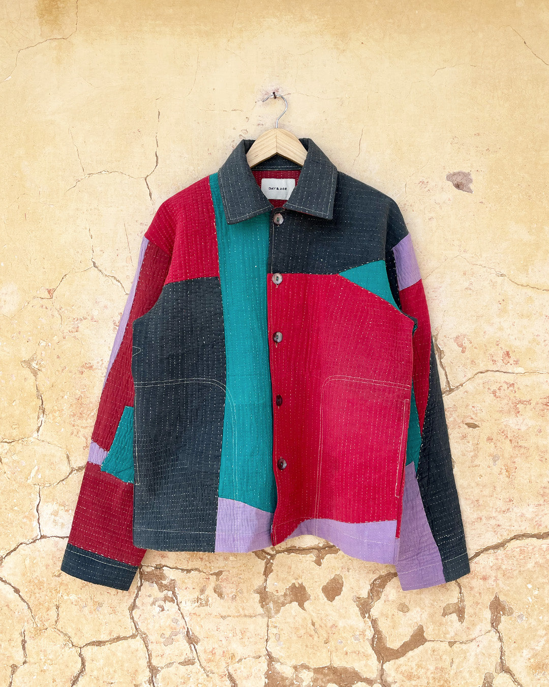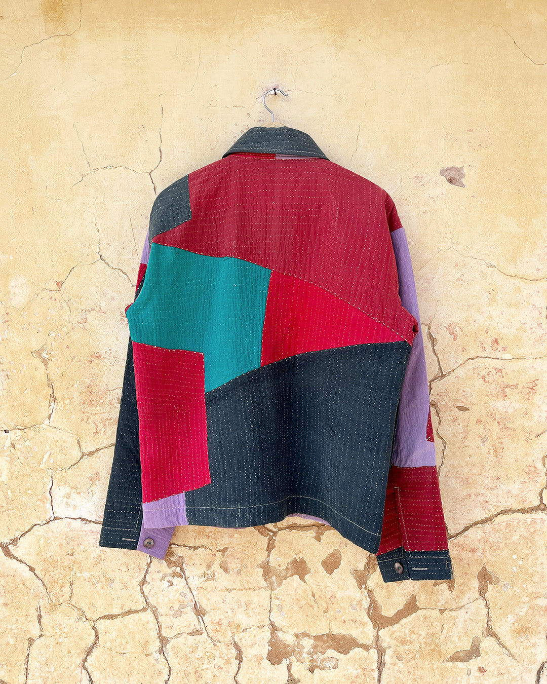 Kantha quilts are crafted from repurposed saris and fabrics and feature repairs, darning, and patchwork. These unique details not only add character but ensure durable, one-of-a-kind garments with a rich up-cycling heritage. We embrace the distressed patches alongside the intricate stitch work in the most unlikely colours.