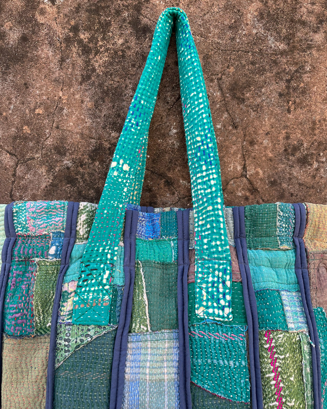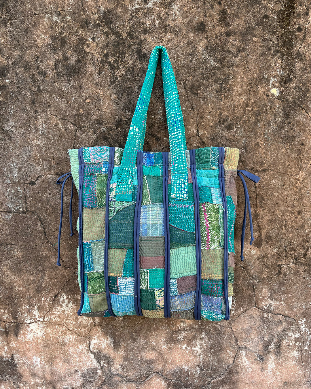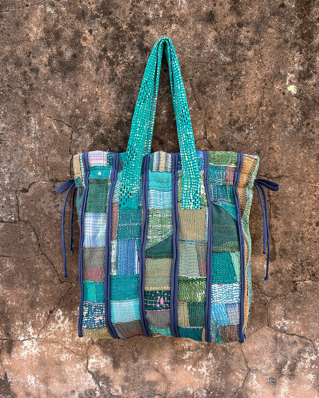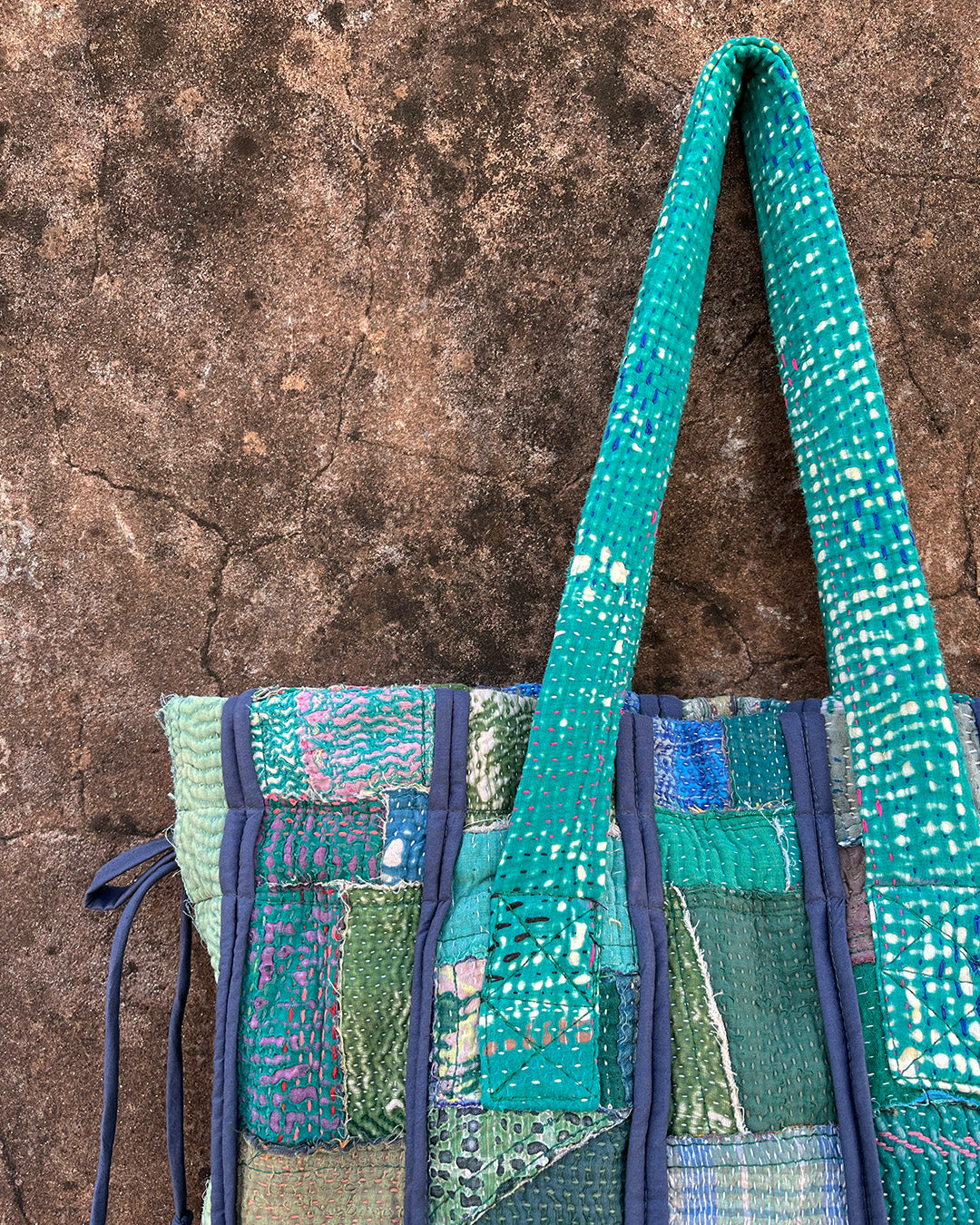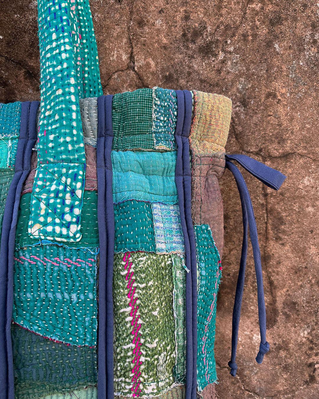 Kantha quilts are crafted from repurposed saris and fabrics and feature repairs, darning, and patchwork. These unique details not only add character but ensure durable, one-of-a-kind garments with a rich up-cycling heritage. We embrace the distressed patches alongside the intricate stitch work in the most unlikely colours.