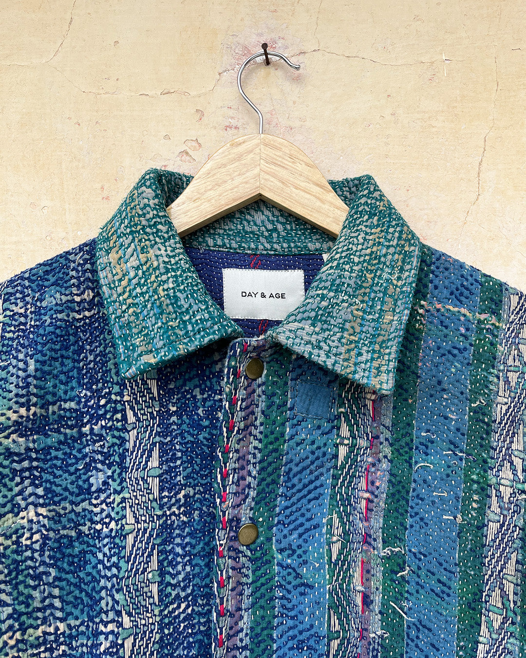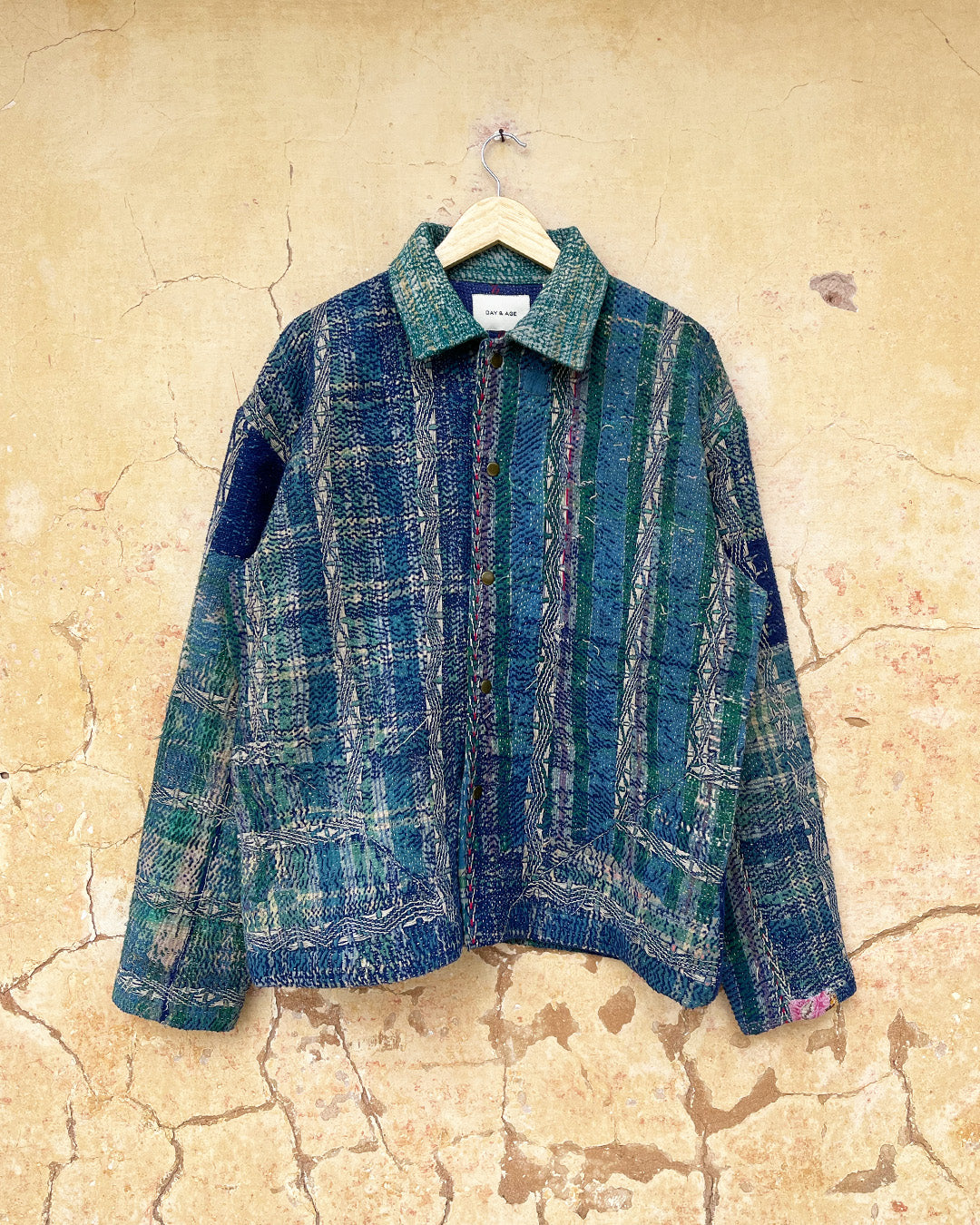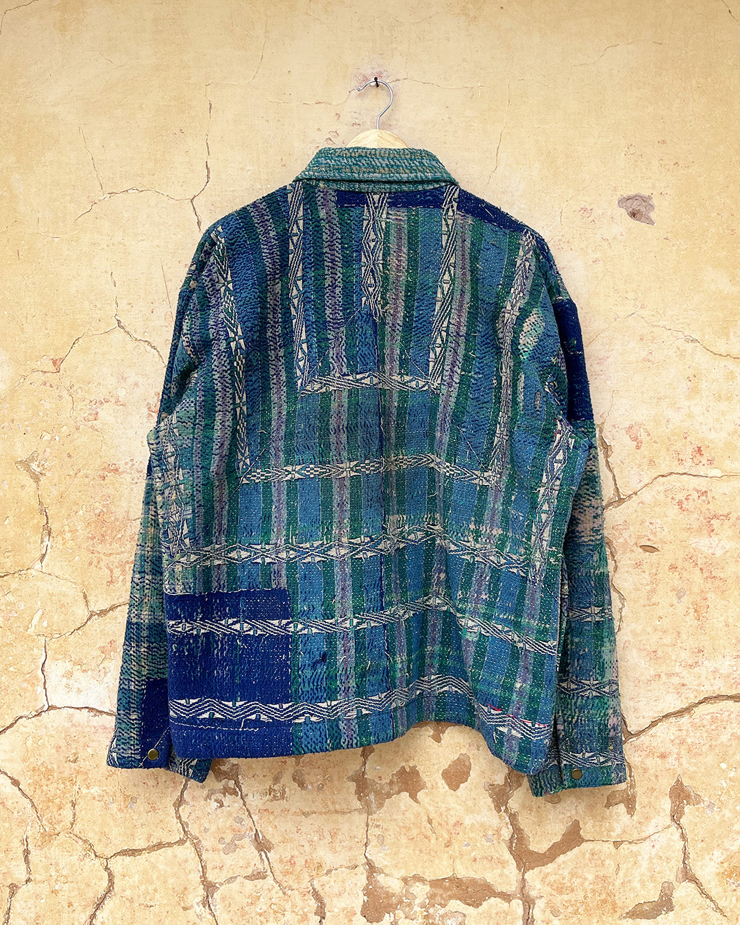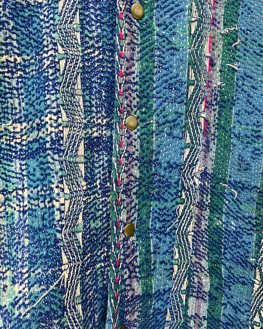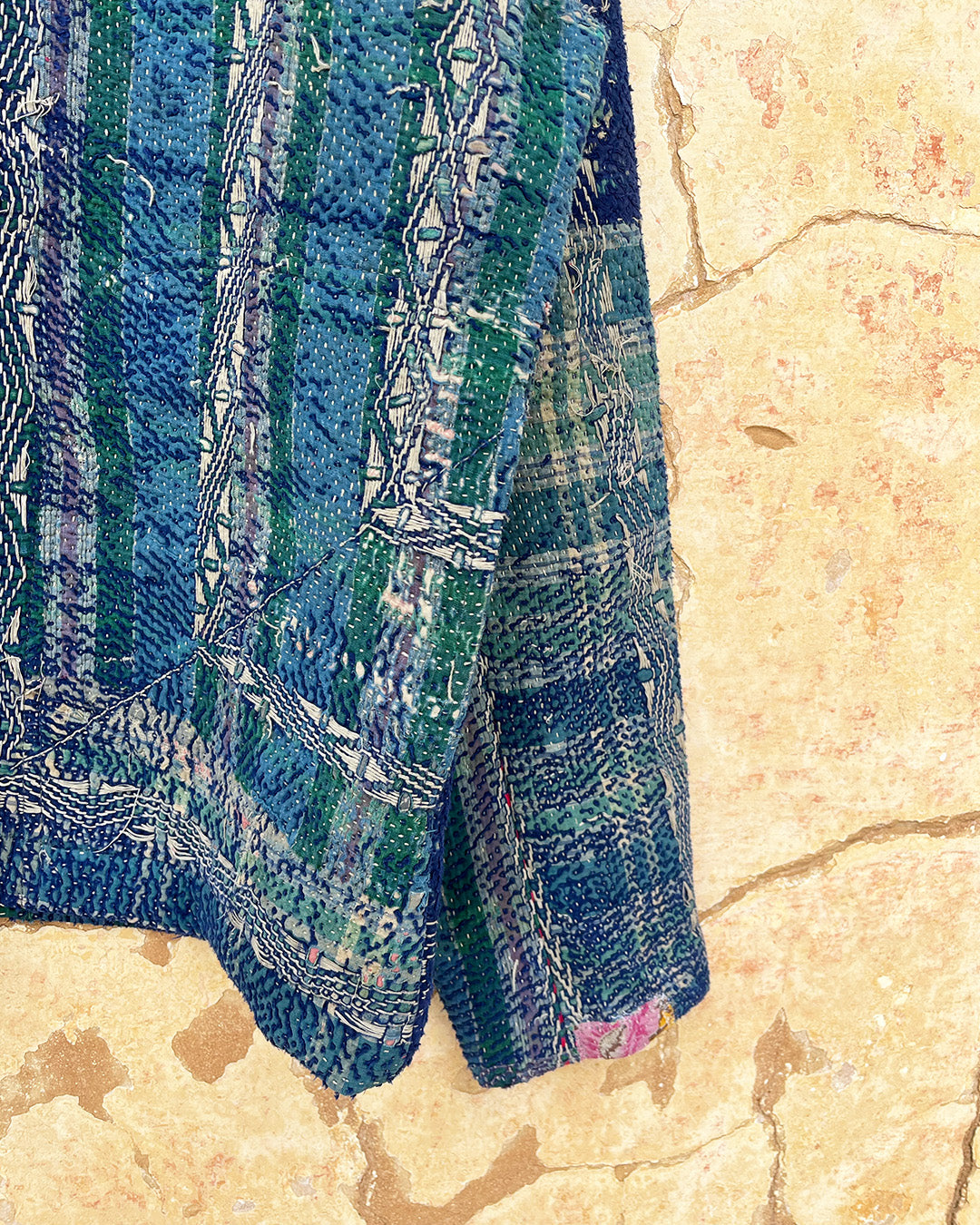 Kantha quilts are crafted from repurposed saris and fabrics and feature repairs, darning, and patchwork. These unique details not only add character but ensure durable, one-of-a-kind garments with a rich up-cycling heritage. We embrace the distressed patches alongside the intricate stitch work in the most unlikely colours.