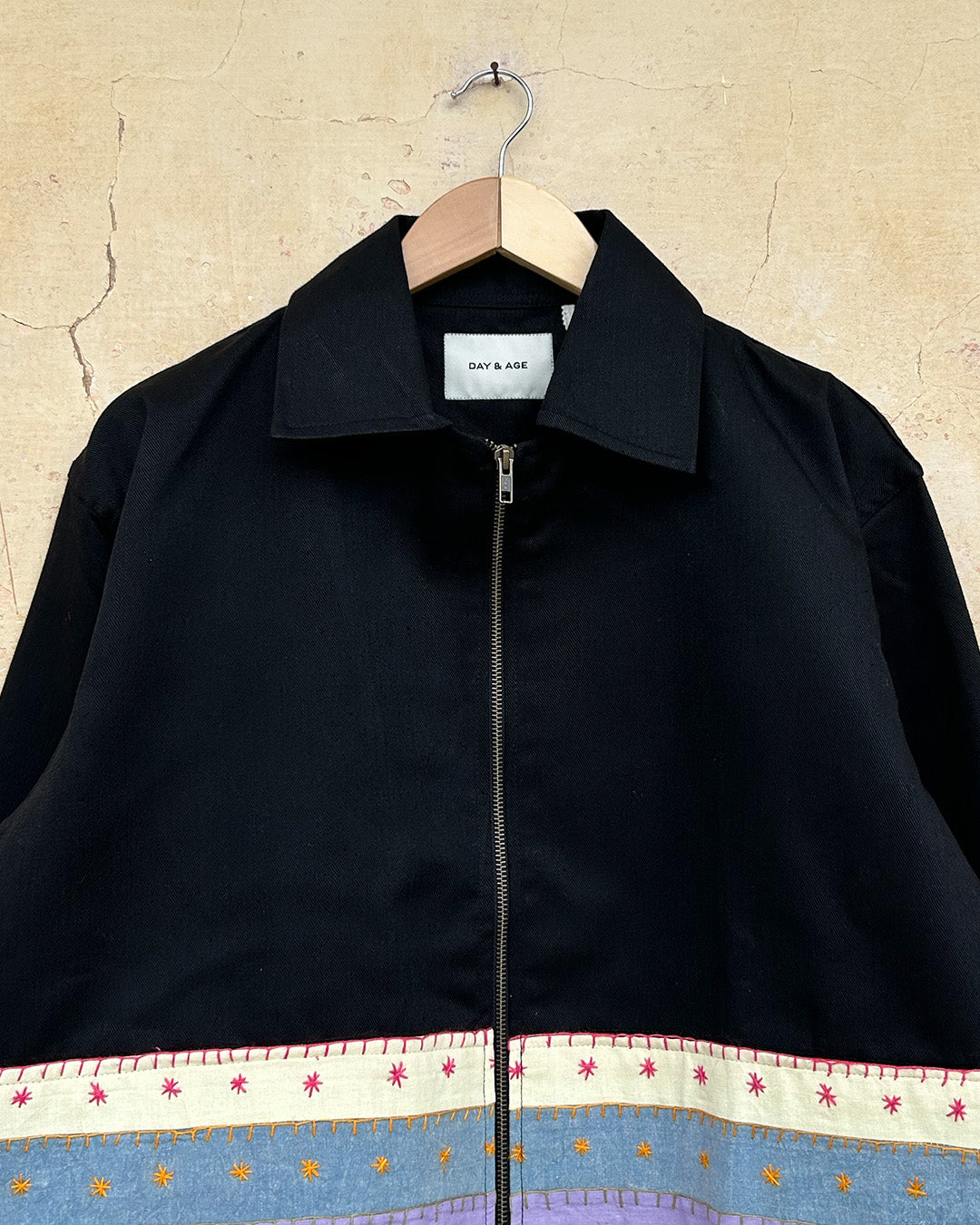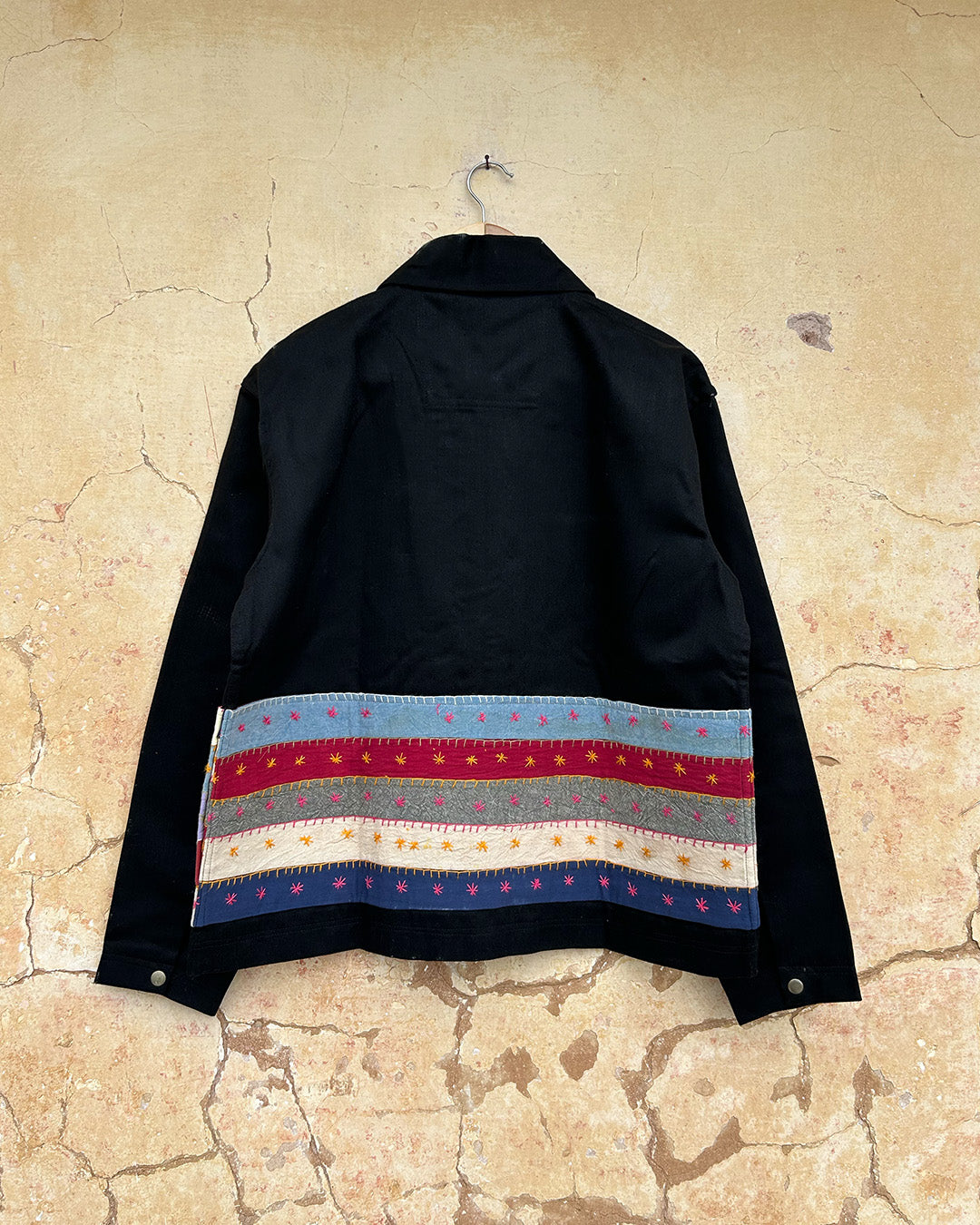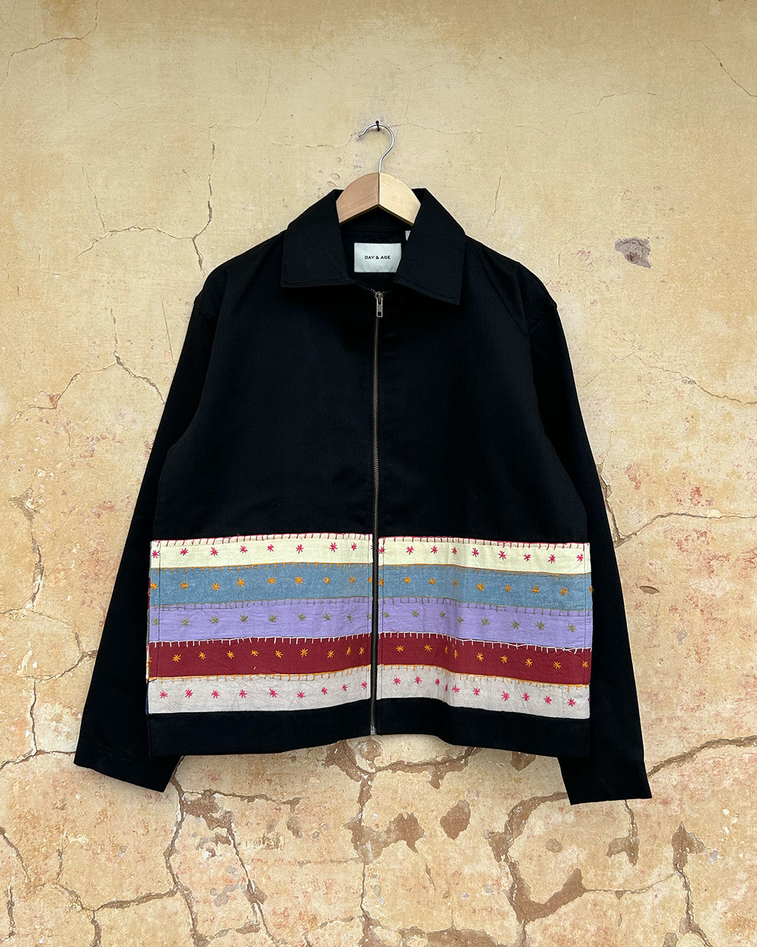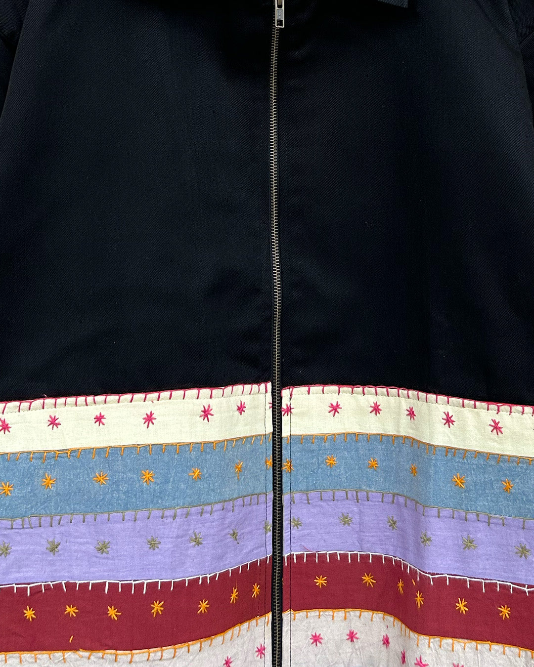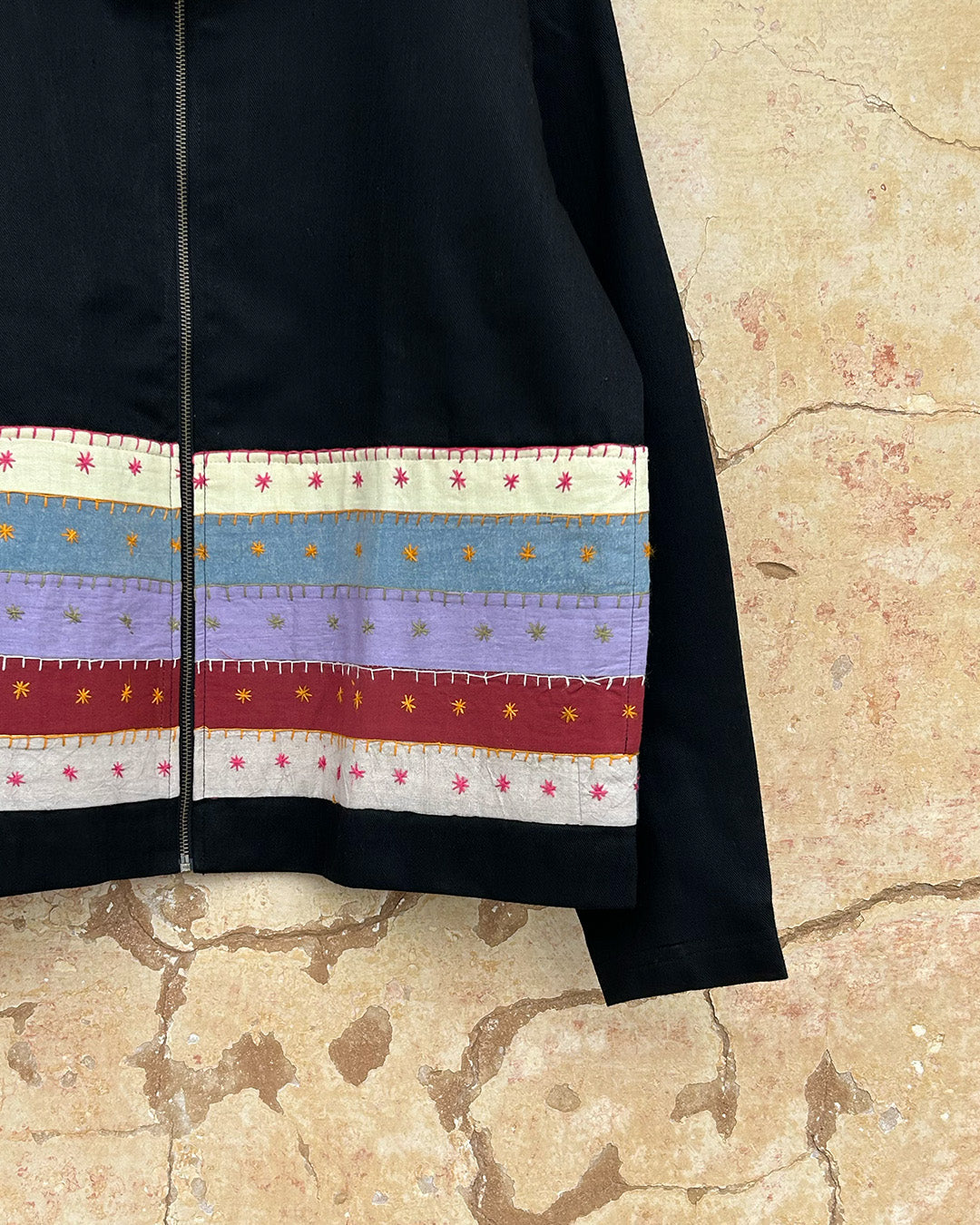 Garments of the Parallels Collection are made from one-of-a kind vintage patchwork bedspreads from Rajasthan. They feature multicolour strips and shapes patched together using blanket stitch and adorned with hand embroidered star-like motifs.