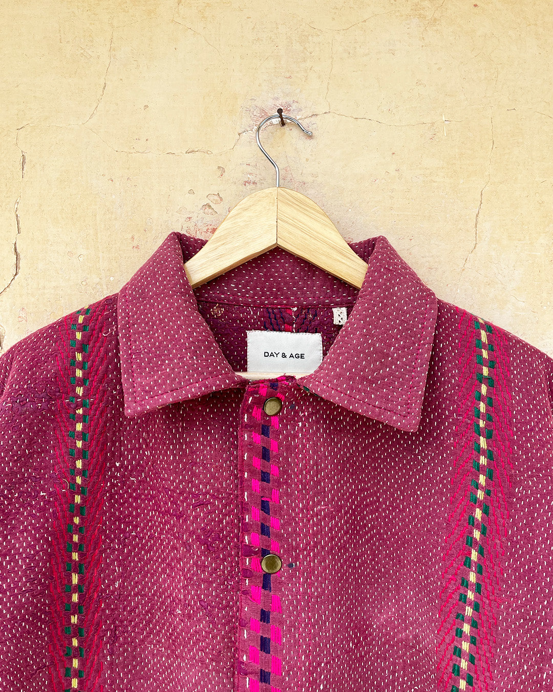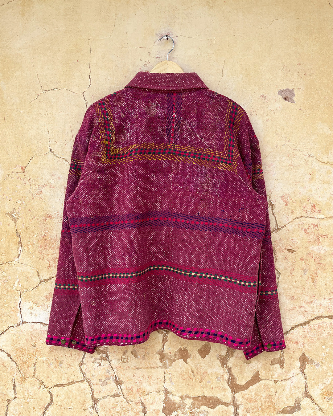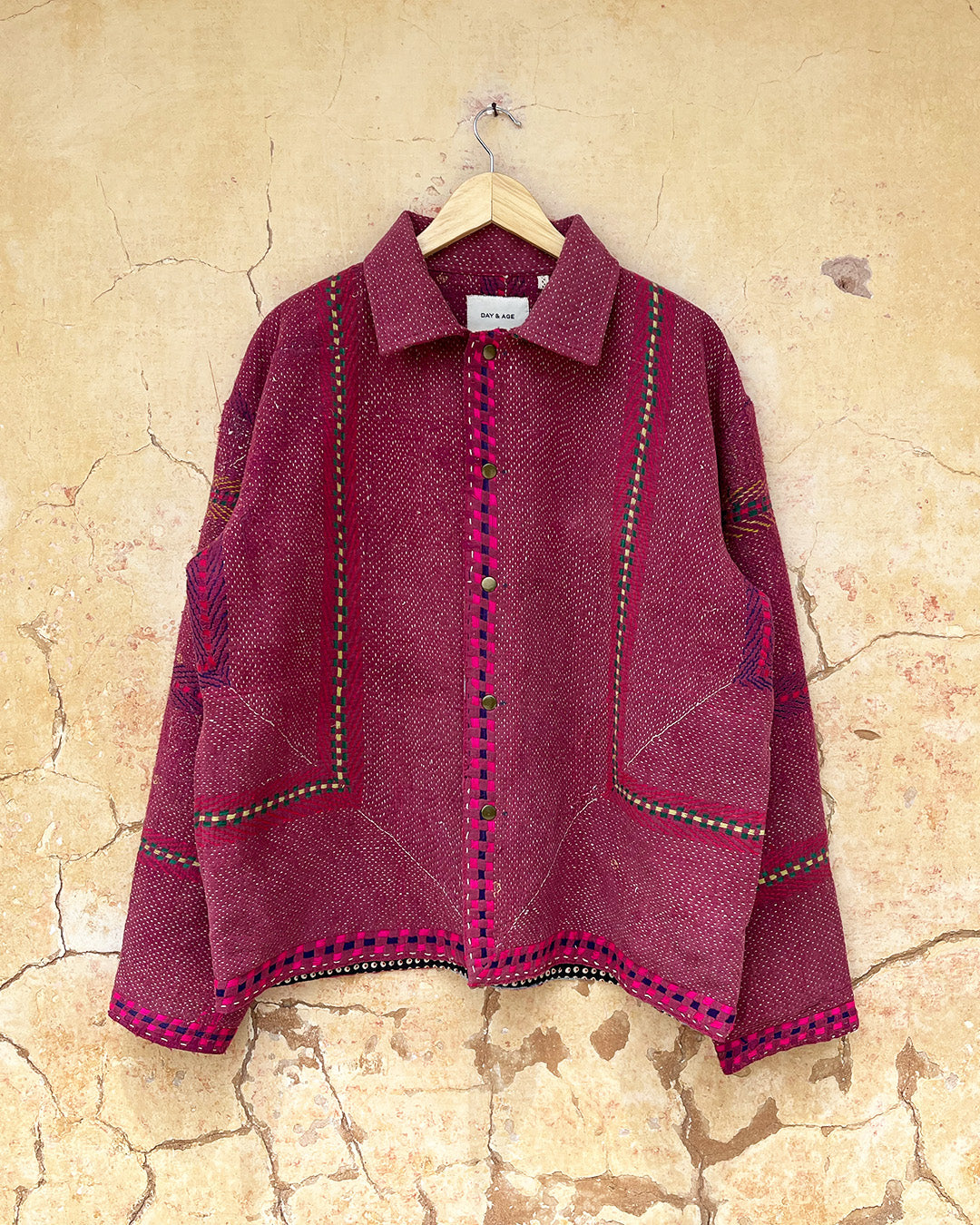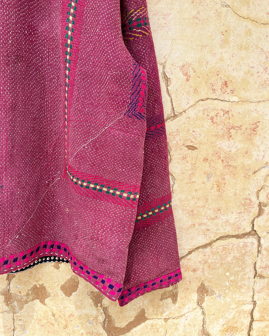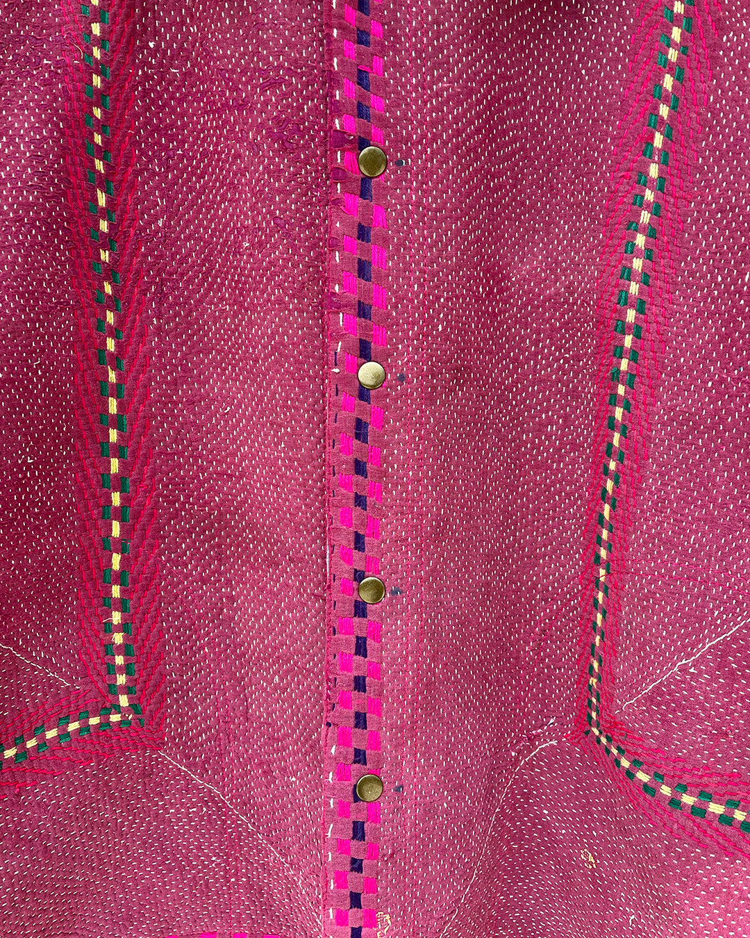 Kantha quilts are crafted from repurposed saris and fabrics and feature repairs, darning, and patchwork. These unique details not only add character but ensure durable, one-of-a-kind garments with a rich up-cycling heritage. We embrace the distressed patches alongside the intricate stitch work in the most unlikely colours.