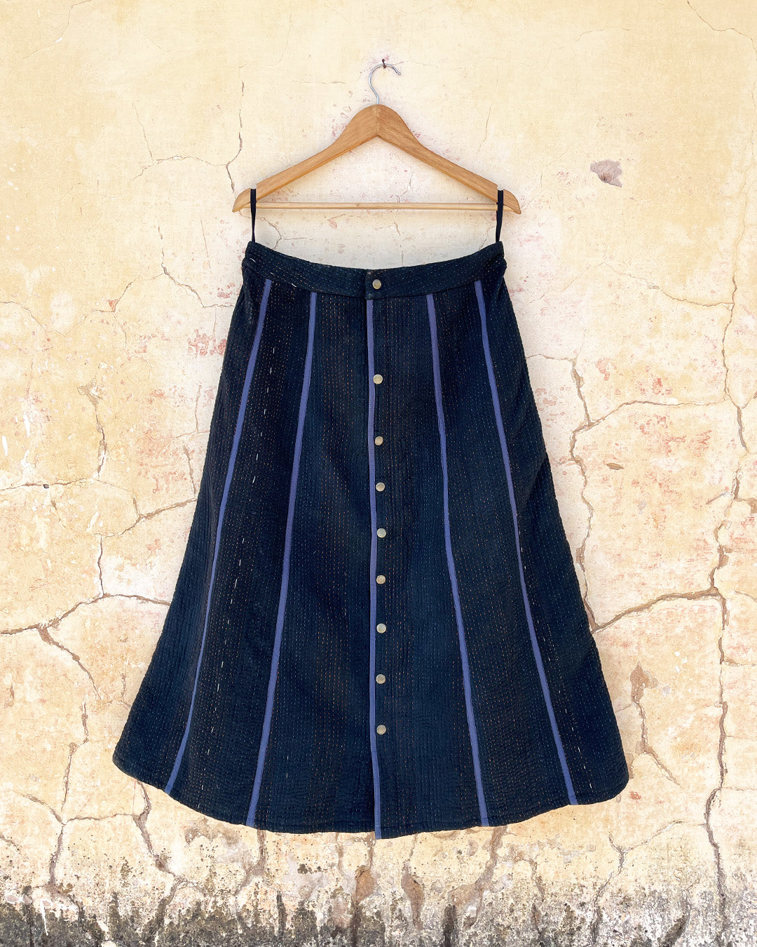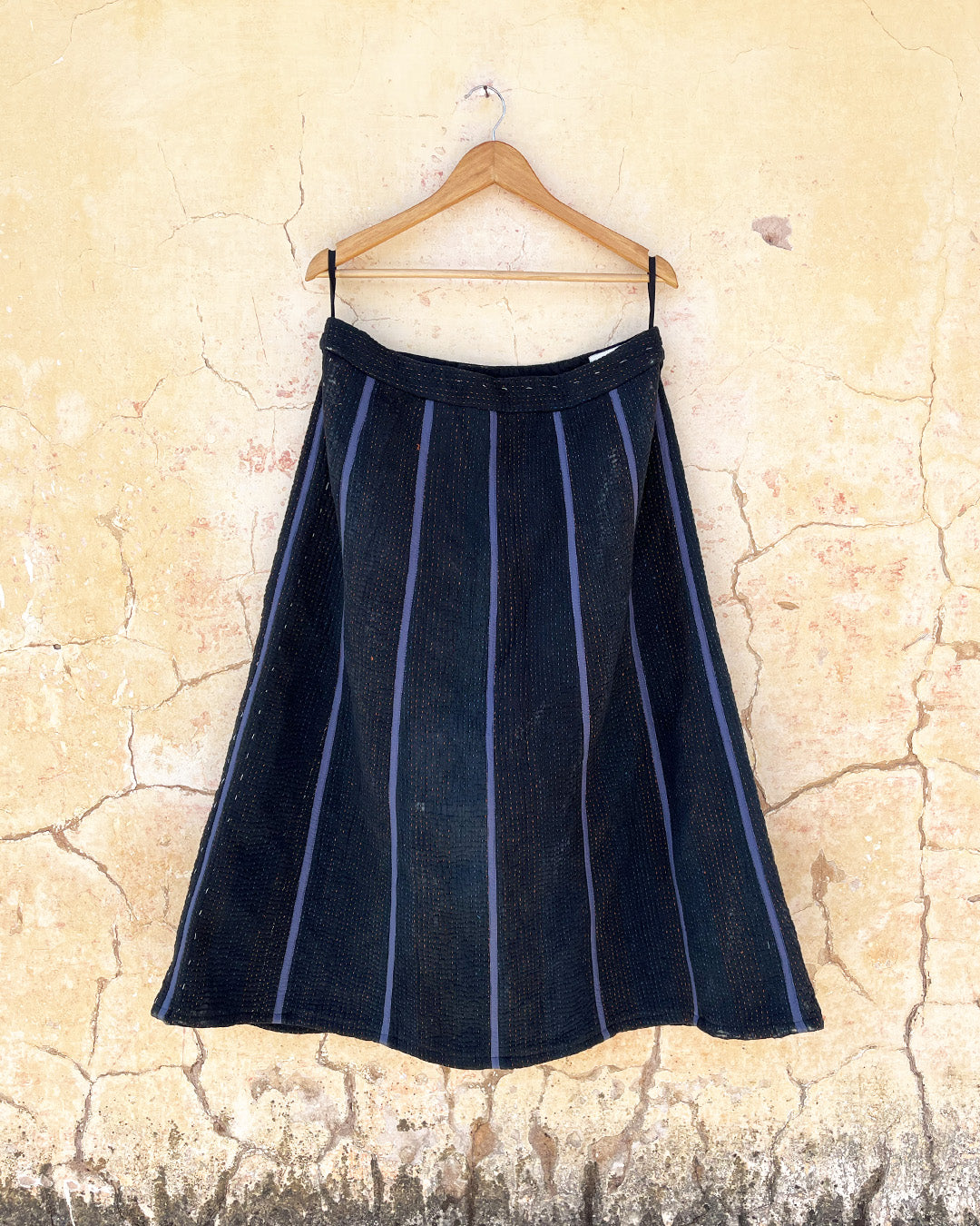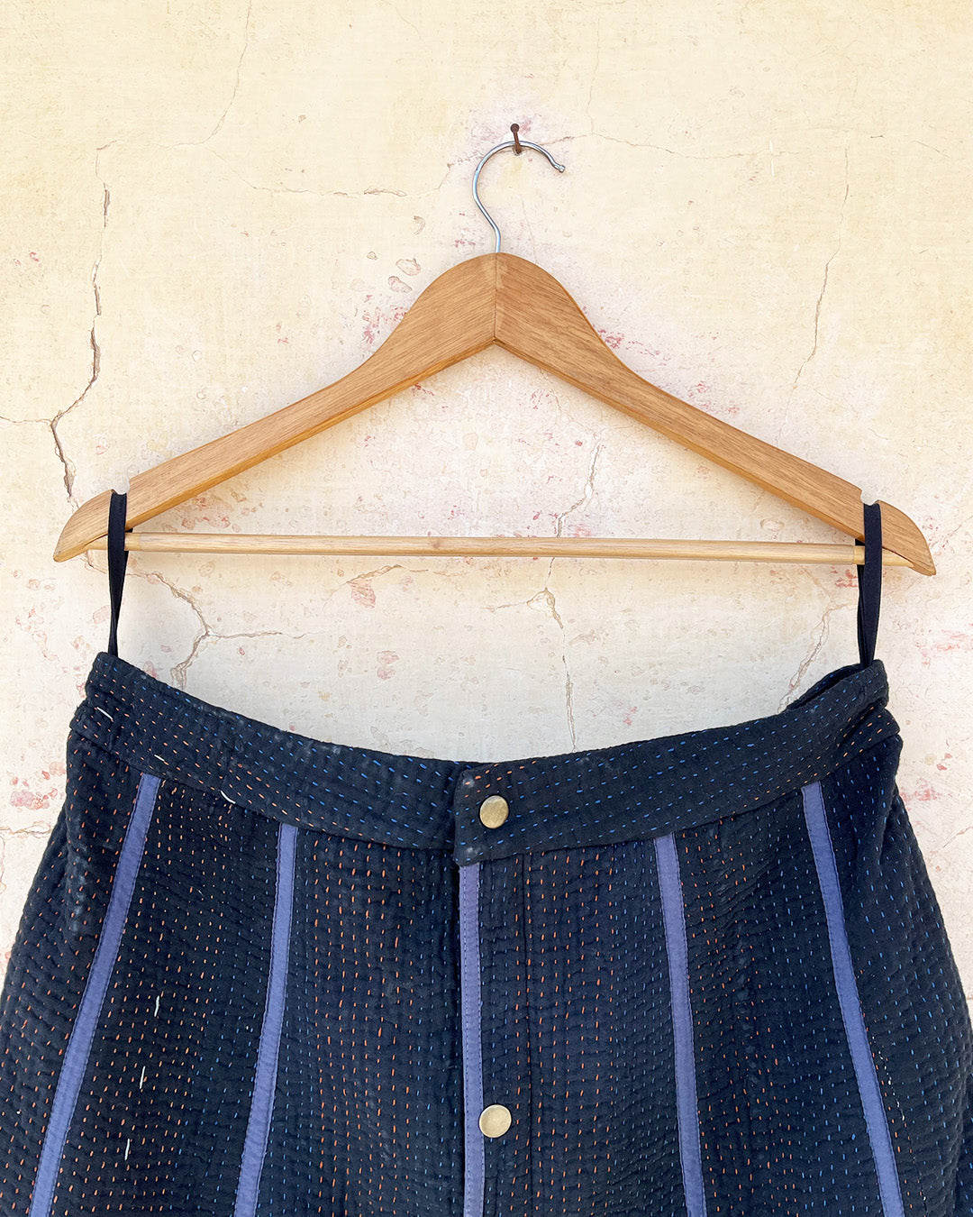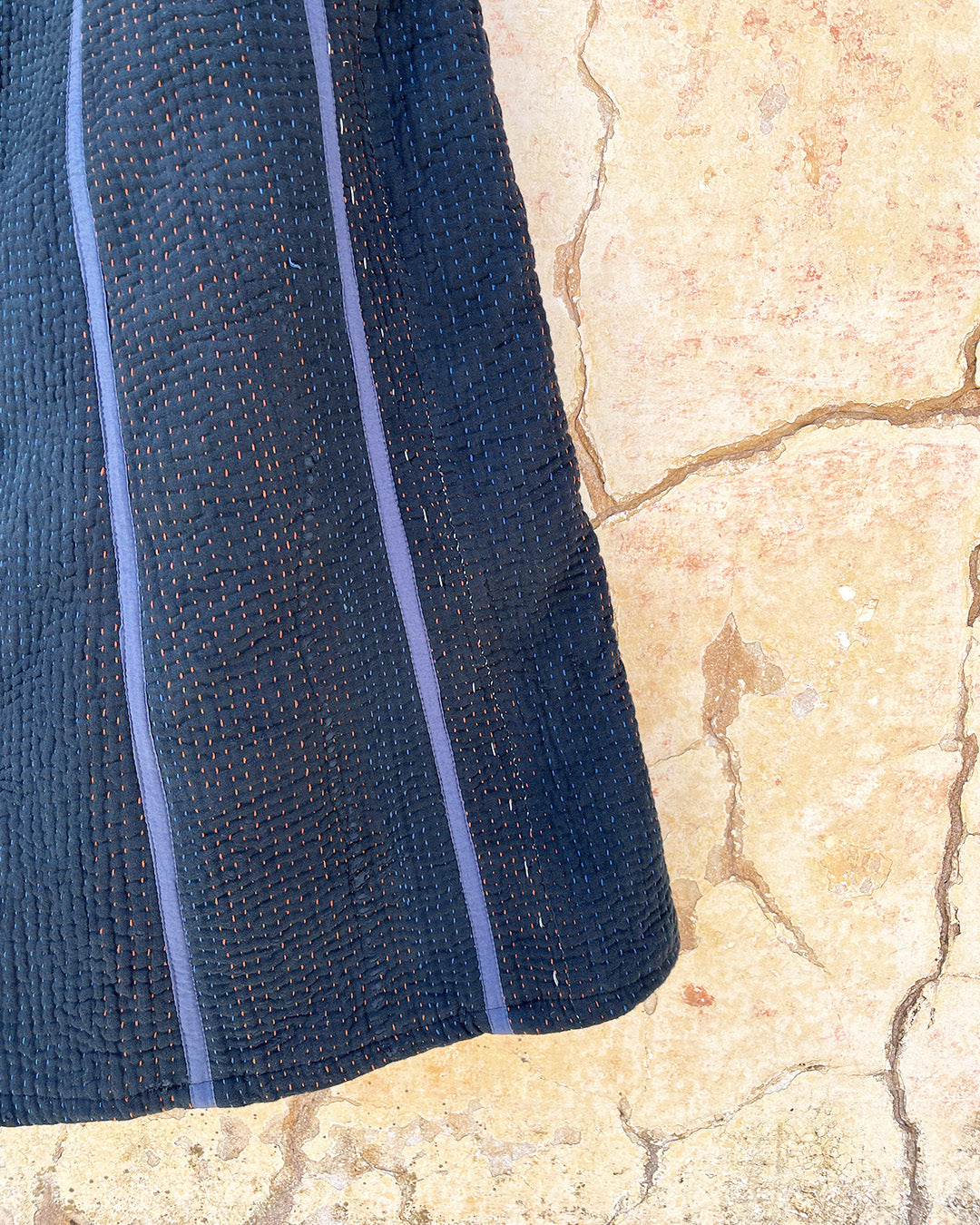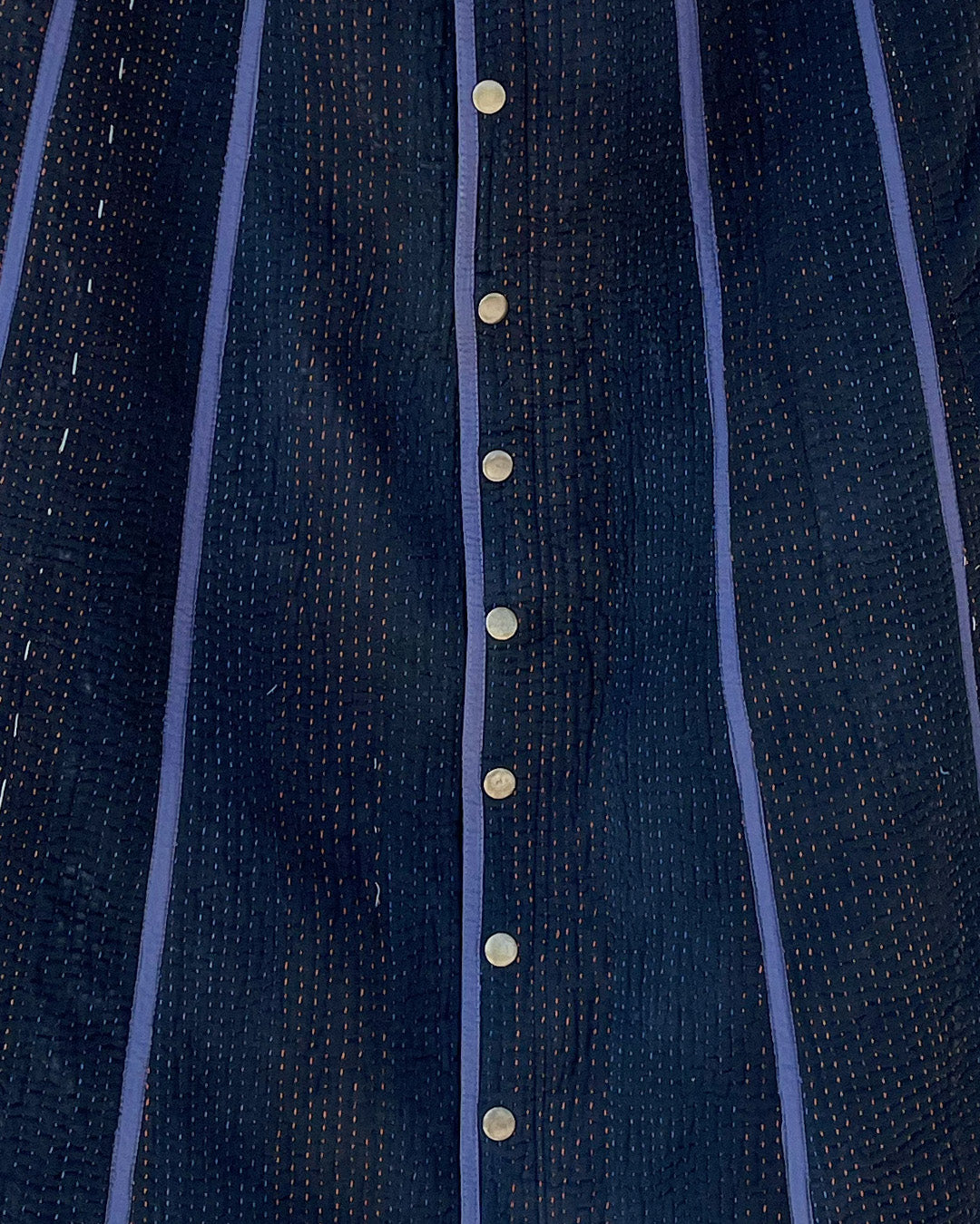 Kantha quilts are crafted from repurposed saris and fabrics and feature repairs, darning, and patchwork. These unique details not only add character but ensure durable, one-of-a-kind garments with a rich up-cycling heritage. We embrace the distressed patches alongside the intricate stitch work in the most unlikely colours.
