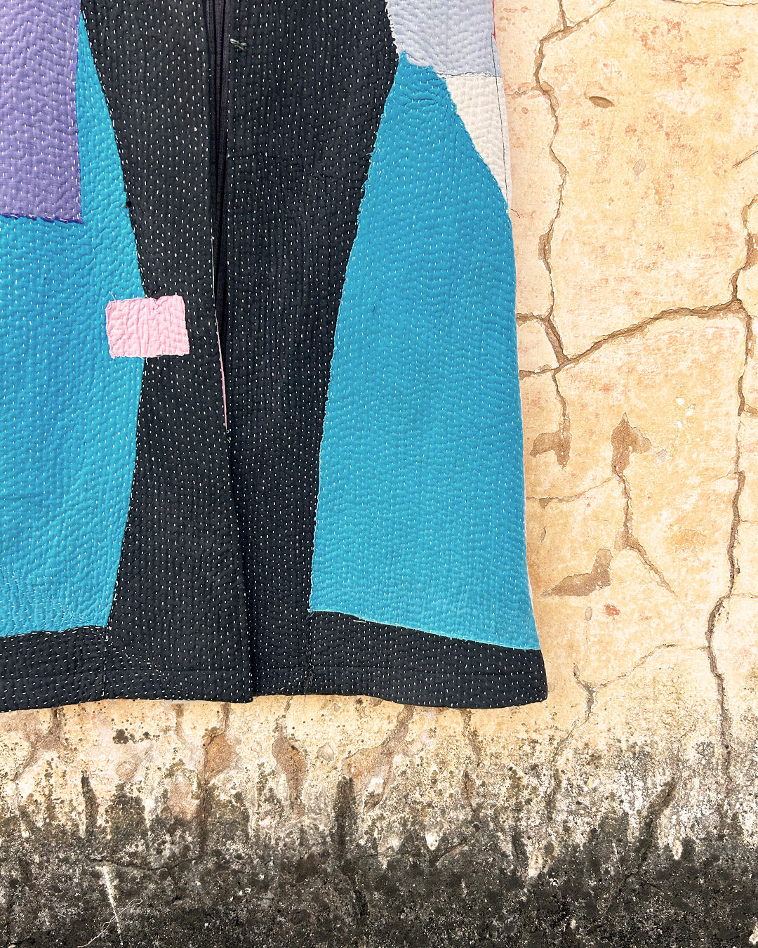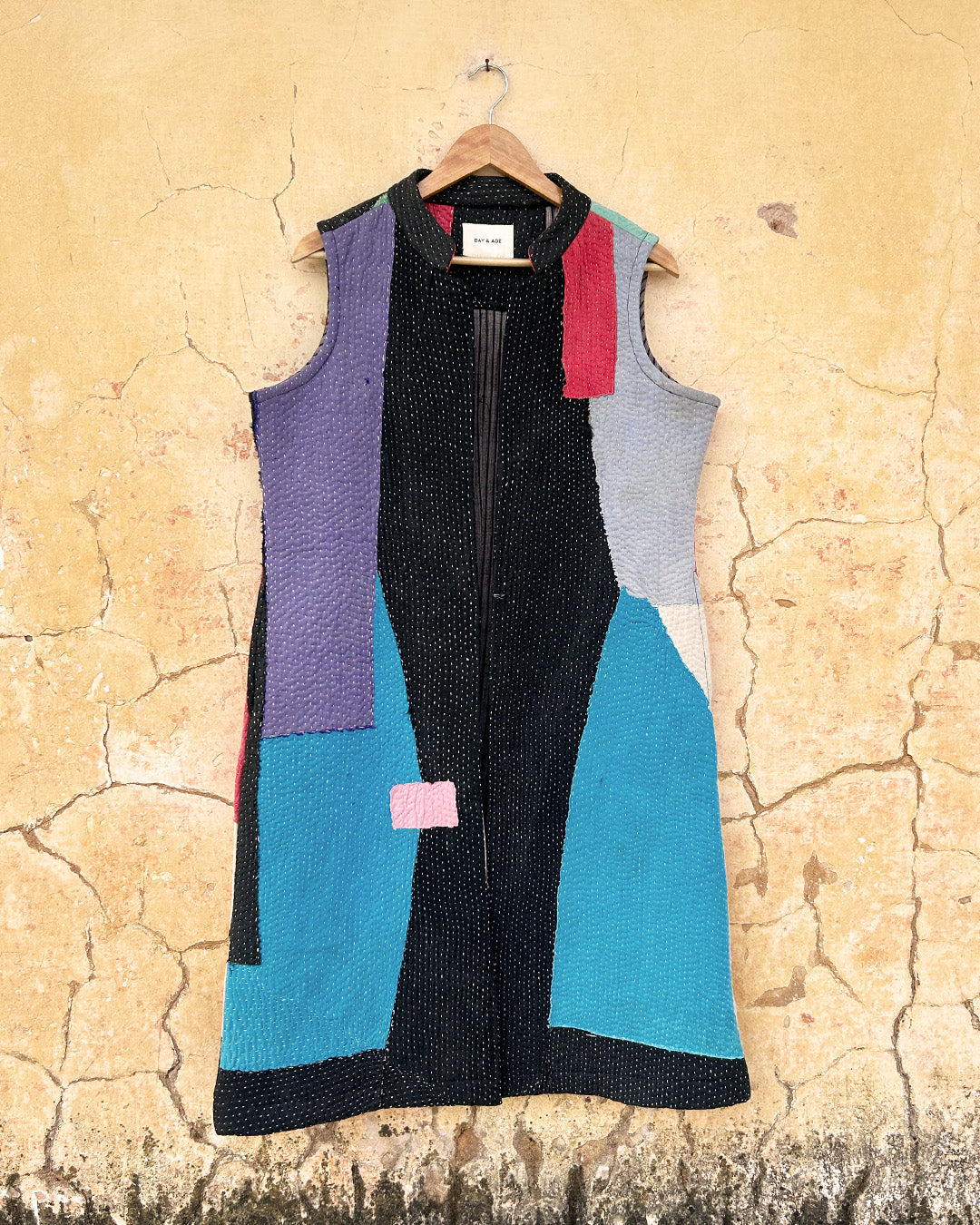 Kantha quilts are crafted from repurposed saris and fabrics and feature repairs, darning, and patchwork. These unique details not only add character but ensure durable, one-of-a-kind garments with a rich up-cycling heritage. We embrace the distressed patches alongside the intricate stitch work in the most unlikely colours.