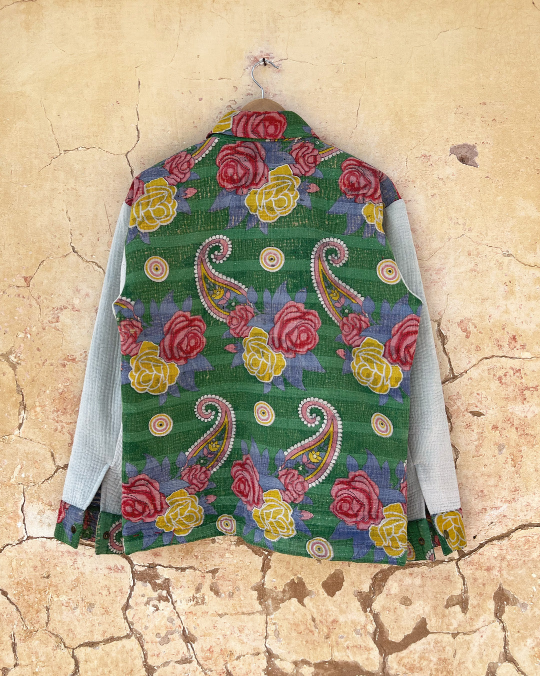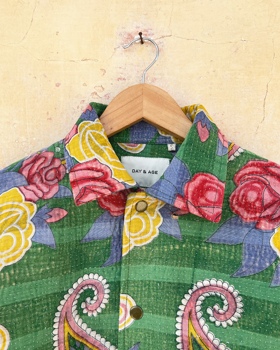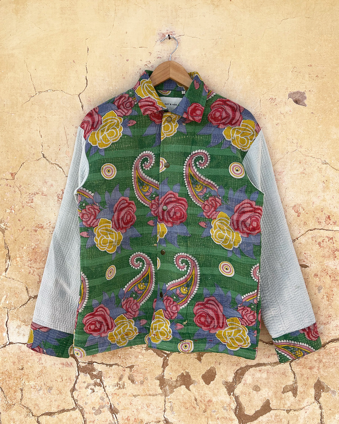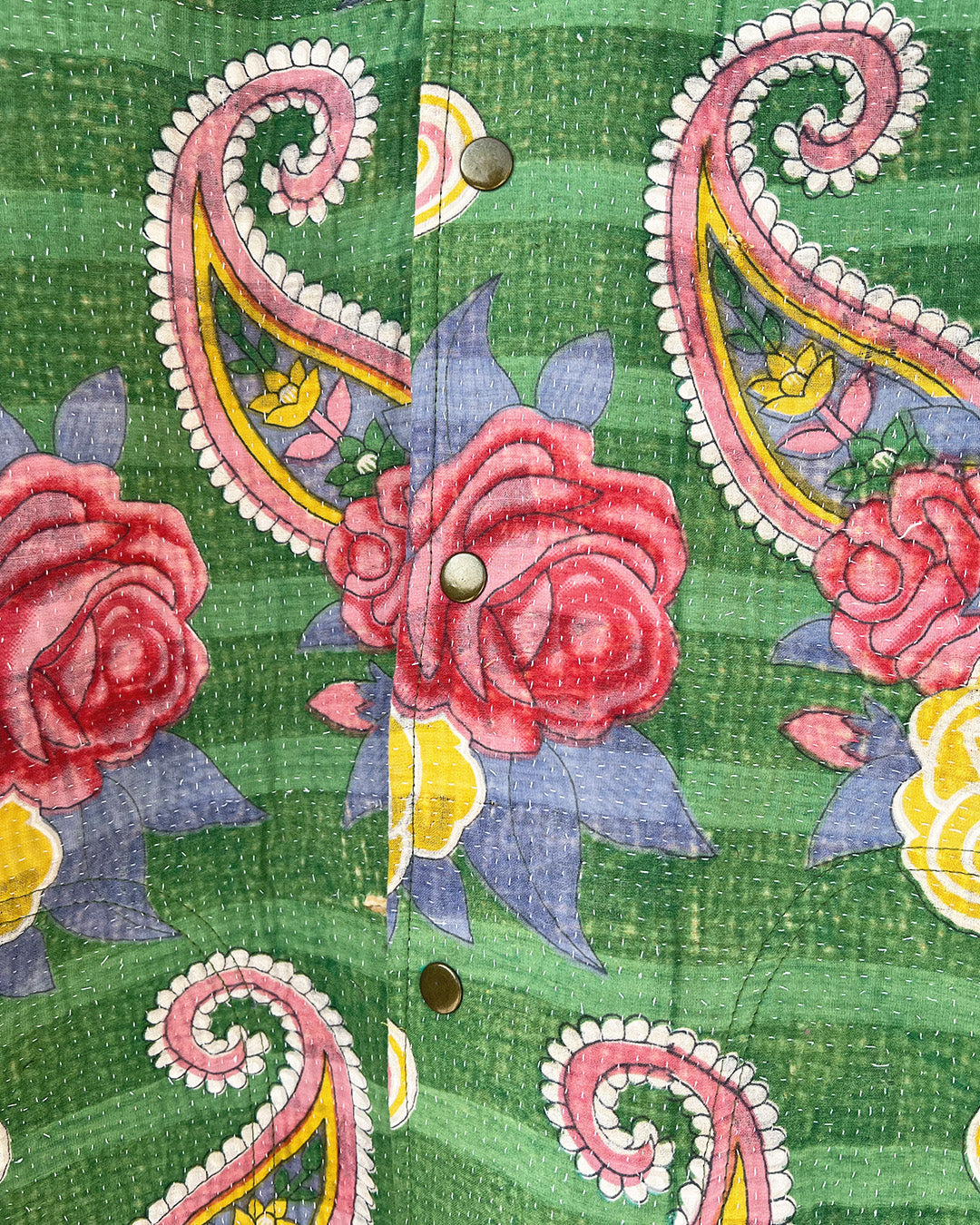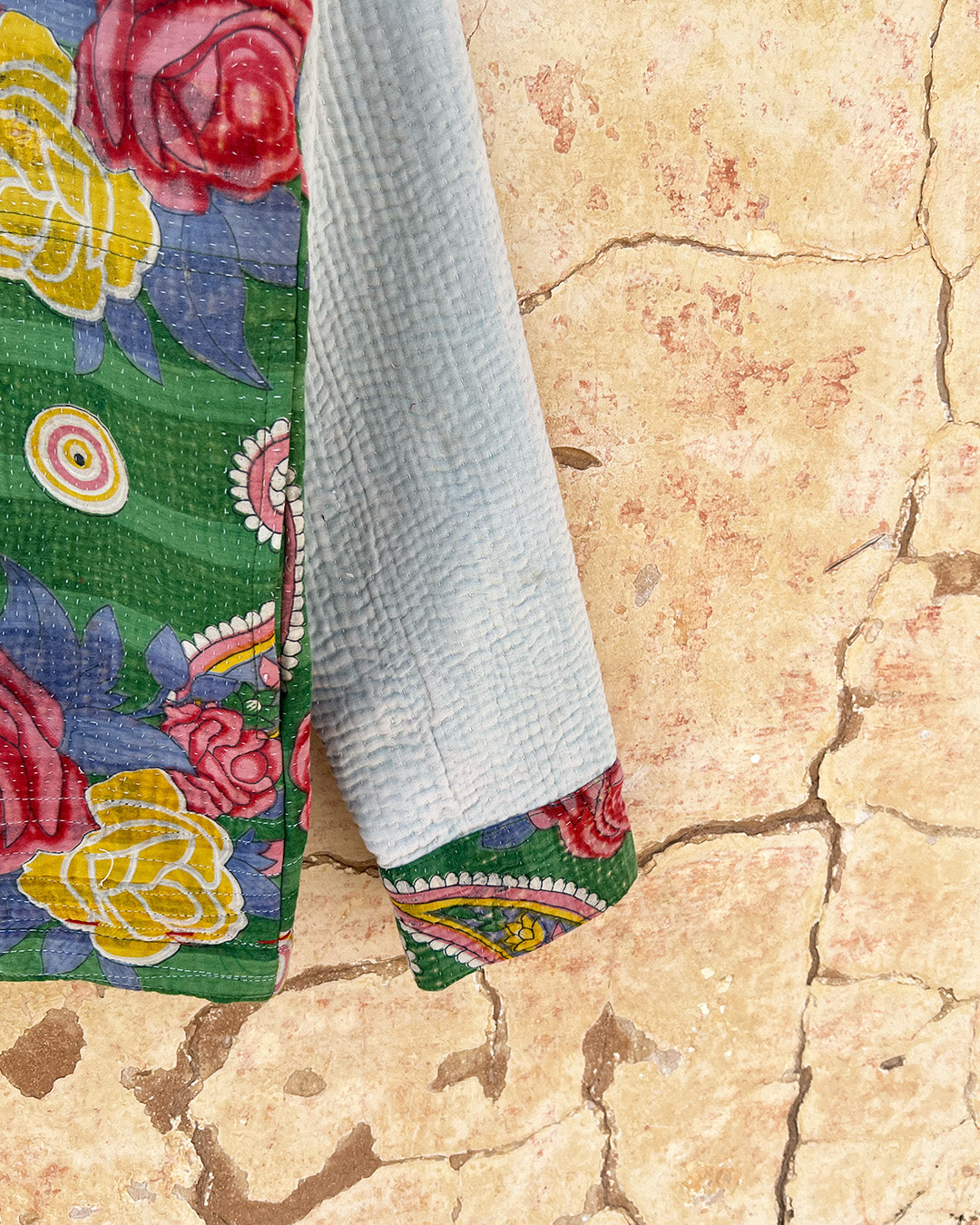 Kantha quilts are crafted from repurposed saris and fabrics and feature repairs, darning, and patchwork. These unique details not only add character but ensure durable, one-of-a-kind garments with a rich up-cycling heritage. We embrace the distressed patches alongside the intricate stitch work in the most unlikely colours.