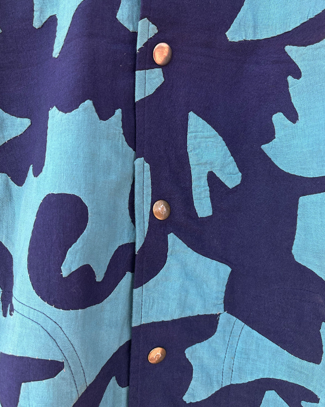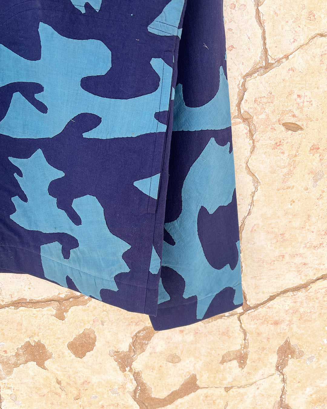 Garments of the Appliqué Collection are made from one-of-a kind vintage appliquéd and hand embroidered bedspreads from Rajasthan. They feature repurposed fabric in smaller motifs that are appliquéd across the surface of the bedspread.