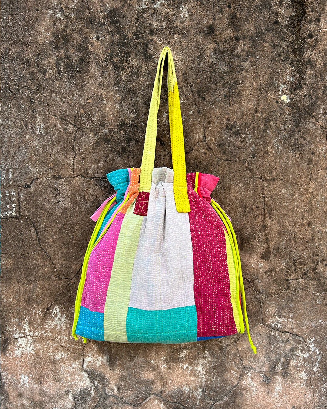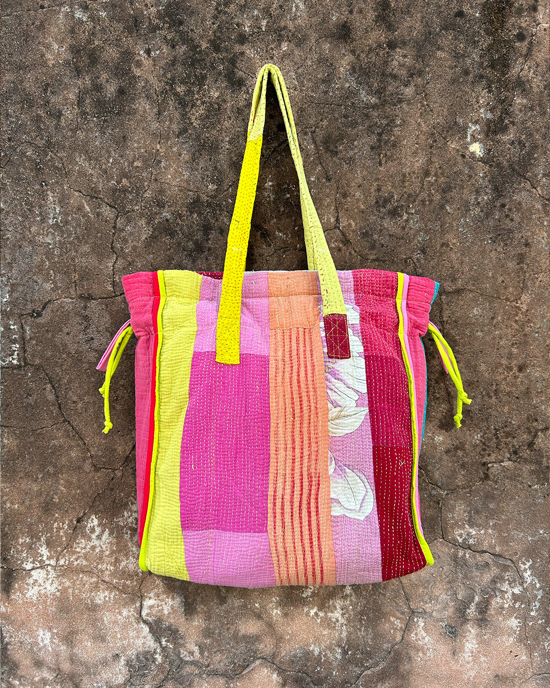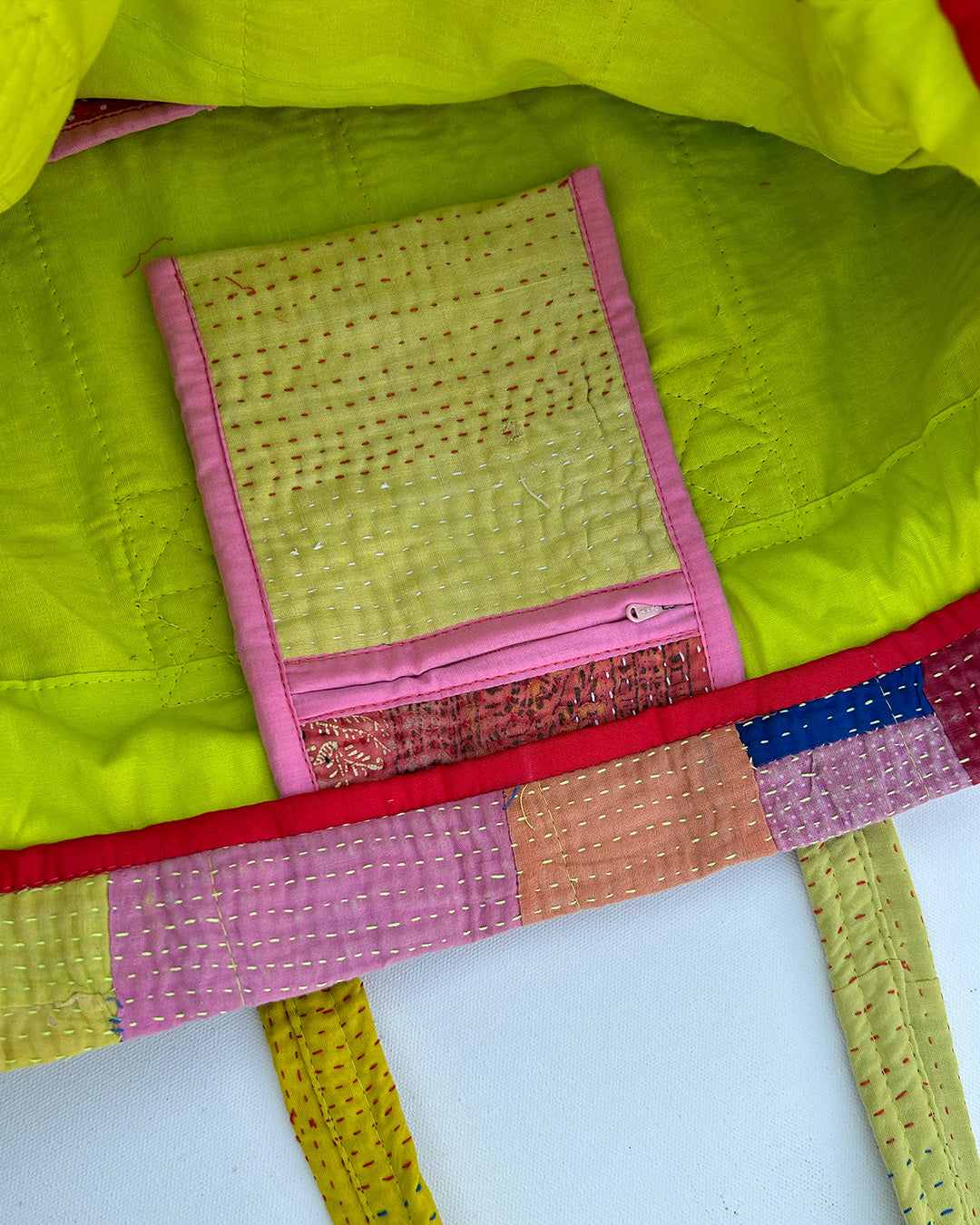 Kantha quilts are crafted from repurposed saris and fabrics and feature repairs, darning, and patchwork. These unique details not only add character but ensure durable, one-of-a-kind garments with a rich up-cycling heritage. We embrace the distressed patches alongside the intricate stitch work in the most unlikely colours.