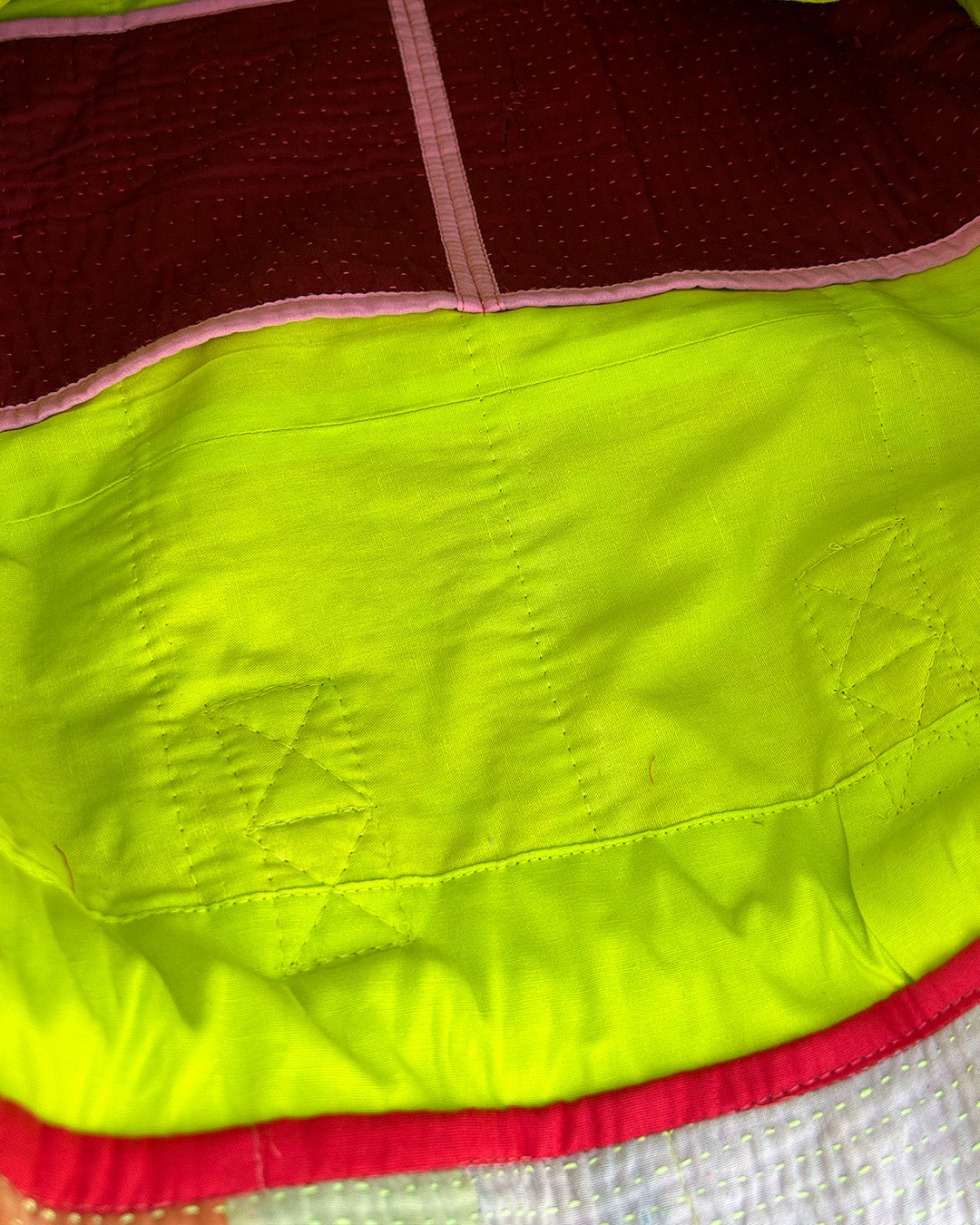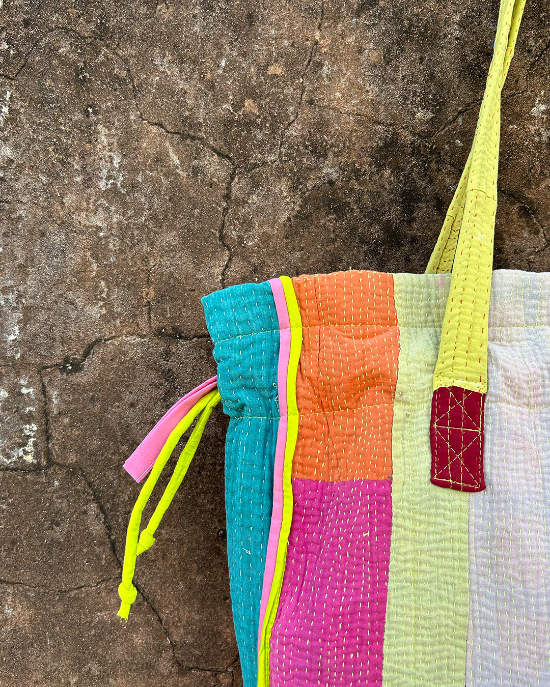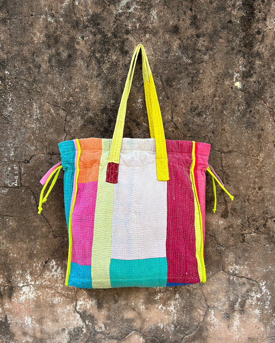 Kantha quilts are crafted from repurposed saris and fabrics and feature repairs, darning, and patchwork. These unique details not only add character but ensure durable, one-of-a-kind garments with a rich up-cycling heritage. We embrace the distressed patches alongside the intricate stitch work in the most unlikely colours.