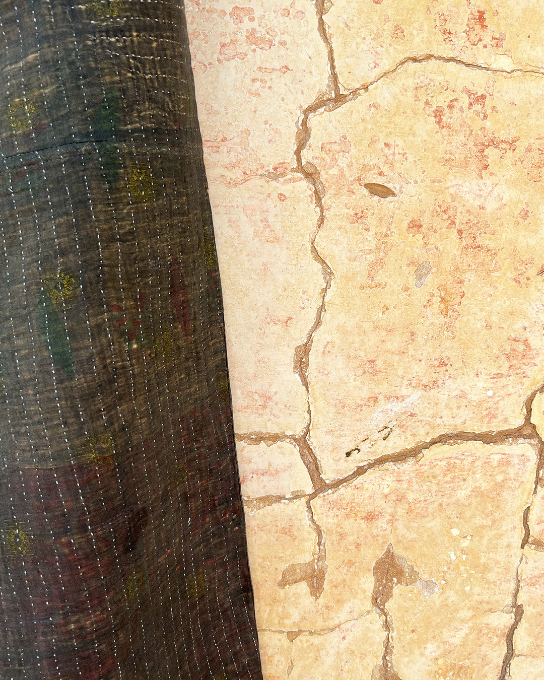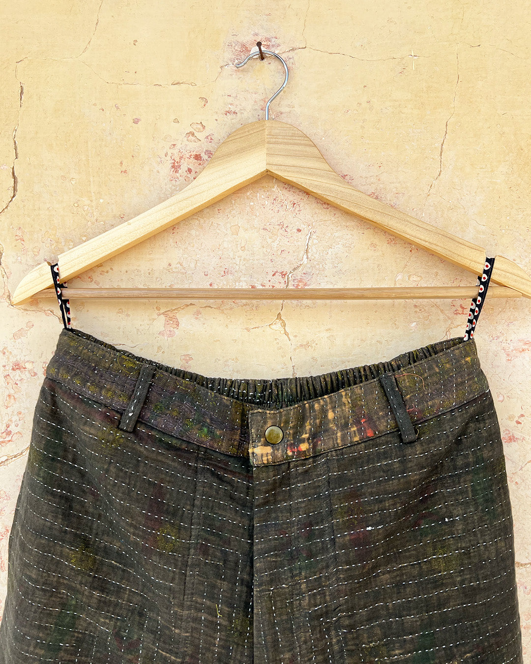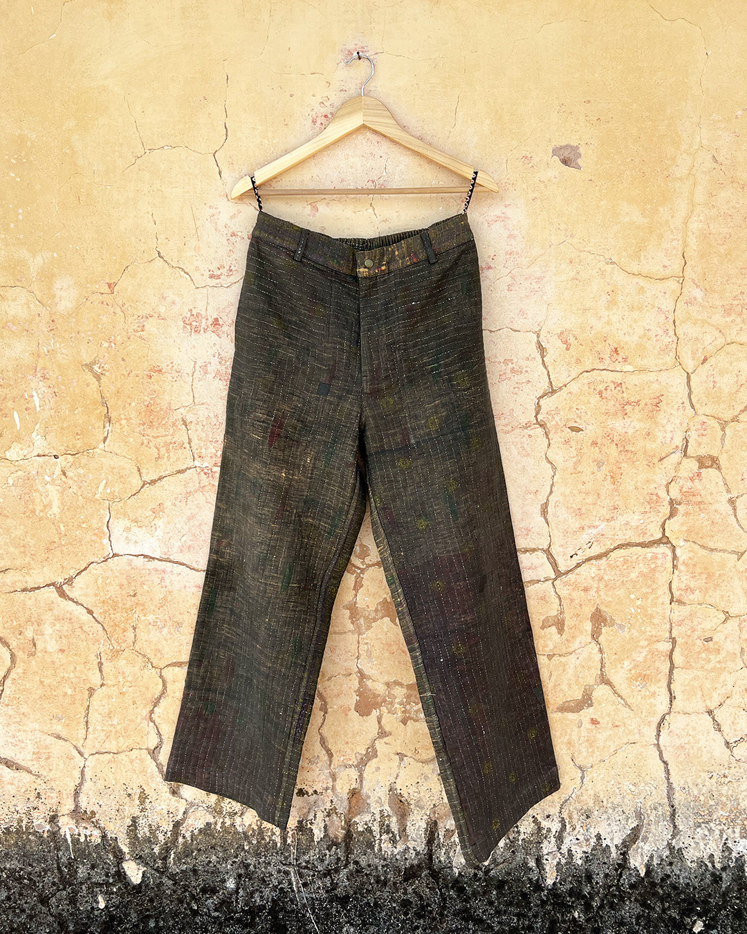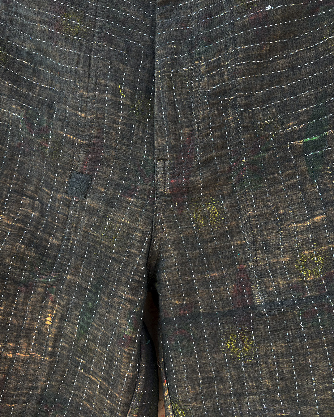 Kantha quilts are crafted from repurposed saris and fabrics and feature repairs, darning, and patchwork. These unique details not only add character but ensure durable, one-of-a-kind garments with a rich up-cycling heritage. We embrace the distressed patches alongside the intricate stitch work in the most unlikely colours.