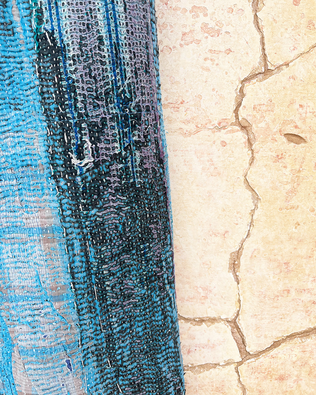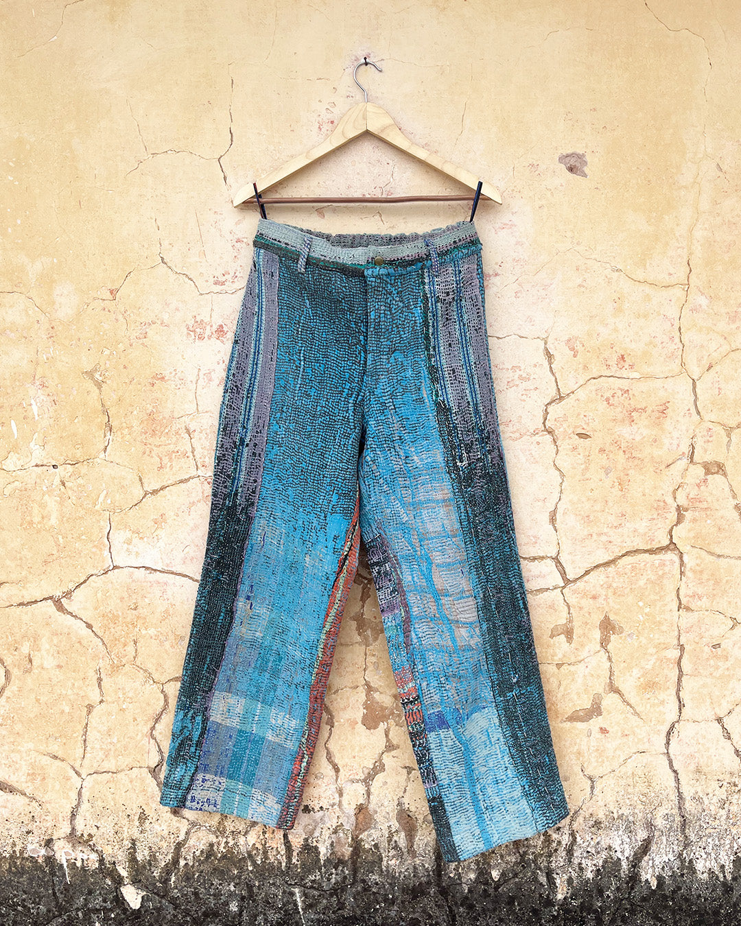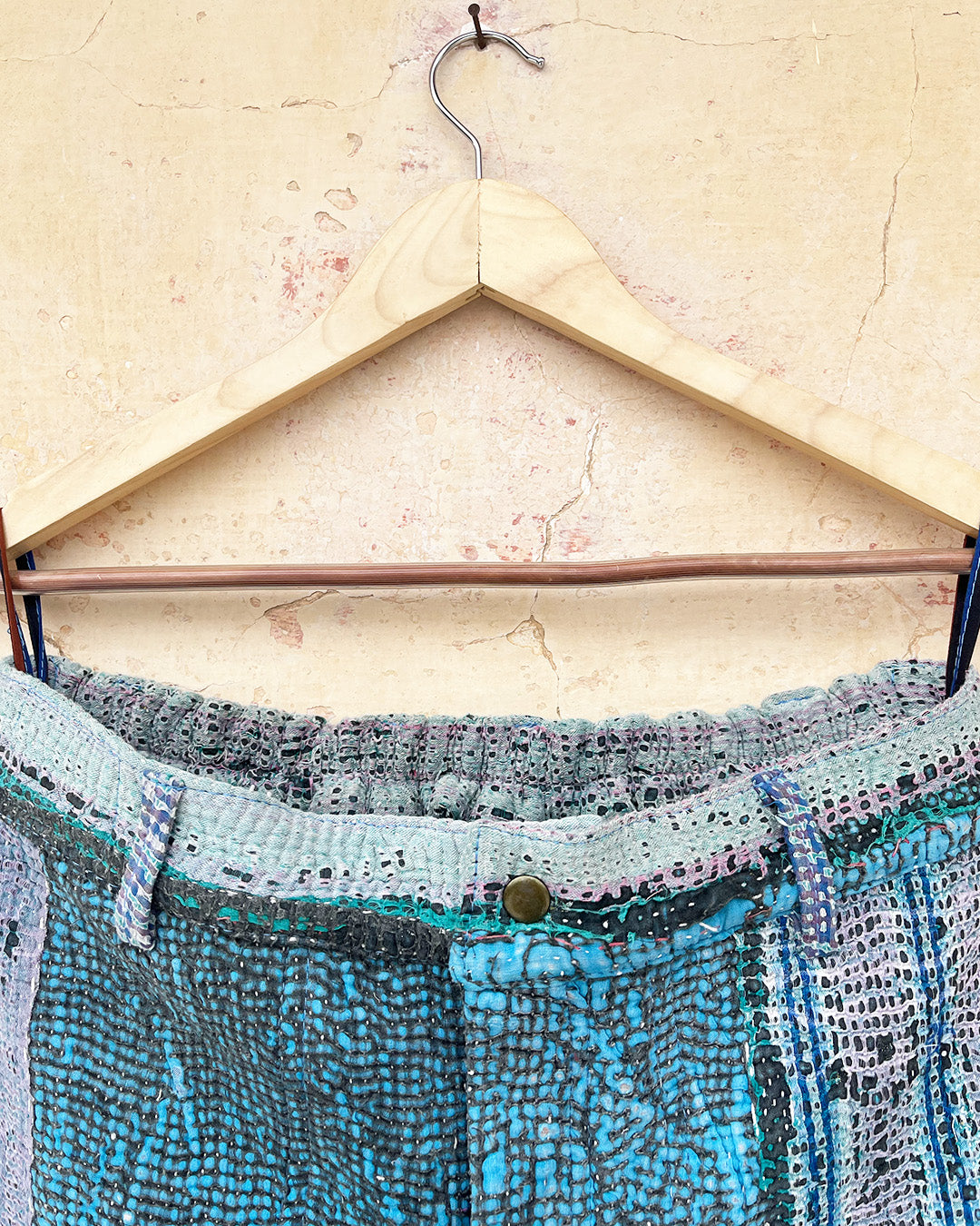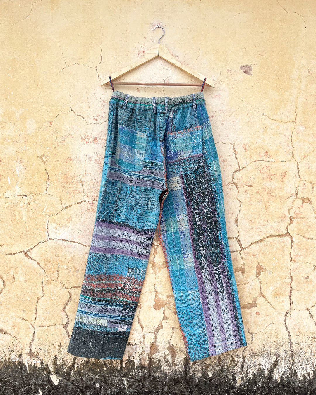 Kantha quilts are crafted from repurposed saris and fabrics and feature repairs, darning, and patchwork. These unique details not only add character but ensure durable, one-of-a-kind garments with a rich up-cycling heritage. We embrace the distressed patches alongside the intricate stitch work in the most unlikely colours.