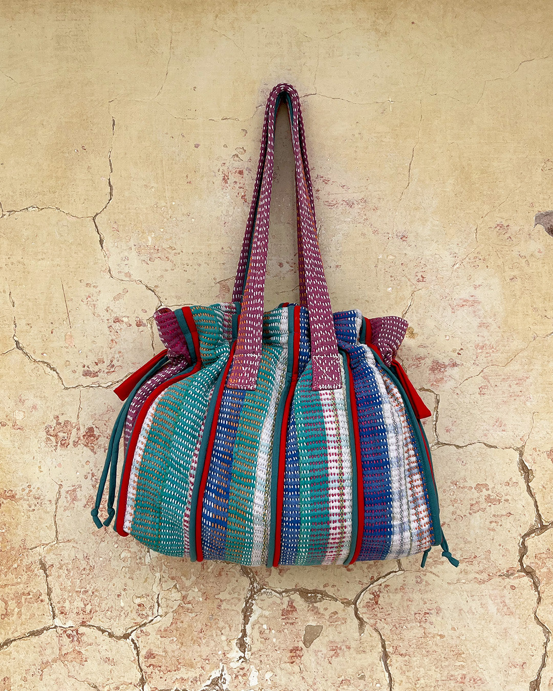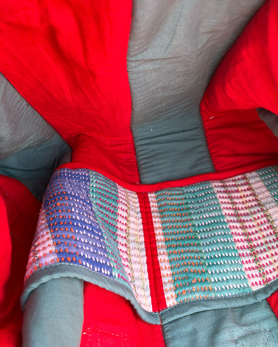 Kantha quilts are crafted from repurposed saris and fabrics and feature repairs, darning, and patchwork. These unique details not only add character but ensure durable, one-of-a-kind garments with a rich up-cycling heritage. We embrace the distressed patches alongside the intricate stitch work in the most unlikely colours.