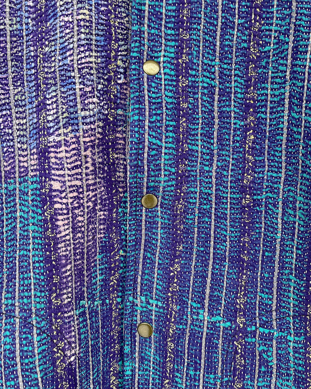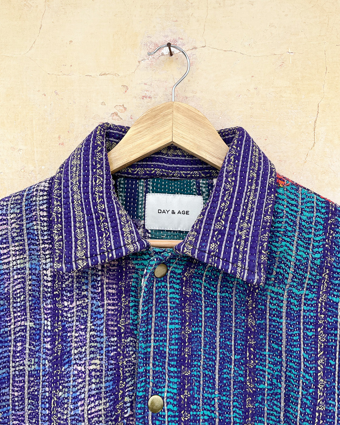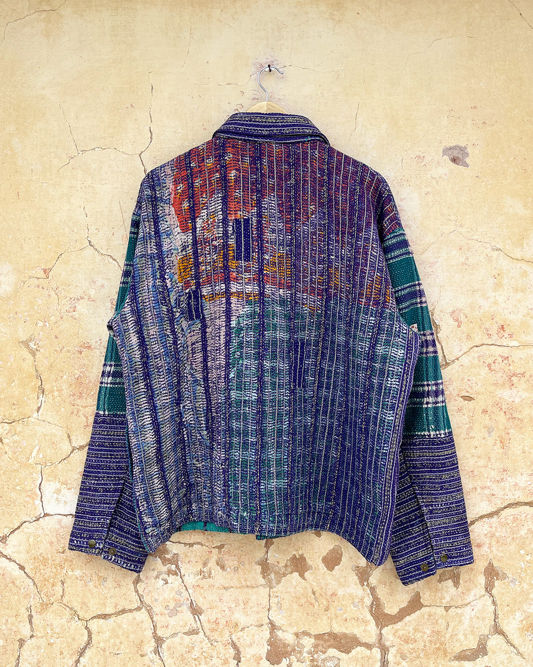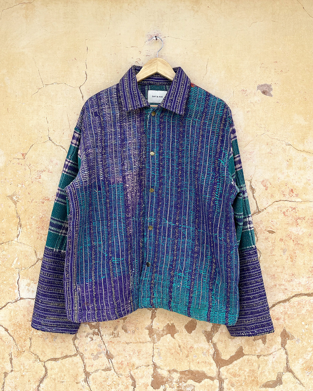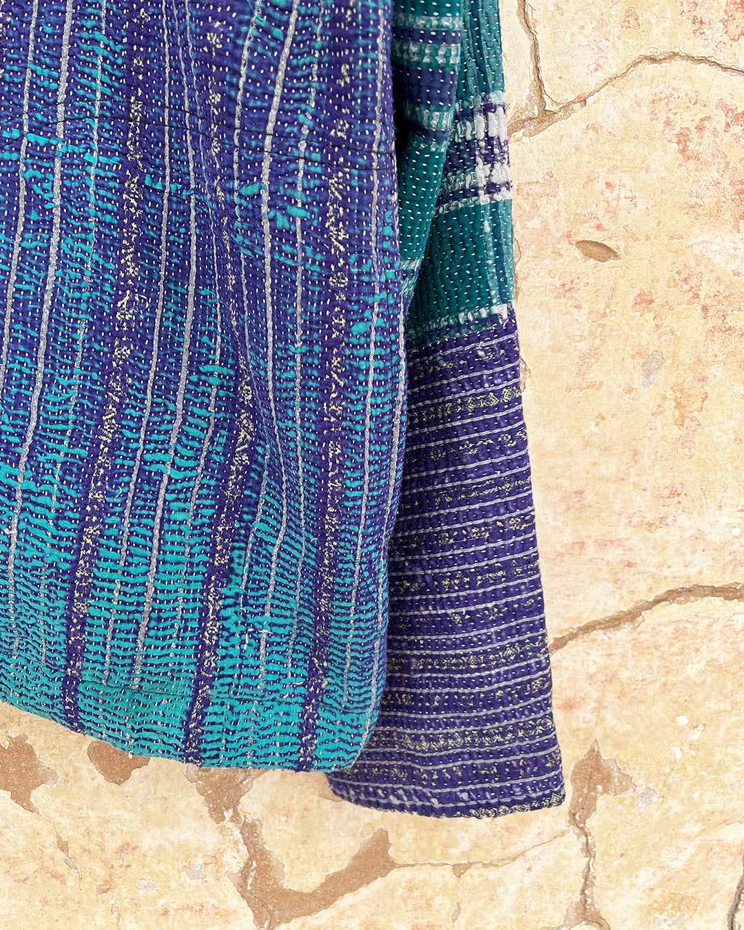 Kantha quilts are crafted from repurposed saris and fabrics and feature repairs, darning, and patchwork. These unique details not only add character but ensure durable, one-of-a-kind garments with a rich up-cycling heritage. We embrace the distressed patches alongside the intricate stitch work in the most unlikely colours.