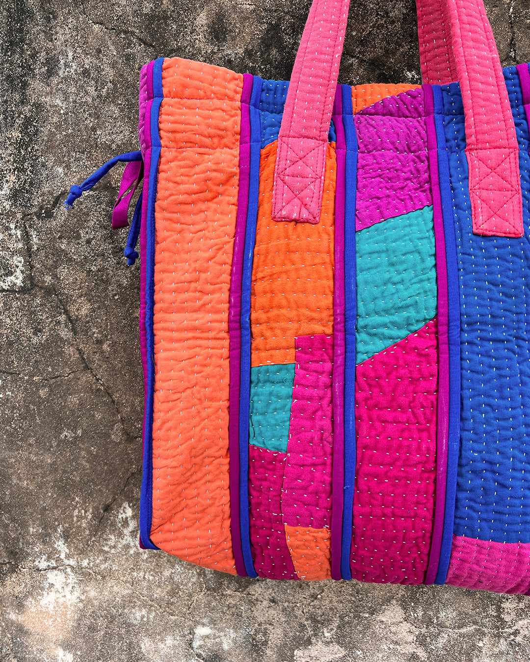 Kantha quilts are crafted from repurposed saris and fabrics and feature repairs, darning, and patchwork. These unique details not only add character but ensure durable, one-of-a-kind garments with a rich up-cycling heritage. We embrace the distressed patches alongside the intricate stitch work in the most unlikely colours.