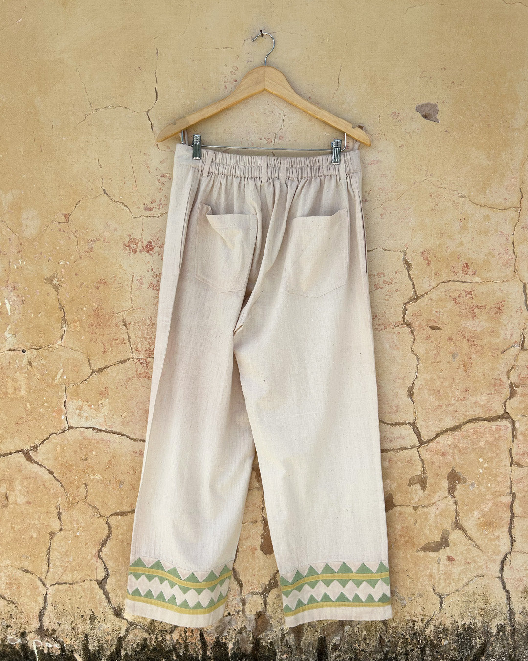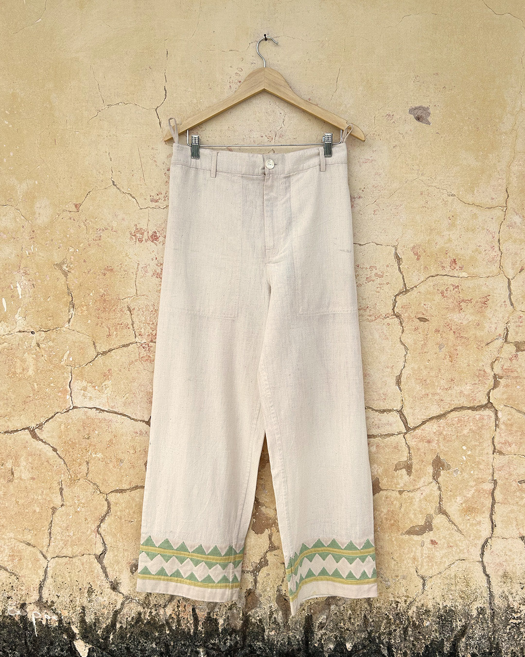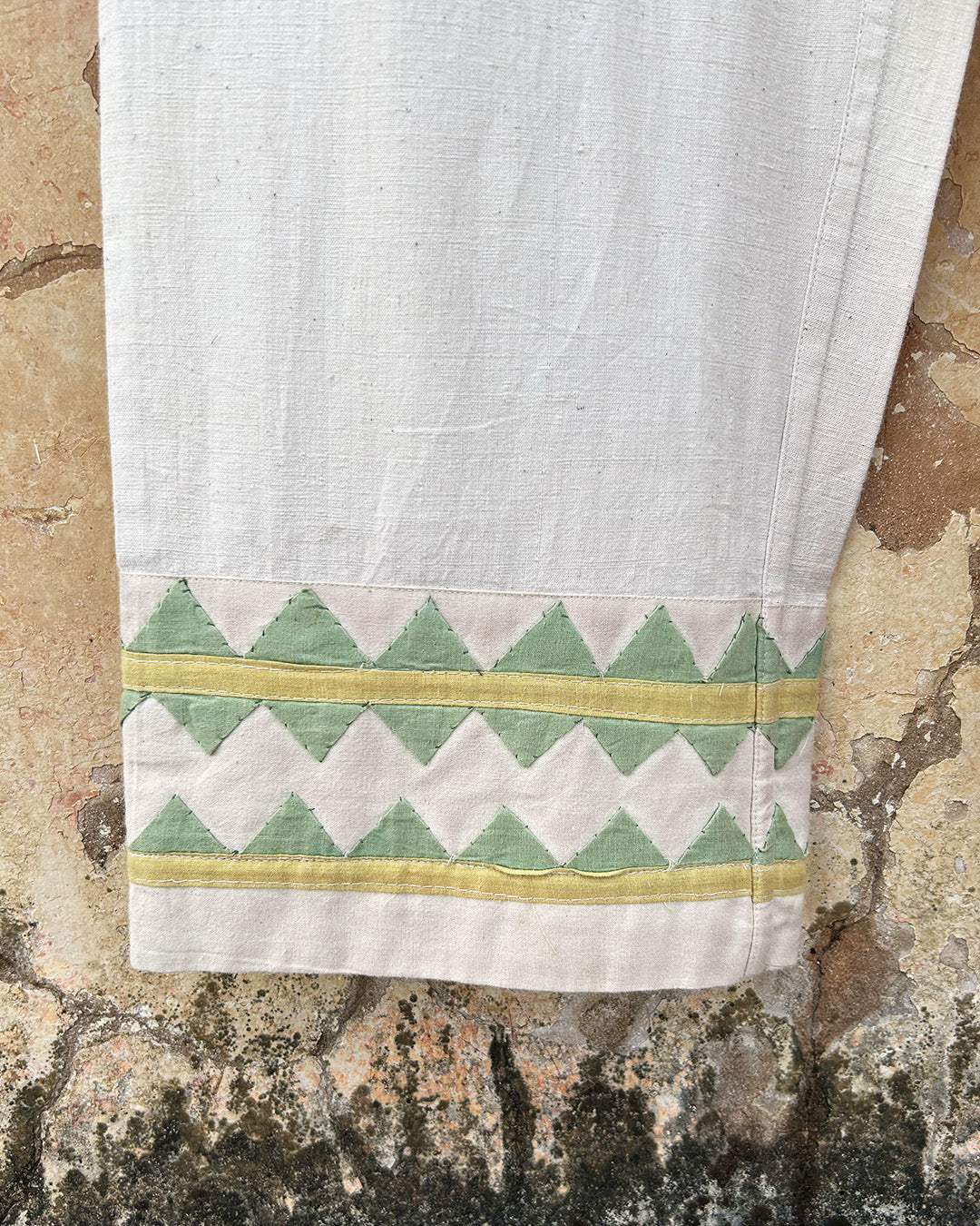 Garments of the Appliqué Collection are made from one-of-a kind vintage appliquéd and hand embroidered bedspreads from Rajasthan. They feature repurposed fabric in smaller motifs that are appliquéd across the surface of the bedspread.