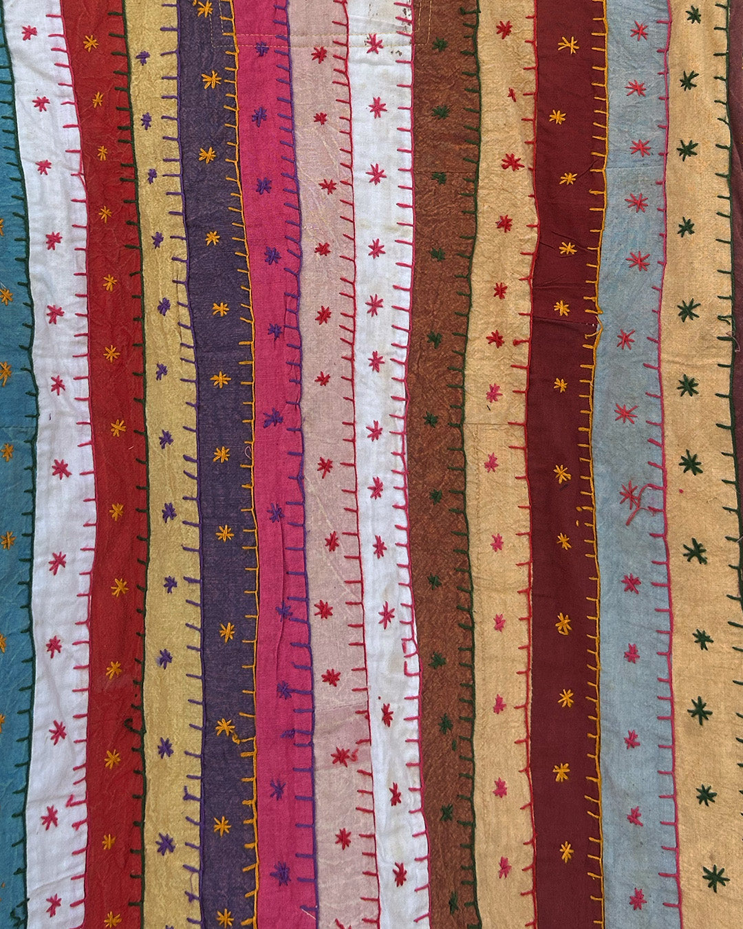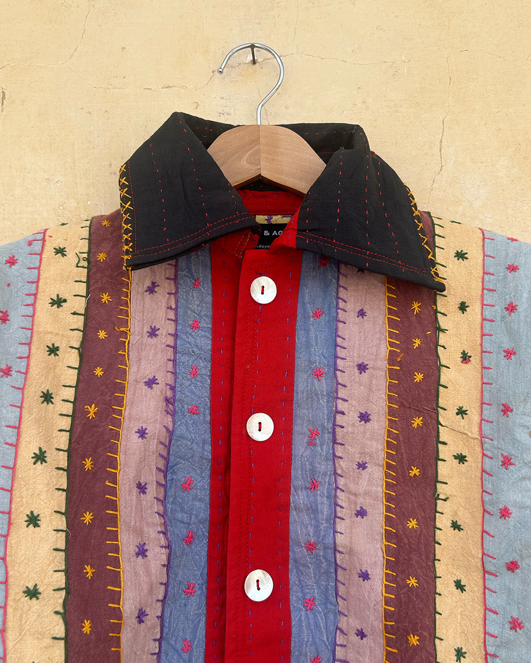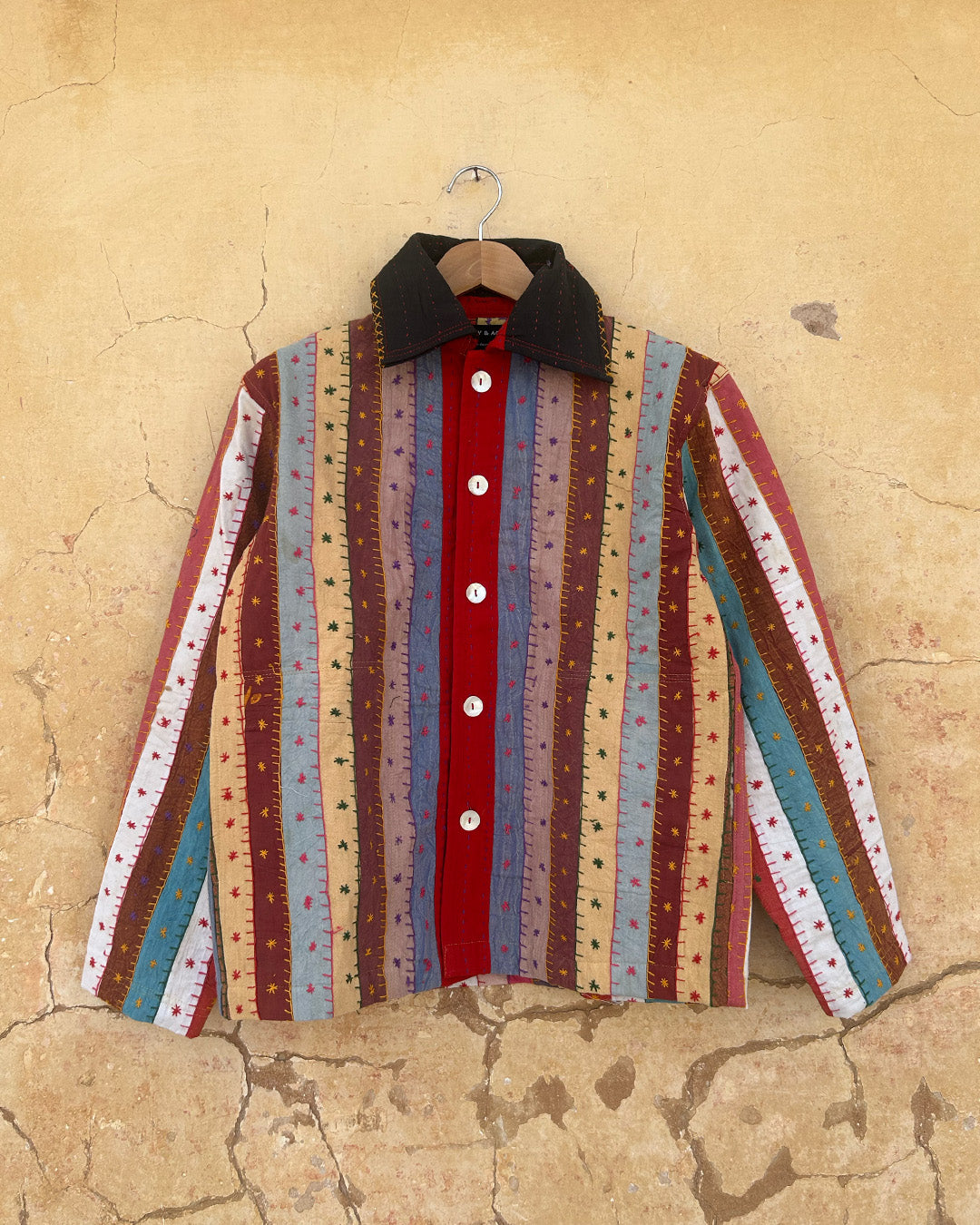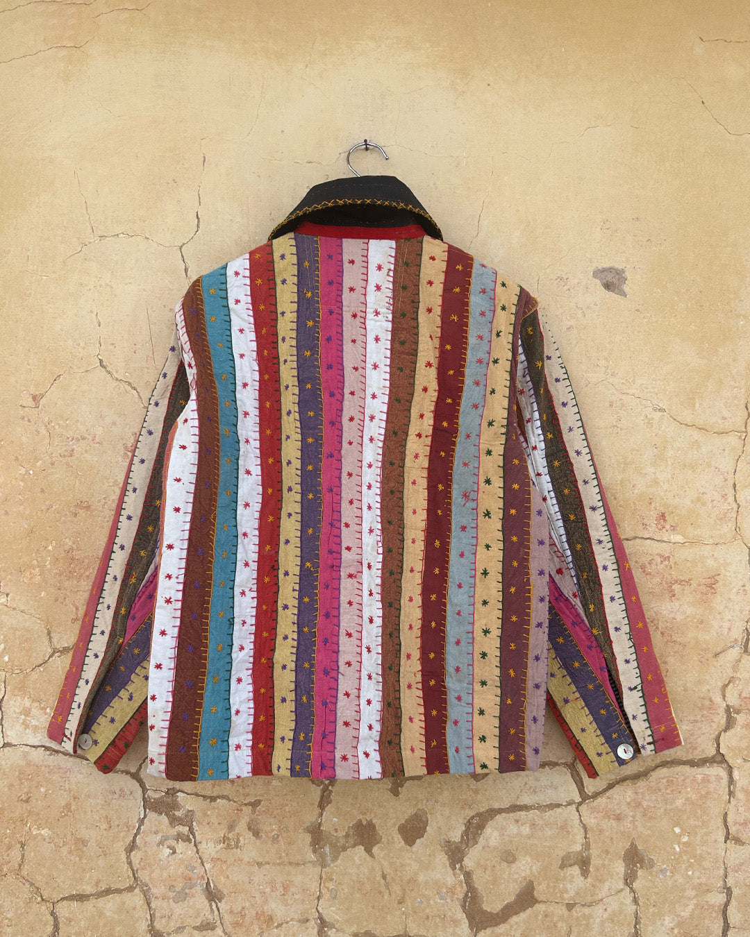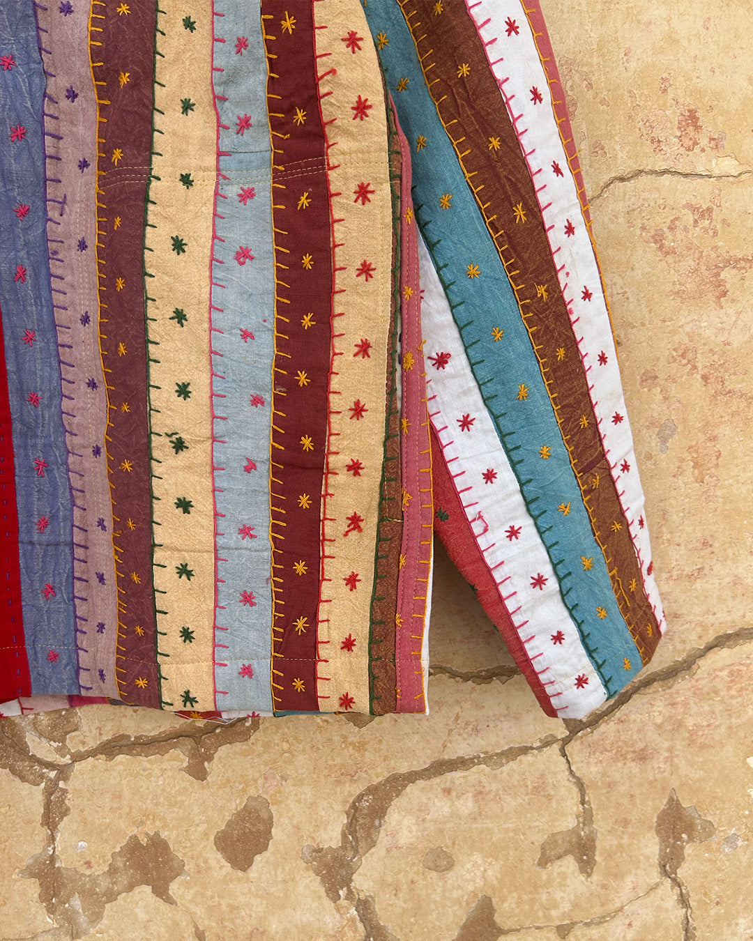 Garments of the Parallels Collection are made from one-of-a kind vintage patchwork bedspreads from Rajasthan. They feature multicolour strips and shapes patched together using blanket stitch and adorned with hand embroidered star-like motifs.