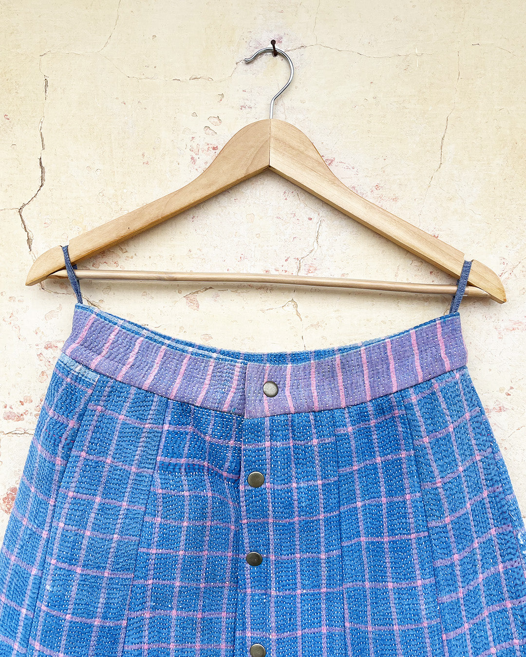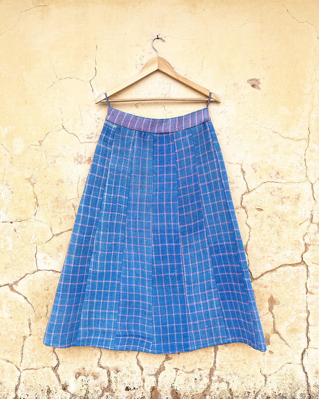 Kantha quilts are crafted from repurposed saris and fabrics and feature repairs, darning, and patchwork. These unique details not only add character but ensure durable, one-of-a-kind garments with a rich up-cycling heritage. We embrace the distressed patches alongside the intricate stitch work in the most unlikely colours.
