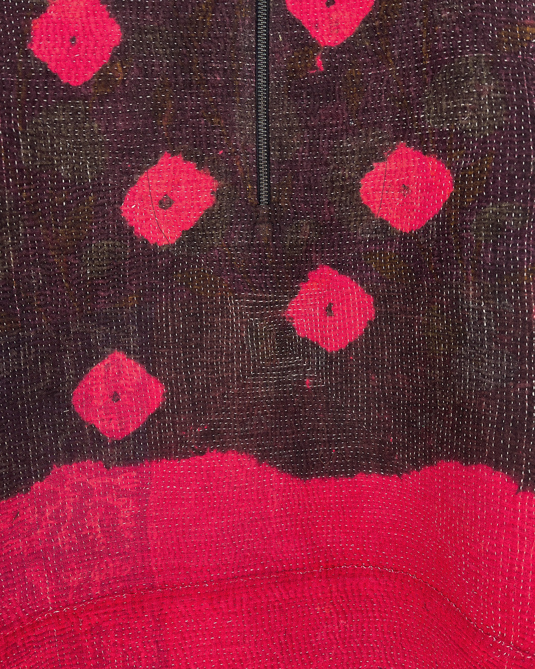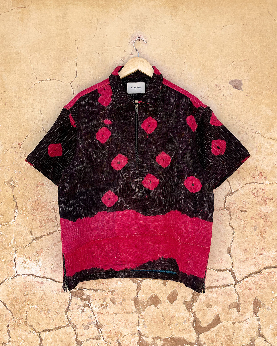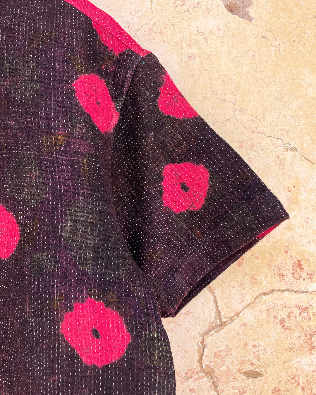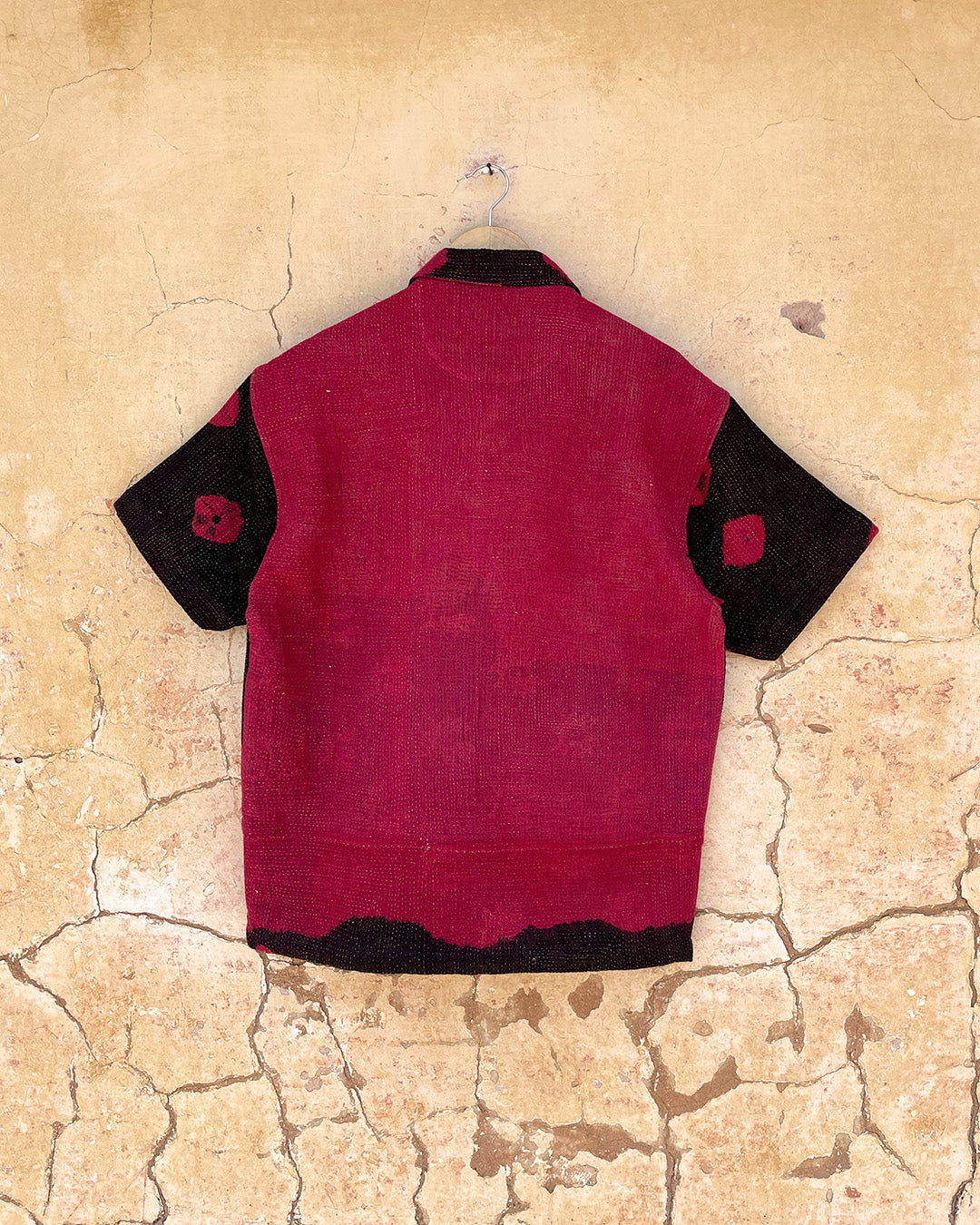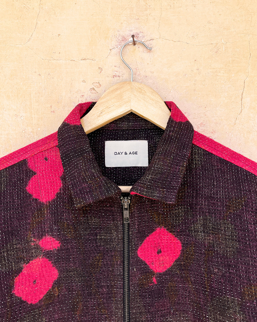 Kantha quilts are crafted from repurposed saris and fabrics and feature repairs, darning, and patchwork. These unique details not only add character but ensure durable, one-of-a-kind garments with a rich up-cycling heritage. We embrace the distressed patches alongside the intricate stitch work in the most unlikely colours.
