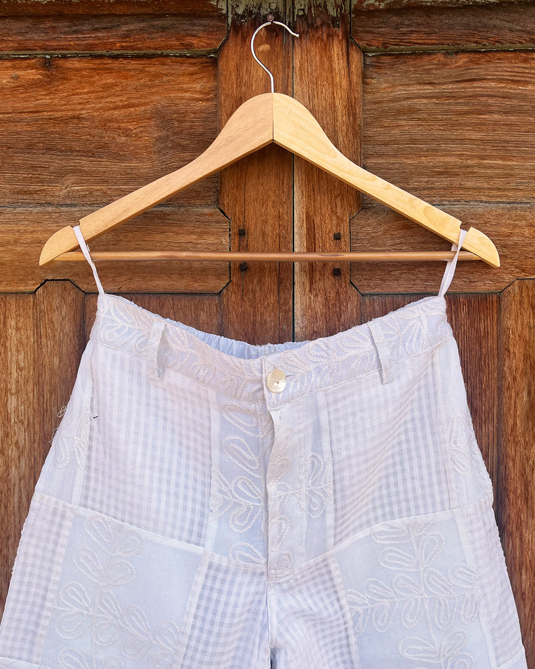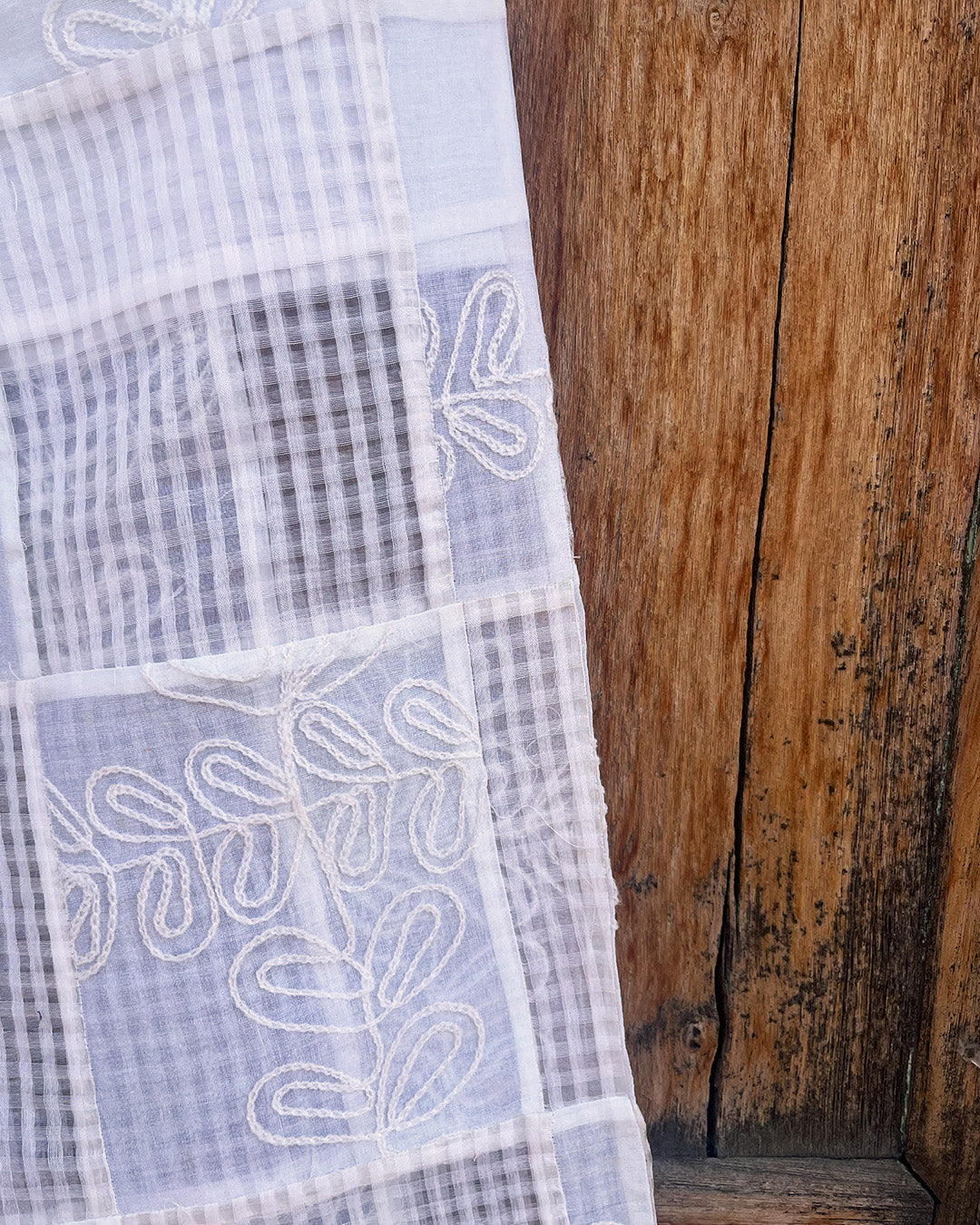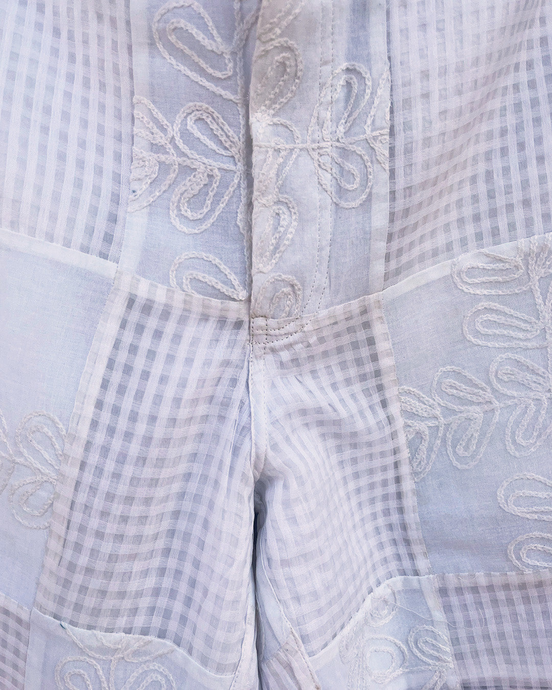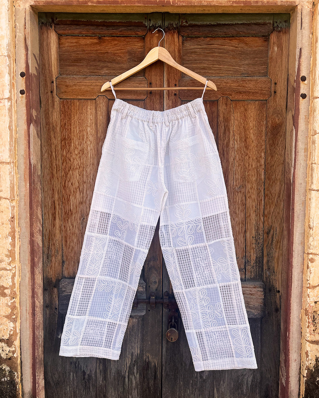 Transparency is embraced through unlined construction, with details like paneling, patchwork, and pleating adding visual interest without extra weight. Vintage embroidered bedspreads are repurposed and combined with mulmul and cotton-linen to create subtle contrasts in texture and tone while evoking a sense of history reworked into the present.