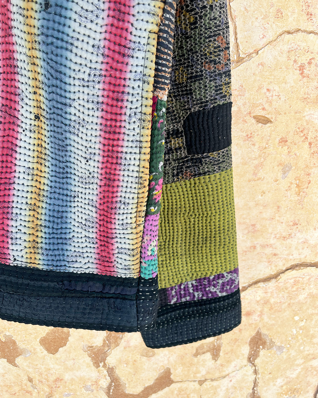 Neither This Nor That is an exploration of identities. It questions the notion of purity through mythical hybrid creatures. Whether it is the yali that it part tiger and part elephant, or the makara, a creature that defies the land and the sea, the forms in this collection lie between worlds. Once seen as grotesque, they now echo something more human than ever — our own plural, ever-shifting selves. Kantha quilts are synonymous with this idea, each one made up of many layers of fabric. Neither This Nor That thrives in this ambiguity: inhabiting the in-between and existing as many things at once.