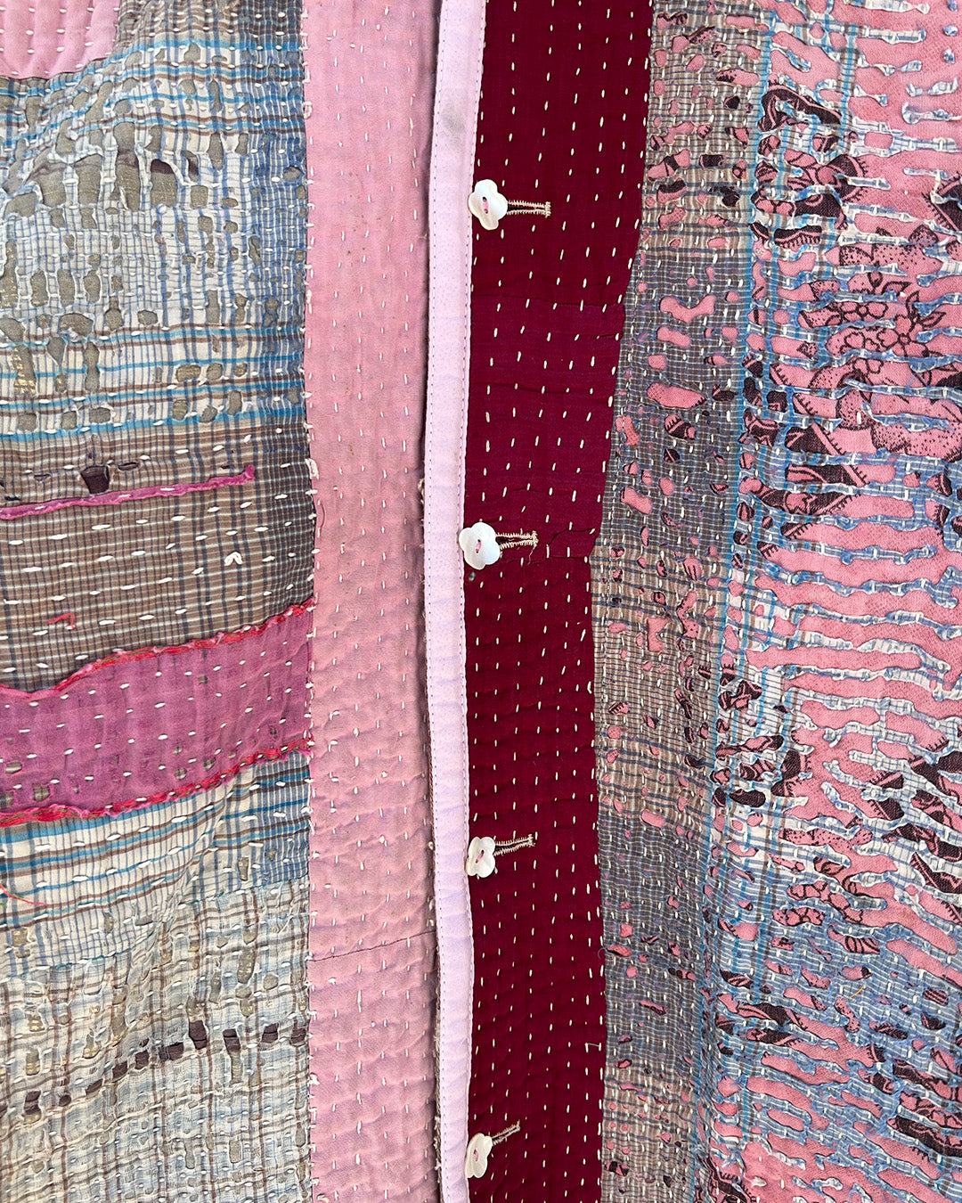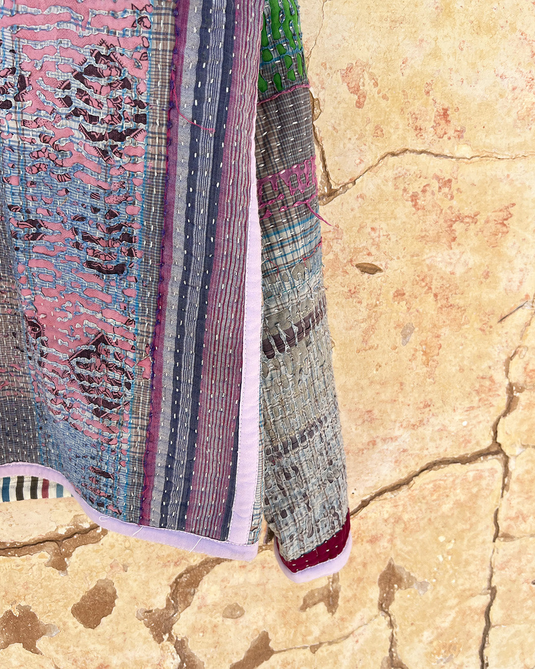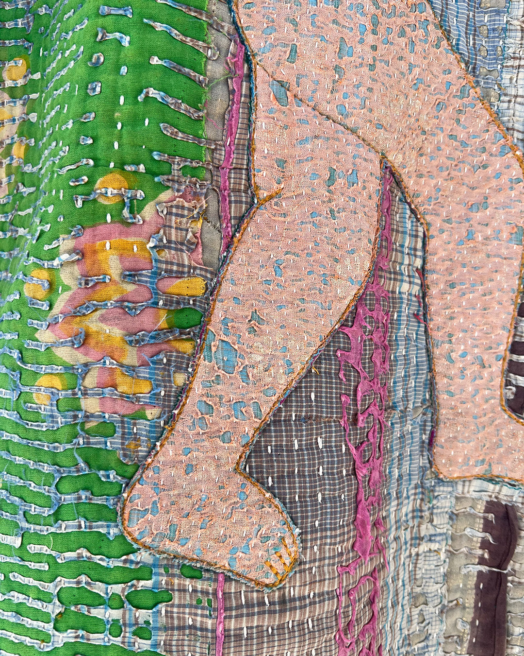 Neither This Nor That is an exploration of identities. It questions the notion of purity through mythical hybrid creatures. Whether it is the yali that it part tiger and part elephant, or the makara, a creature that defies the land and the sea, the forms in this collection lie between worlds. Once seen as grotesque, they now echo something more human than ever — our own plural, ever-shifting selves. Kantha quilts are synonymous with this idea, each one made up of many layers of fabric. Neither This Nor That thrives in this ambiguity: inhabiting the in-between and existing as many things at once.
