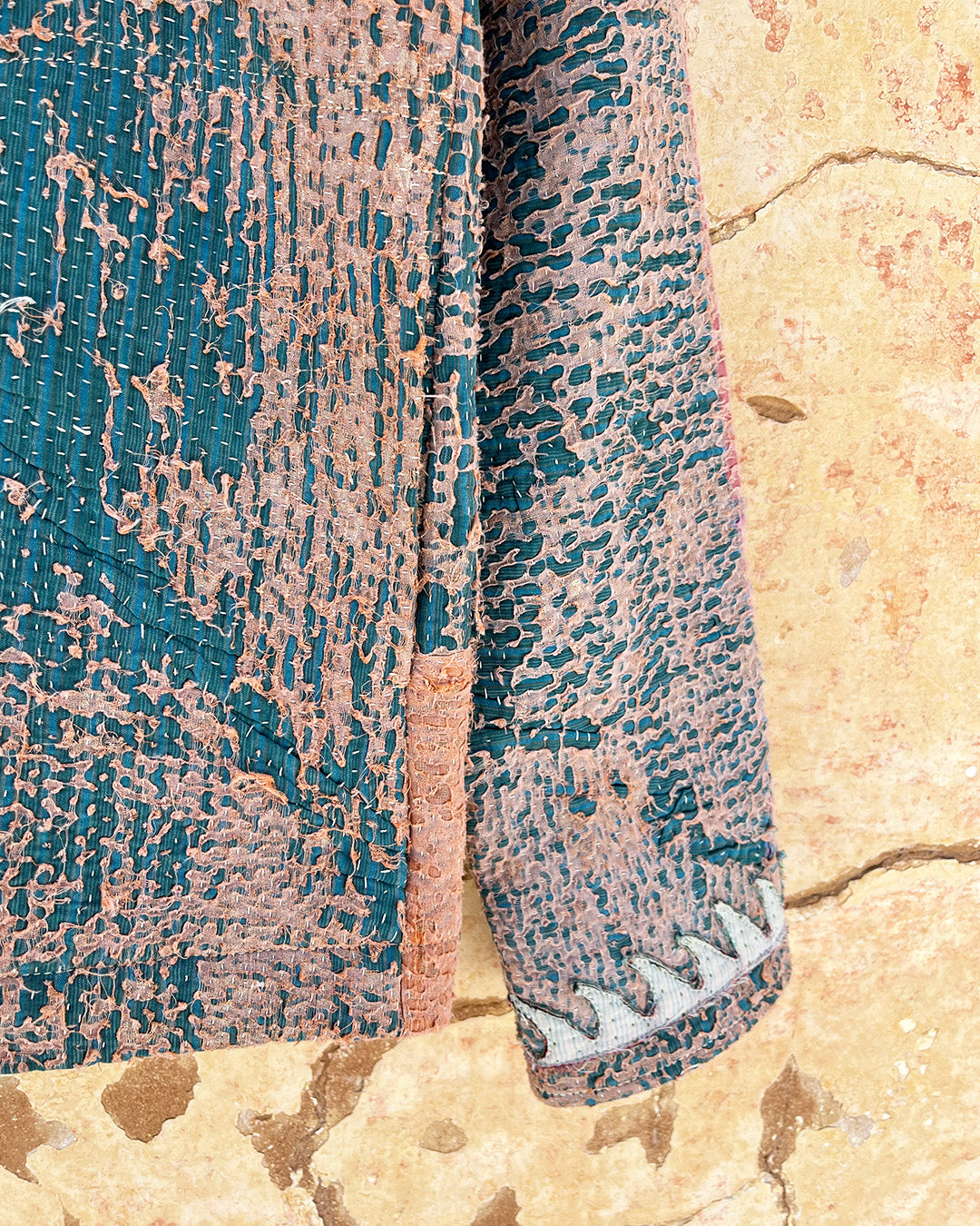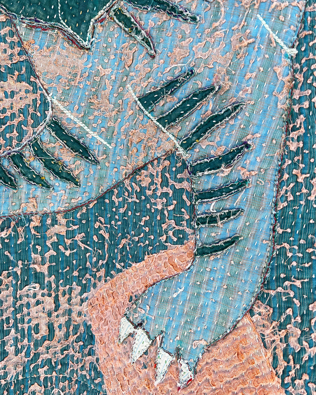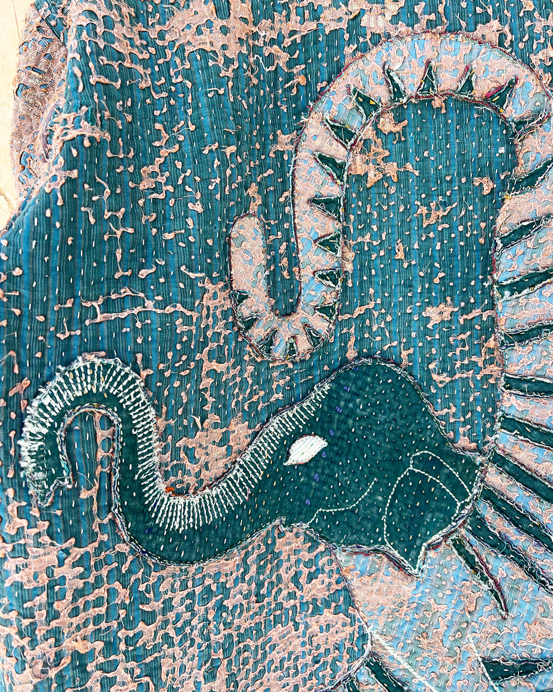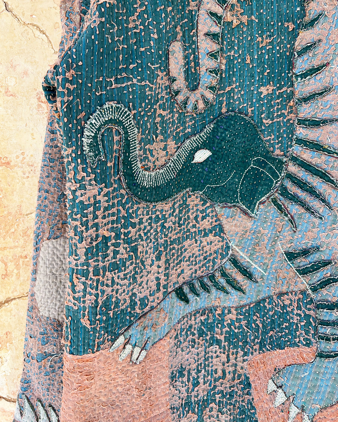 Neither This Nor That is an exploration of identities. It questions the notion of purity through mythical hybrid creatures. Whether it is the yali that it part tiger and part elephant, or the makara, a creature that defies the land and the sea, the forms in this collection lie between worlds. Once seen as grotesque, they now echo something more human than ever — our own plural, ever-shifting selves. Kantha quilts are synonymous with this idea, each one made up of many layers of fabric. Neither This Nor That thrives in this ambiguity: inhabiting the in-between and existing as many things at once.